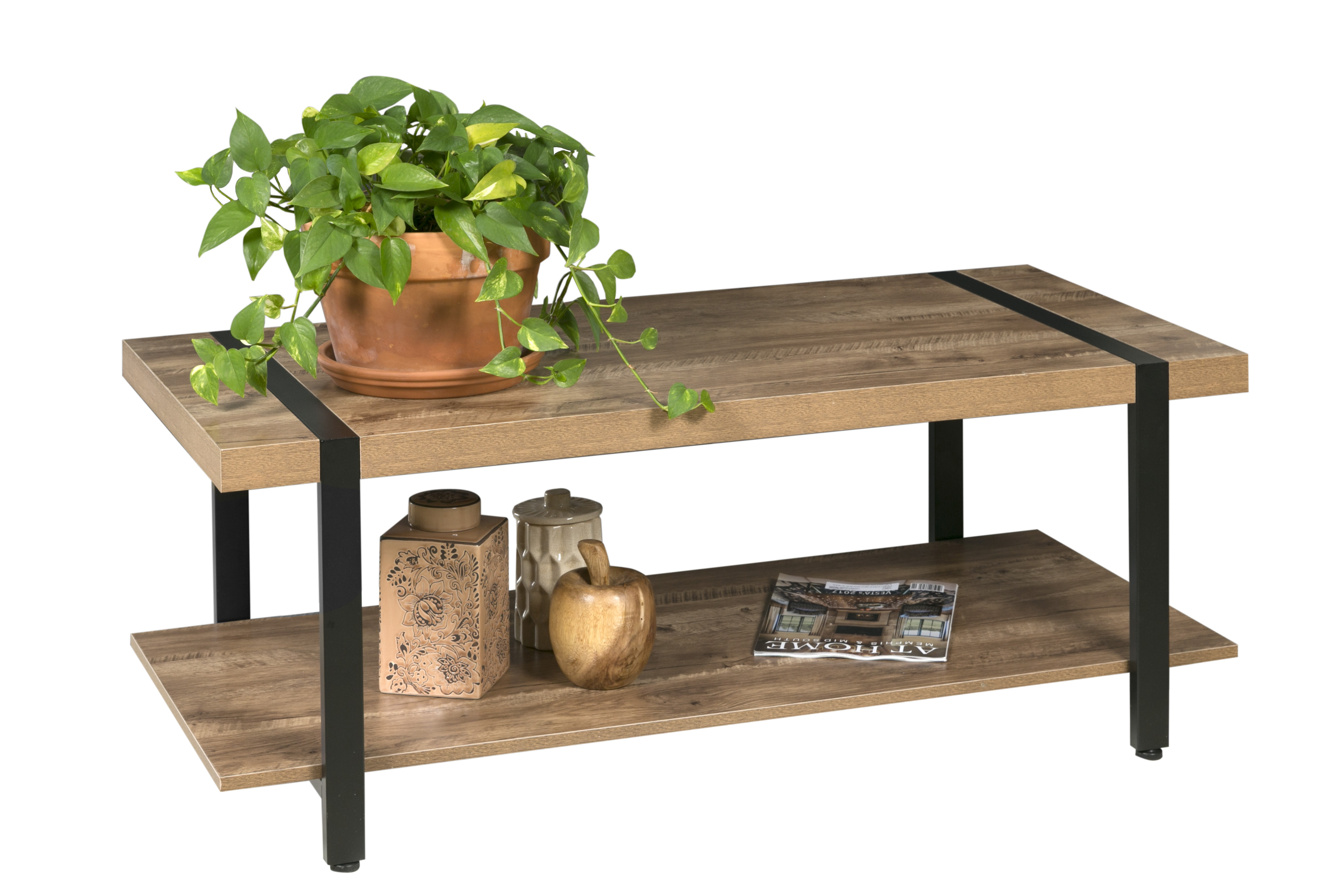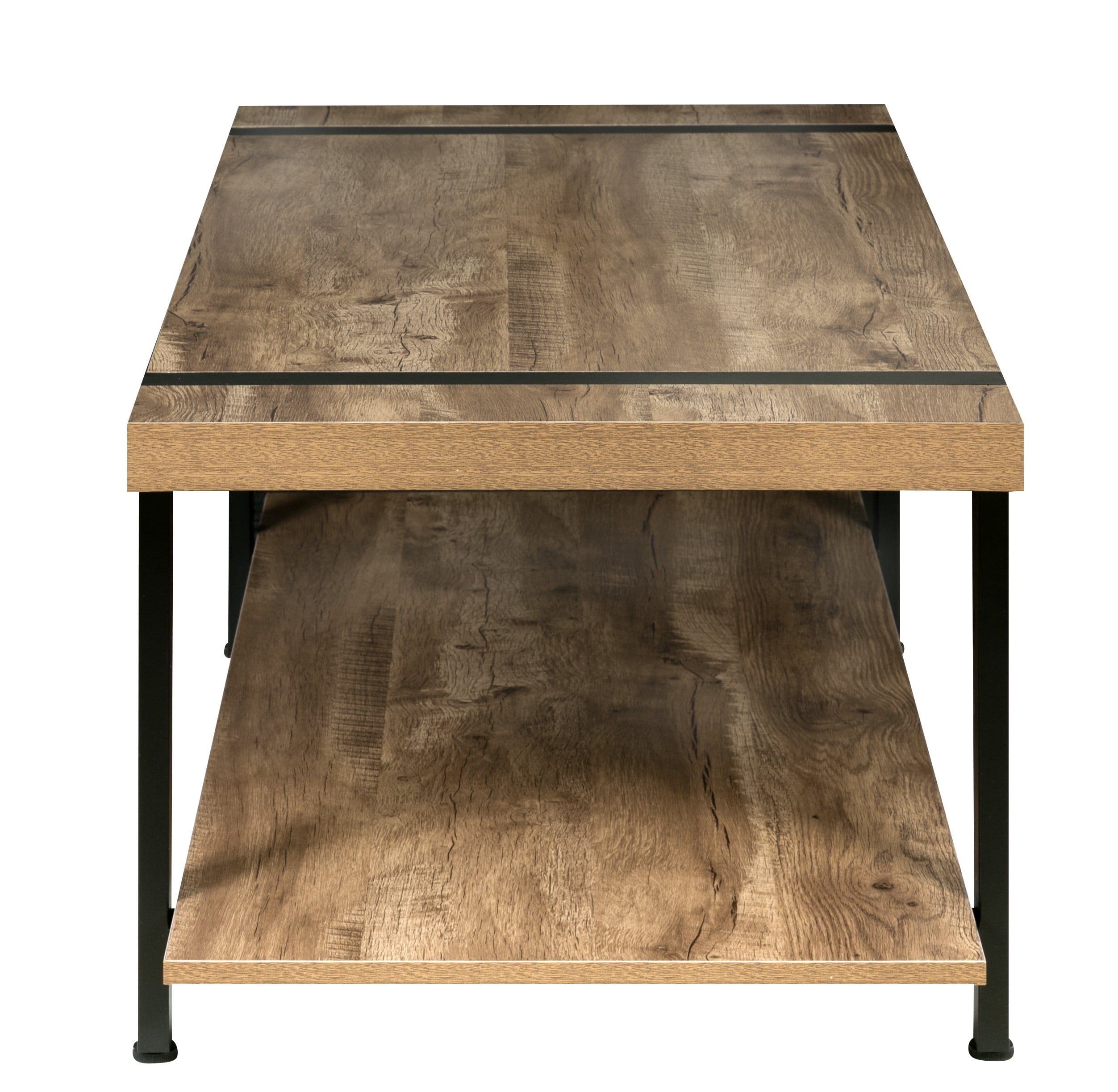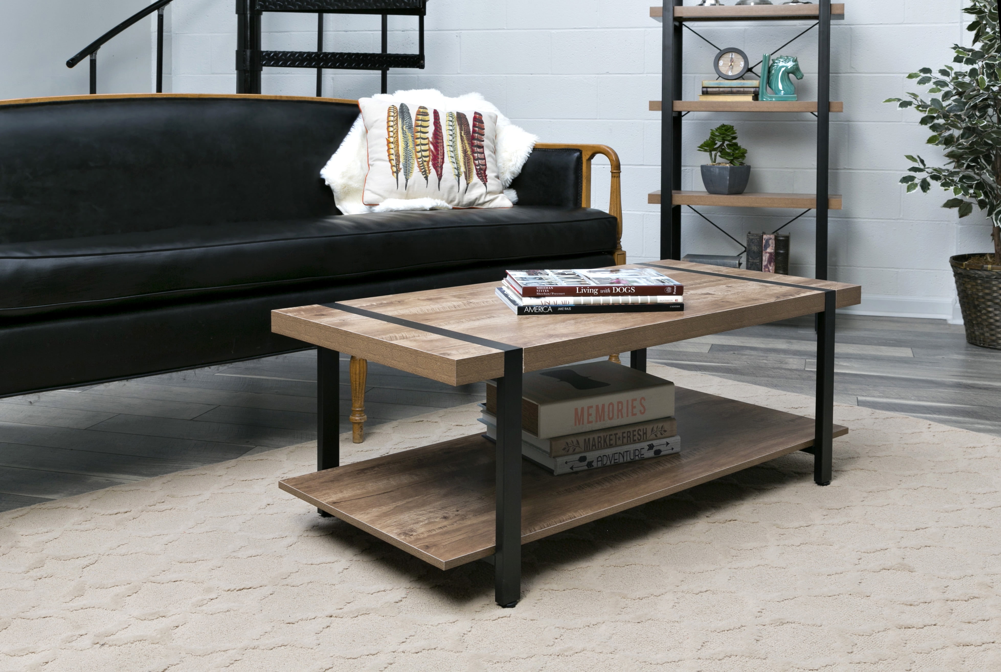 Enhance your living room with the industrial styling of this attractive coffee table from the Bourbon Foundry Collection. With a thick black steel frame and chunky wood-finished tabletop, this table offers the rustic look of work done by blacksmiths of days past. The wide bottom shelf offers plenty of storage space for books, games, or knickknacks. Rich wood finish with black steel accents: a perfect balance between rustic and contemporary Minimalist design; built with thick particle board and black steel Metal frame is inset seamlessly into the wood tabletop; adjustable feet to optimize stability Features lower shelf for storing books, newspapers, decorations Dimensions: 45.27″W x 21.65″D x 17.7″ H – 110 LB weight capacity