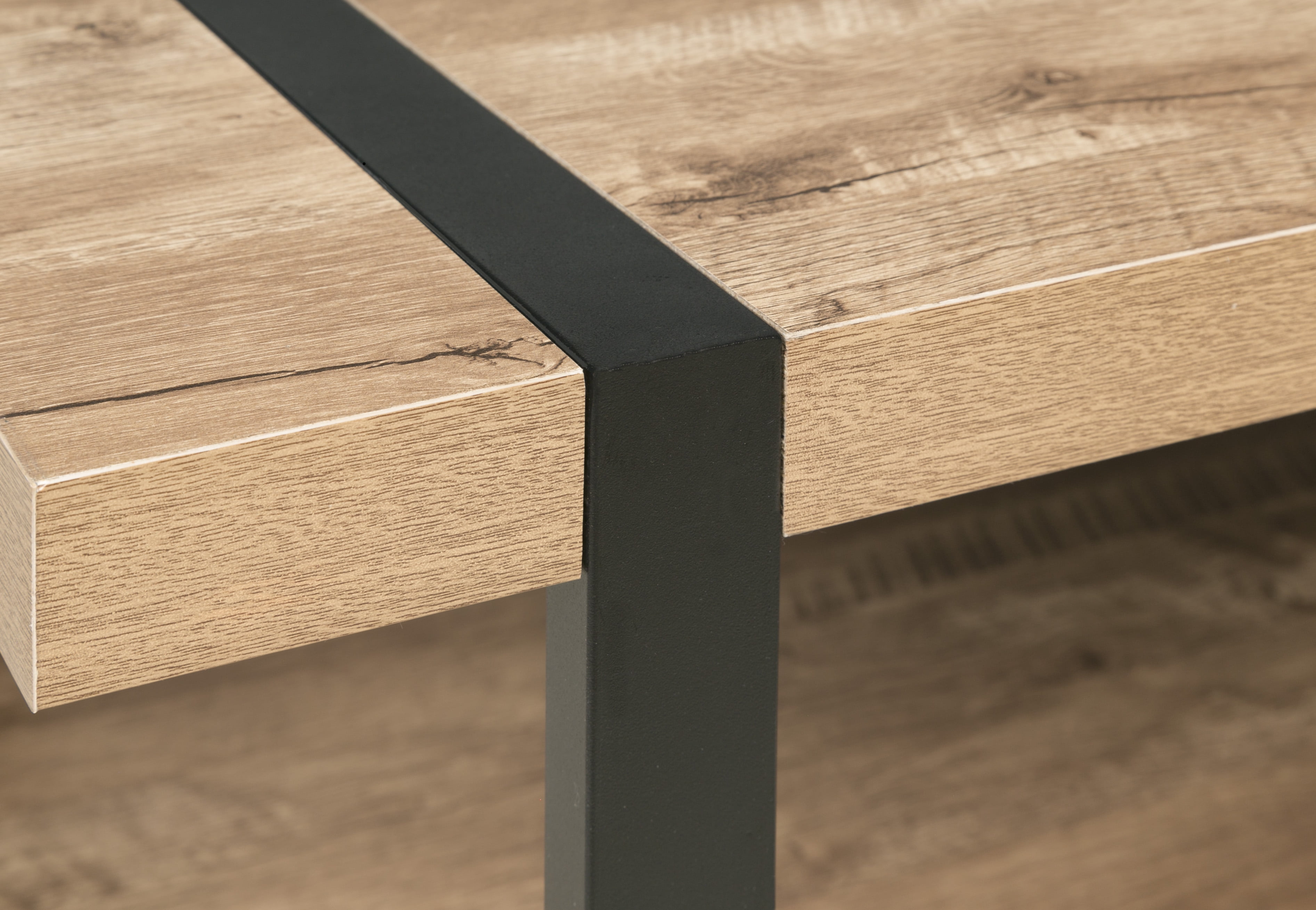 Rich wood finish with black steel accents: a perfect balance between rustic and contemporary Minimalist design; built with thick particle board and black steel Metal frame is inset seamlessly into the wood tabletop; adjustable feet to optimize stability