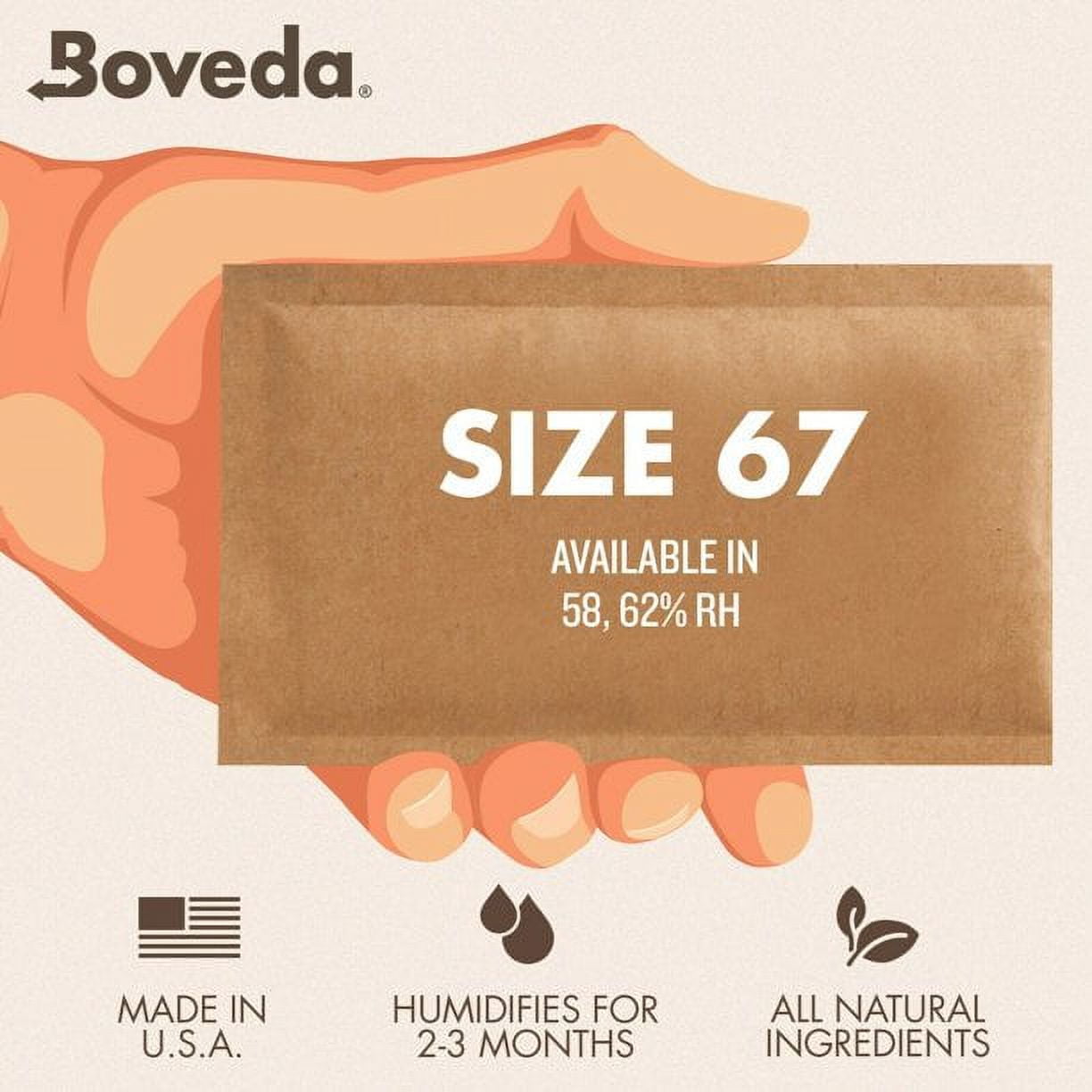 WHY THIS BOVEDA: Keep IT fresh for months! Boveda 62% is for you if you like stickier, fluffier & bouncier items or if you live in a low-humidity climate. Use one 5.25″x3.5″ Size 67 pack in a bag or airtight container to keep up to 1 pound of items fresh. NATURAL INGREDIENTS. Trusted by over 3 million people to protect & maintain items at the perfect humidity level. WE GUARANTEE QUALITY! If you’re not 100% satisfied, reach out for a full refund for up to 1 year. HOW BOVEDA WORKS: Boveda 62% RH keeps items fresh by stabilizing the humidity inside your airtight container. If the air inside your container is too moist, Boveda absorbs that moisture. If it’s too dry, Boveda releases moisture into your container to bring what’s inside back to life. ADD A BOVEDA PACK RIGHT AWAY TO EVERY BAG OF NEW ITEMS TO KEEP THEM FROM GOING STALE. You can also use Boveda 62 to restore overly dry items to their original vibrant state—the way nature intended. CHOOSE BOVEDA: Boveda’s the only patented 2-way humidity control solution with 25 years of experience. Using saltwater in our humidity packs, we provide the fastest, most precise humidity control in the market. When you invest in flavorful, aromatic, potent items, you want to ensure they stay fresh. Boveda is the only humidity solution that can do so within 24-48 hours. HOW TO USE: It takes seconds to keep your natural items fresh. Remove the moisture packs from the resealable bag, slip the Boveda 62 humidity pack into your airtight container, fill it with your items, & close it. BOVEDA DOES THE REST. DO NOT cut or open the brown humidity packet. Replace every 3 months. You’ll know it’s time to swap out Boveda when it becomes hard and crunchy. NEVER MIX the 62% with any other %RH.
