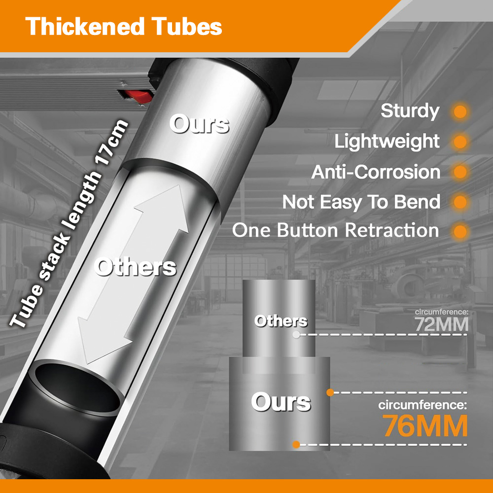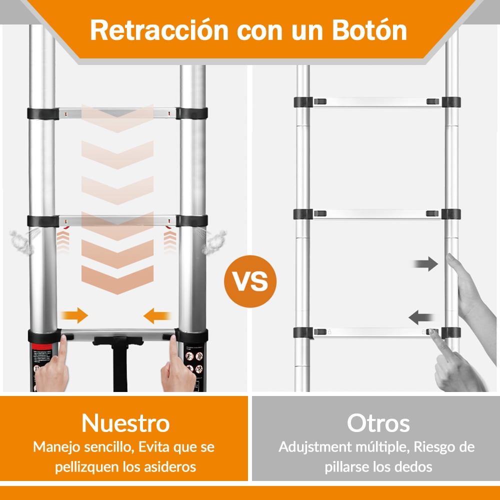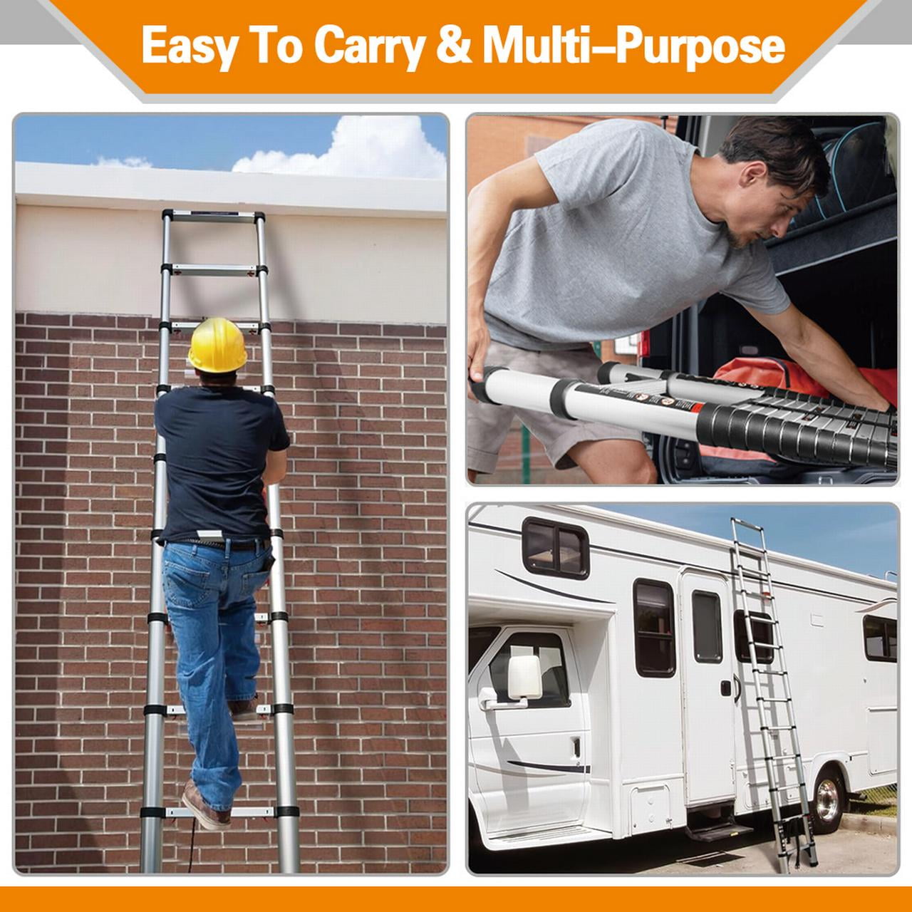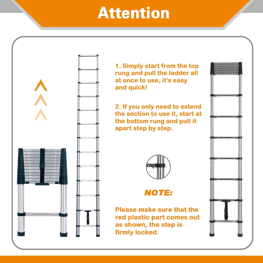 Superior load capacity: BOWEITI telescopic ladder is professionally manufactured from aircraft-grade stainless steel, with a maximum load capacity of 150kgs/330lbs. The plastic interface components are reinforced with nylon plastic, which makes it difficult to break and leaves no plastic residue. It has also passed the EN131 test, guaranteeing a long service life – get ready to reach new heights! Superior load capacity: Superior load capacity: One-button retraction: Tired of restrictions? Get ready for a compact size you can rely on. The extendable telescopic ladder can be retracted to any length. There is no need to retract the components separately, which saves you time. Press the thumb button, and the first rung will automatically descend at a smooth, slow speed, followed by other rapidly descending rungs. It ensures that your fingers are not pinched. It is very comfortable to operate. One-button retraction: One-button retraction: A reliable helper: The maximum height of the folding ladder is 12.5FT m with 13 rungs, and can be used in households every day, indoors and outdoors. Suitable for home repair, decoration, wall painting, light bulb changing, tree trimming, RV ladder, etc. No matter what you need, your new ladder will be there! A reliable helper: A reliable helper: