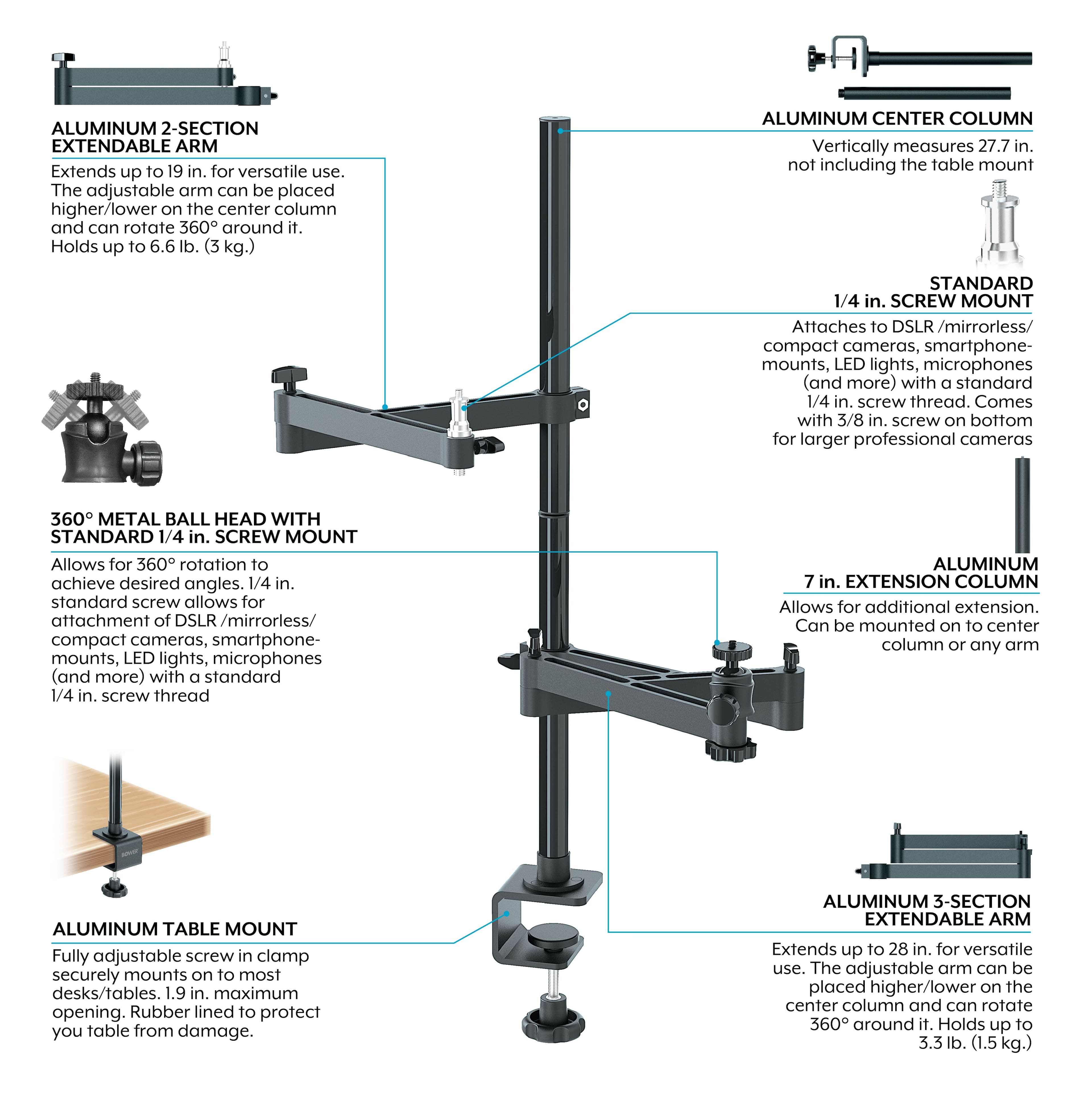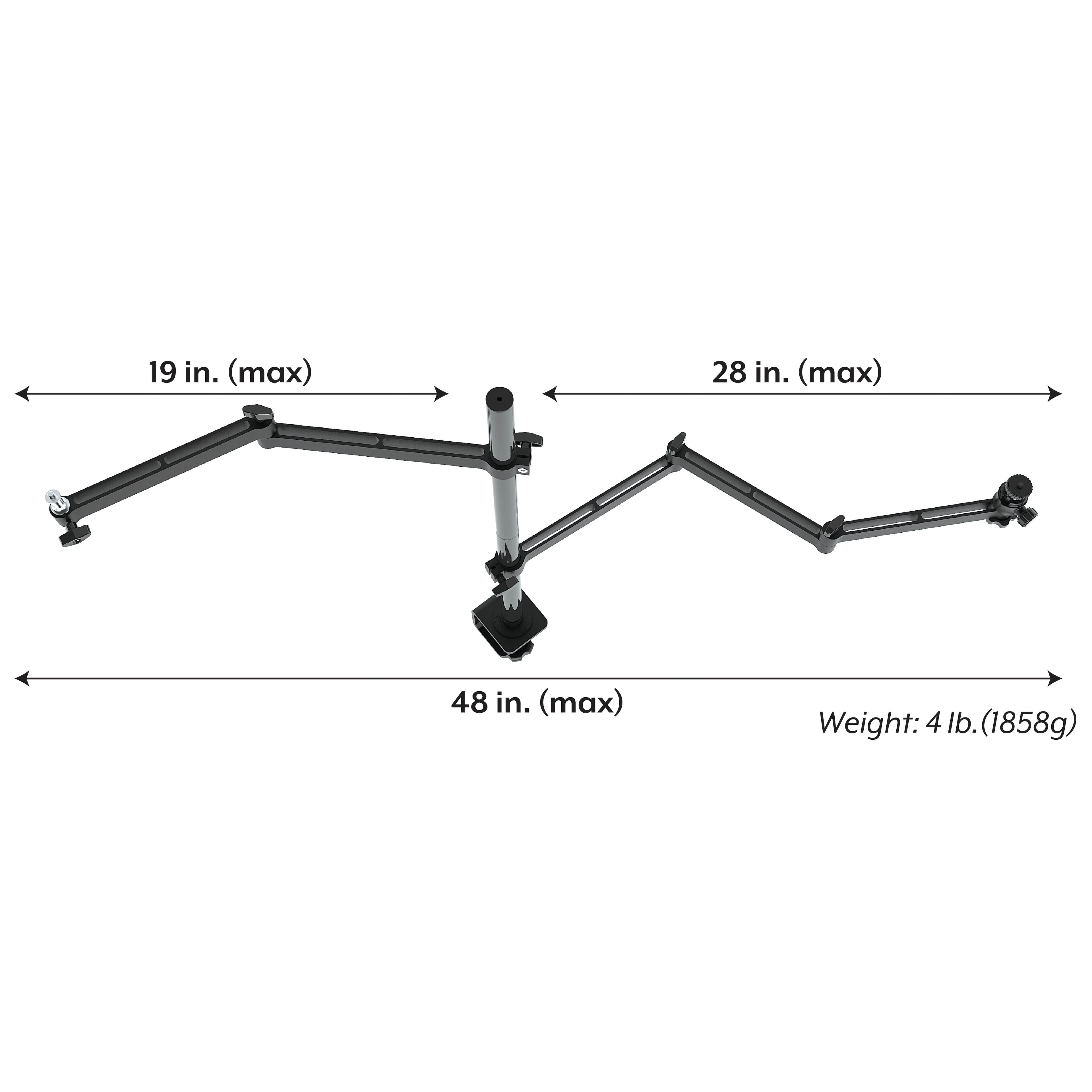Features a 2-section extendable arm (up to 19 inches) that holds up to 6.6 pounds, and a 3-section extendable arm (up to 28 inches) that holds up to 3.3 pounds. Both arms can be placed higher or lower on the center column and can rotate 360 degrees for maximum versatility.