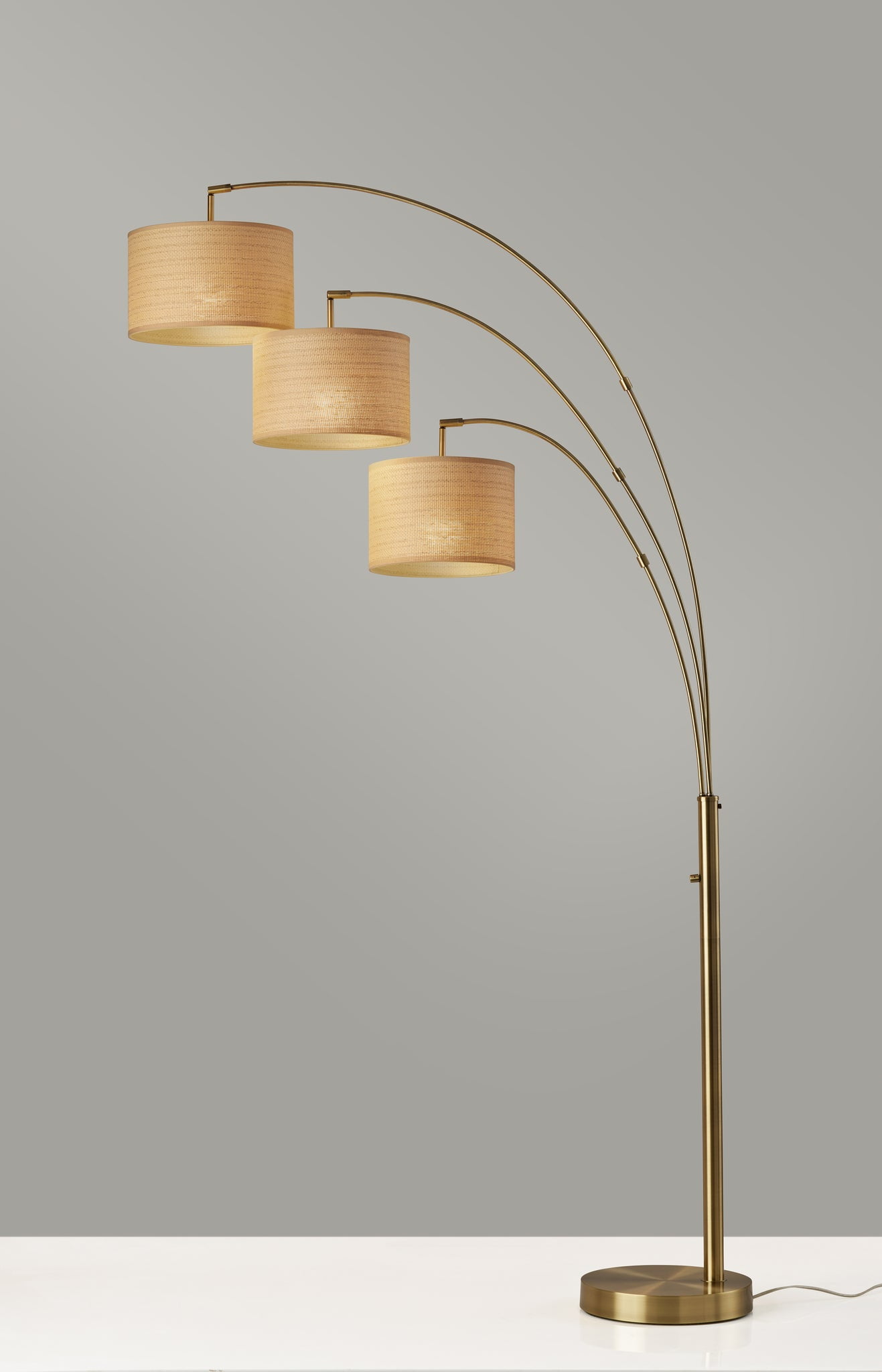 Playing with scale and space, the Bowery 3-arm arc lamp gracefully extends over a sectional or sofa to stylishly illuminate your room. Crafted of metal with an elegant, antique brass finish, the lamp features three slim adjustable branching arms at various heights extending from a narrow central pole for a sleek, minimalist design. Each of the three arms ends with a natural woven drum shade trimmed with beige along both the top and bottom to softly diffuse the light from a 100W bulb. For highly versatile lighting options, each arm can be pivoted around the pole to best accommodate the space and all three lampshades can be adjusted and redirected to focus the light wherever it’s needed. You can easily adjust the brightness by illuminating one light, two lights, or all three using the rotary switch located on the pole. To provide stability and an understated design, the lamp is anchored by a 12.5″ diameter round black base. Looking for a contrasting color palette? The Bower 3-arm arc lamp is also available in black finish.