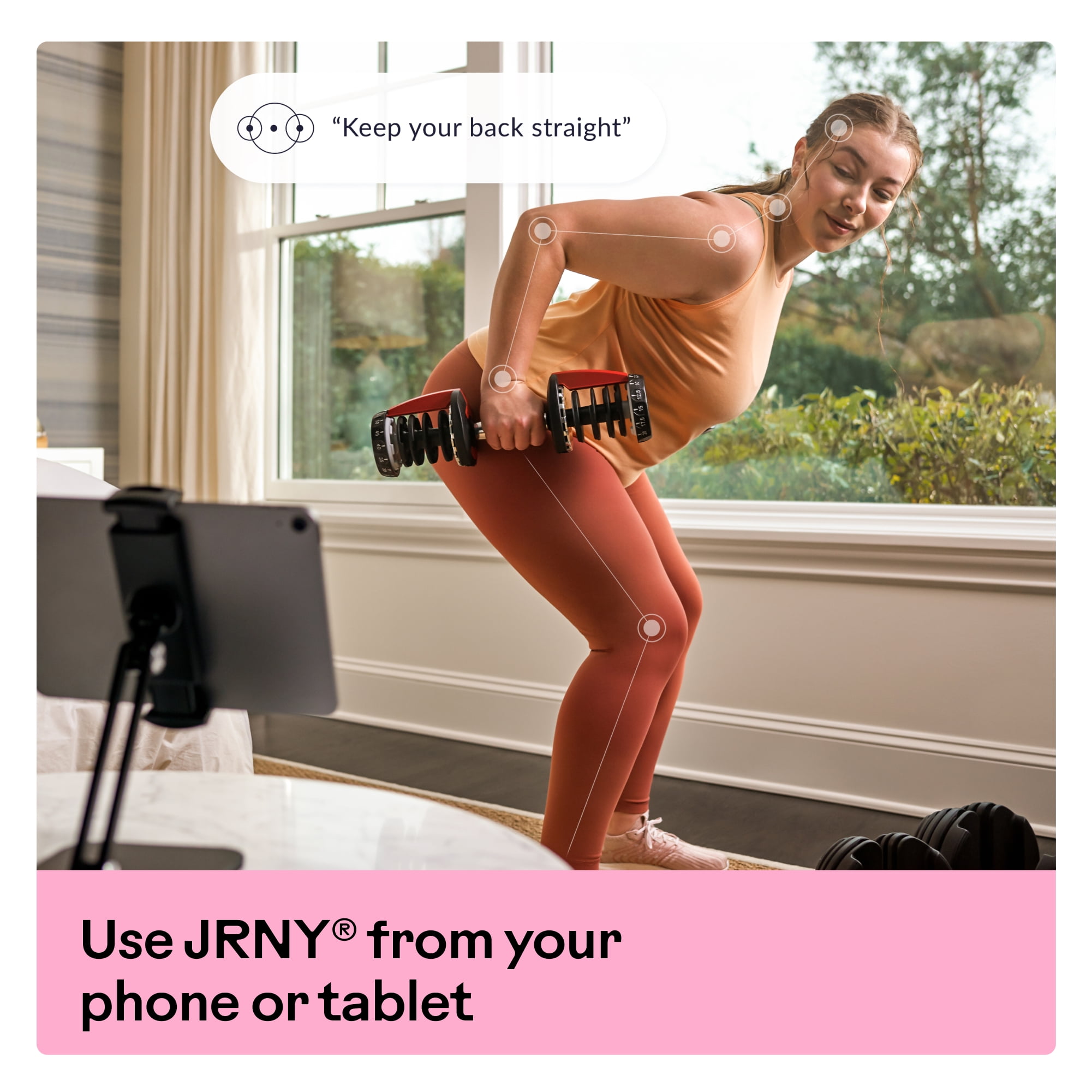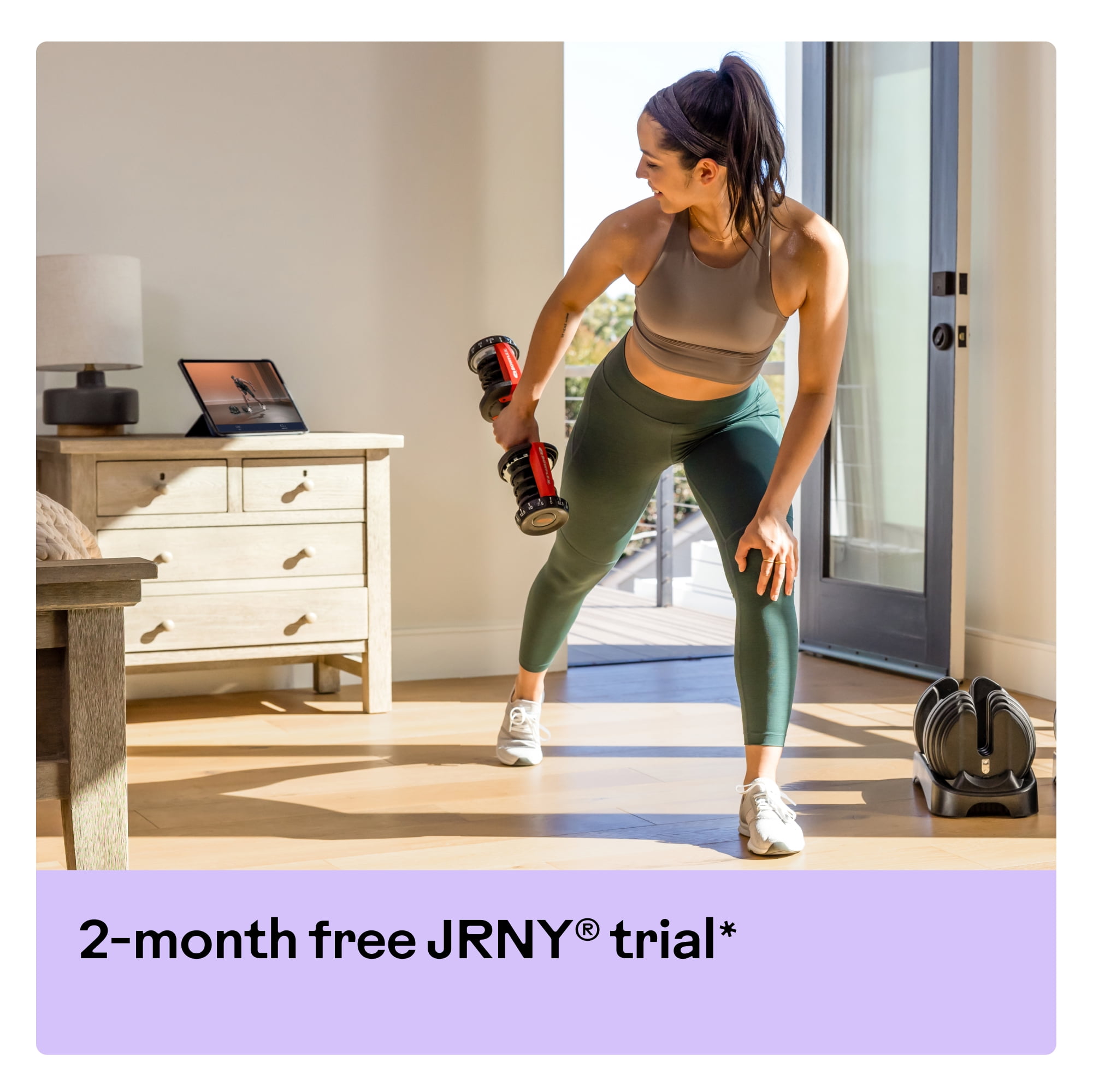 WIDER WEIGHT RANGE: Each dumbbell adjust from 5 to 52.5 lb. in 2.5 lb. increments up to 25 lb. TURN OF A DIAL: Select the weight you want with the turn of the dial – no more picking up 15 different dumbbells to give you the results you want. SPACE EFFICIENT: Say goodbye to 15 sets of dumbbells cluttering your workout space. 2-MONTH FREE TRIAL: Try our JRNY All-Access Membership for 2 months, free. JRNY MOBILE-ONLY MEMBERSHIP: Get strength-training and bodyweight workouts, at home and on the go from your phone or tablet. TOTAL BODY RESULTS: With the wider weight range you can do heavy exercises such as shrugs and lunges as well as lighter exercises such as curls and raises.