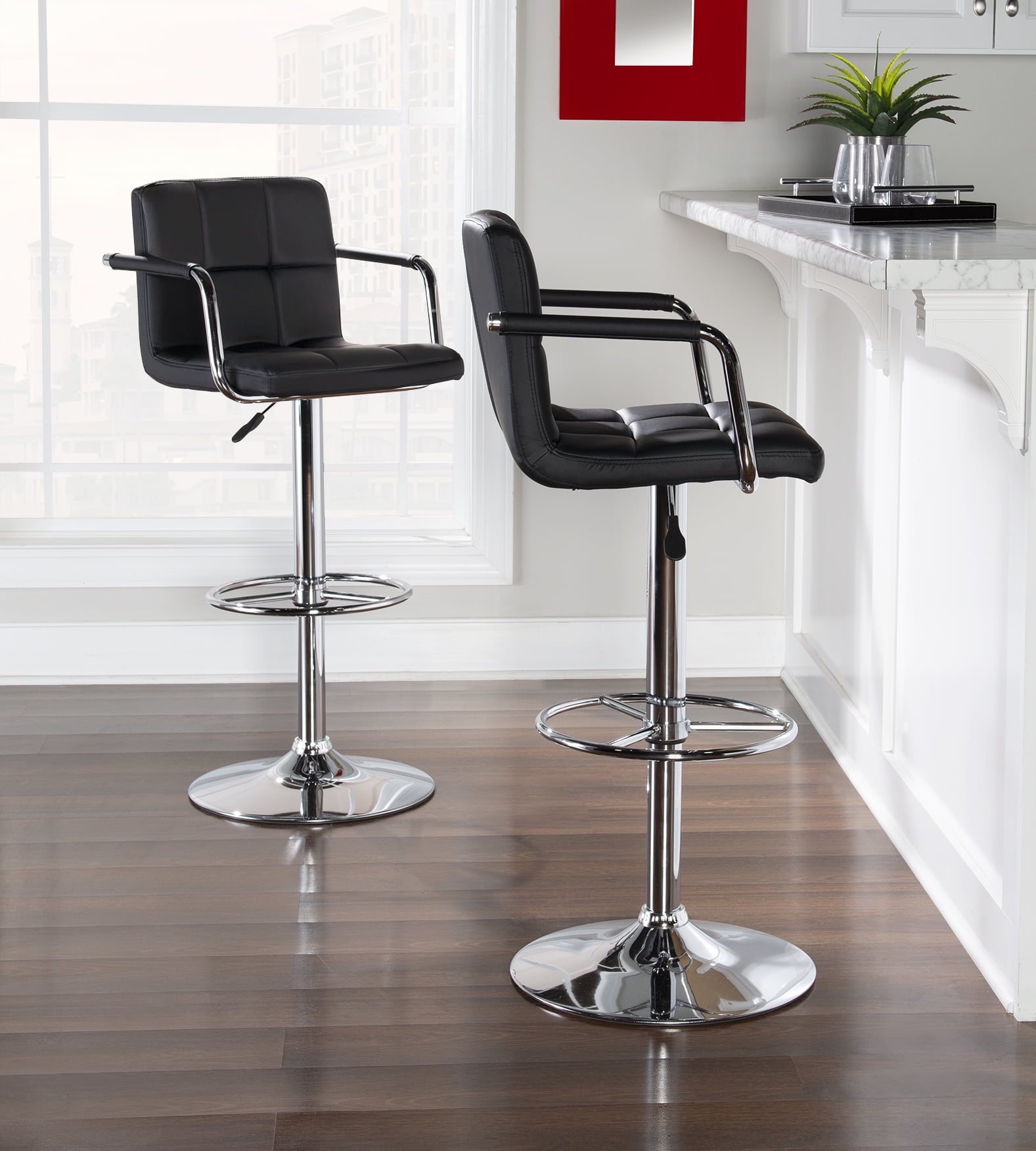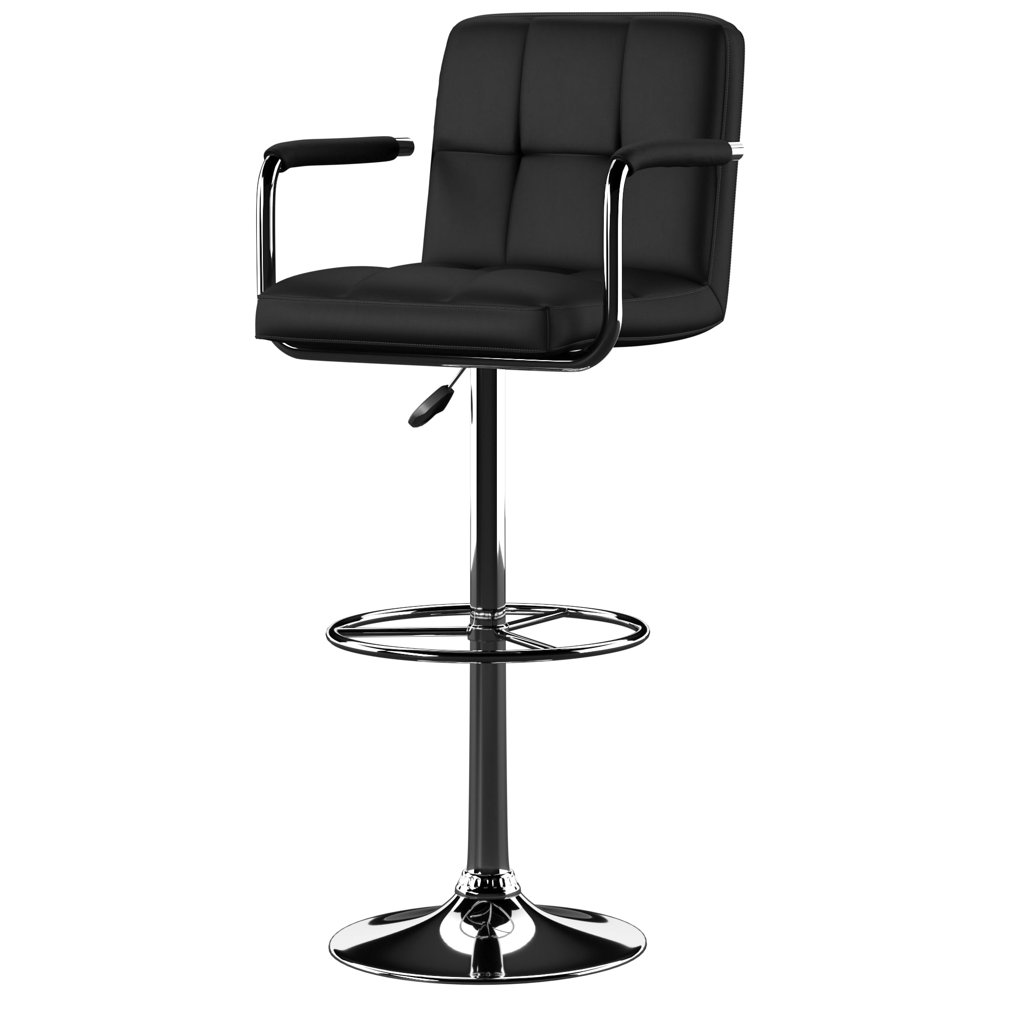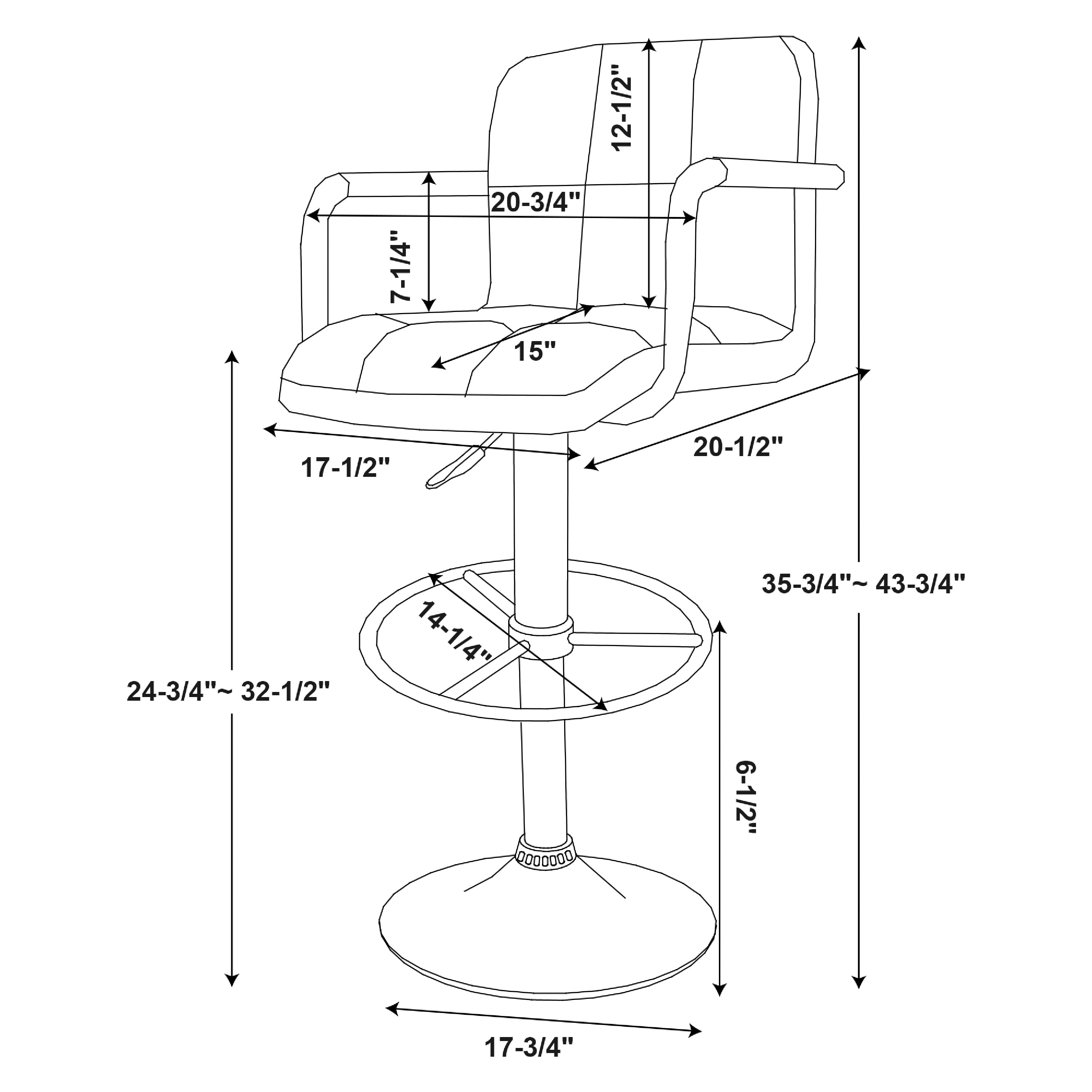 A stylish, faux leather quilted seat lends itself to the contemporary styling of this black and chrome bar stool. Finished with a round sturdy footrest and a gas-lift mechanism for convenient height adjusting, this piece combines function, comfort and style. 275 Pound weight capacity. Bifma 5.1 And en1335 standard testing passed and approved. Some assembly required. Features: Crafted from Metal, Plywood, Foam and Faux Leather Chrome Finish Black Faux Leather Upholstery Gas- Lift Mechanism for convenient height adjusting Finished with a round sturdy footrest BIFMA 5.1 and EN1335 Standard Testing Passed & Approved Protective Ring on Bottom of Base to Prevent Scratching Specifications: Assembly Required: Some Assembly Required Product Dimensions: 20.25″w x 21″d x 35.75″ – 43.75″h Product Weight: 22.49 lbs Weight Capacity: 275 lbs Seat Height: 24.5-32.5″