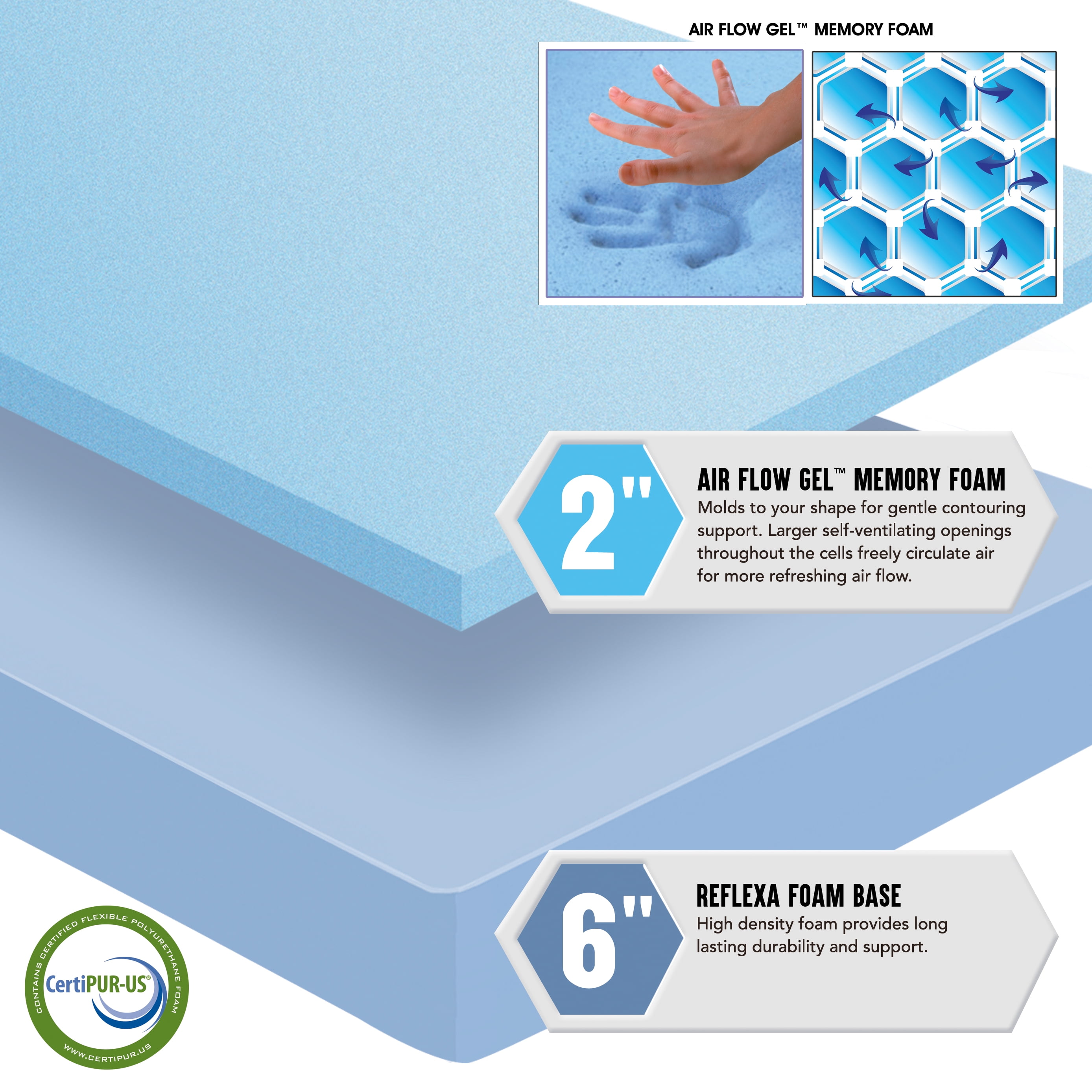 8″ Adult Cooling gel memory foam mattress Fiberglass Free 2″ memory foam layer cushions and supports your joints 6″ high-density Reflexa Foam base provides durable support Vertical openings in the memory foam to improve air flow and keep mattress fresh Removable, dry-cleanable mattress cover CertiPUR-US certified eco-friendly foam Bed in a box shipping to your door Easy setup: unpack, unroll, expand Allow 24-48 hours for the foam to fully expand before use Adjustable base and platform bed compatible Mattress Dimensions: (King) 8″ H x 75″ W x 79″ L , 61 lbs; (Queen) 8″ H x 59″ W x 79″ L, 47 lbs; (Full) 8″ H x 53″ W x 74″ L, 47 lbs; (Twin) 8″ H x 38″ W x 74″ L, 29lbs; (Twin XL) 8″ H x 38″ W x 79″ L, 32 lbs. Box Dimensions: (King) 41″ H x 20″ W x 20″ L, 66 lbs; (Queen) 41″ H x 18″ W x 18″ L, 52 lbs; (Full) 41″ H x 18″ W x 18″ L, 46 lbs; (Twin) 39.5″ H x 15″ W x 15″ L, 34 lbs; (Twin XL) 39.5″ H x 15″ W x 15″ L, 37 lbs. Store Pickup Note: This item is packaged in a large box that may not fit in a standard-sized vehicle. Please make sure you have a large car or truck for store pickup.