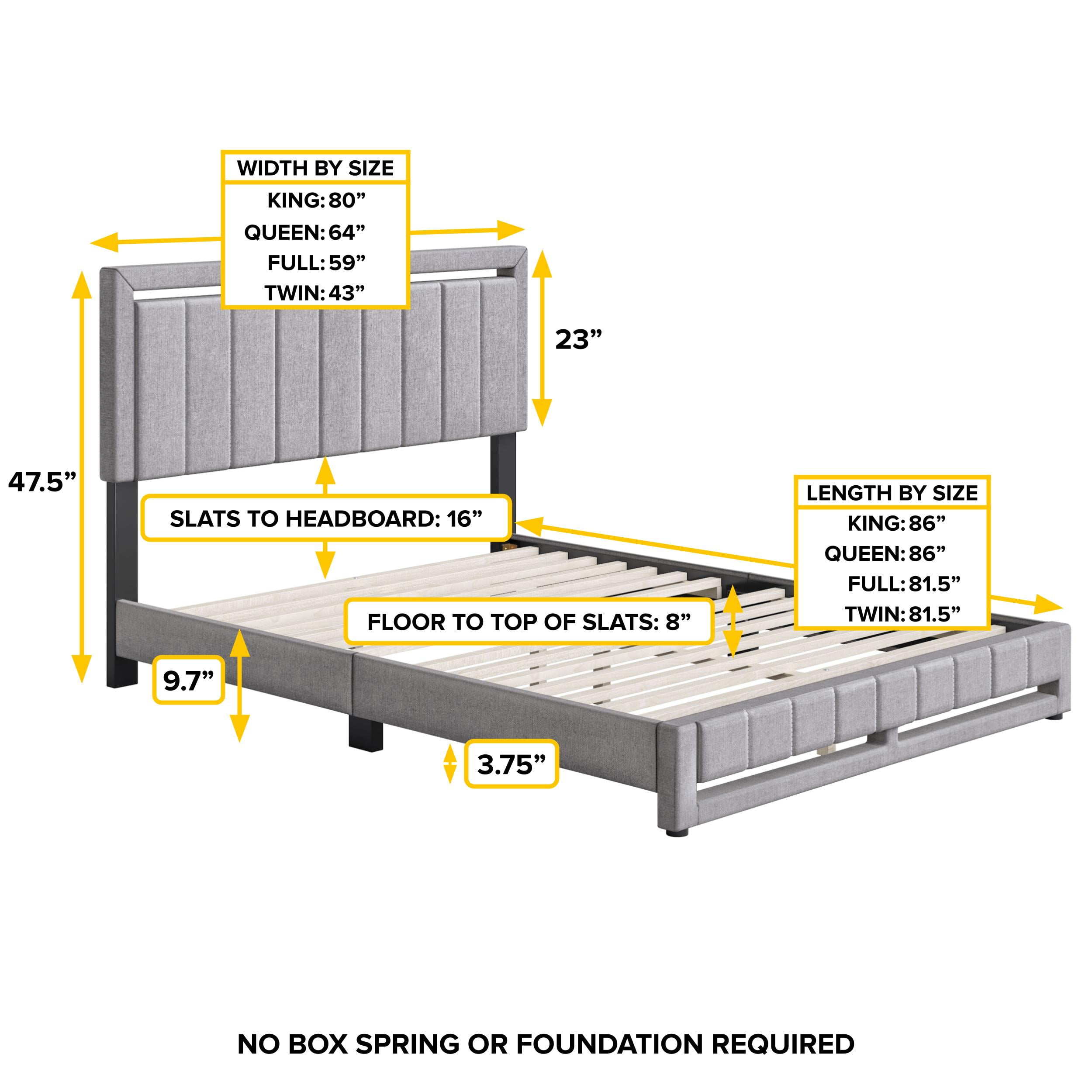 Modern Upholstered Platform Bed: The Boyd Sleep Beaumont bed frame features a linen upholstered adjustable headboard, ensuring a tailored fit to a variety of mattress thicknesses. No Box Spring Required: Durable roll-out wooden slat system offers superior mattress support, eliminating the need for a box spring while maintaining noise-free stability for undisturbed sleep. Durable, Noise-Free Support: Crafted with a quiet, heavy-duty frame and strong wood slats, this platform bed provides sturdy support for your mattress and prevents sagging over time. Quick and Easy Assembly: All parts and tools ship zipped into the headboard to make assembly straightforward and hassle-free, completed in under 30 minutes. Versatile Compatibility: Compatible with adjustable bases, and with memory foam, hybrid, innerspring, and latex mattresses, making it a versatile choice for any sleep preference. Assembled Size:King 86″L x 80.3″W x 47.5″H; Queen 86″L x 64″W x 47.5″H; Full 81.5″L x 58.6″W x 47.5″H; Twin 81.5″L x 42.9″W x 47.5″H. Box size:67.1″L x 25.2″W x 6.9″H