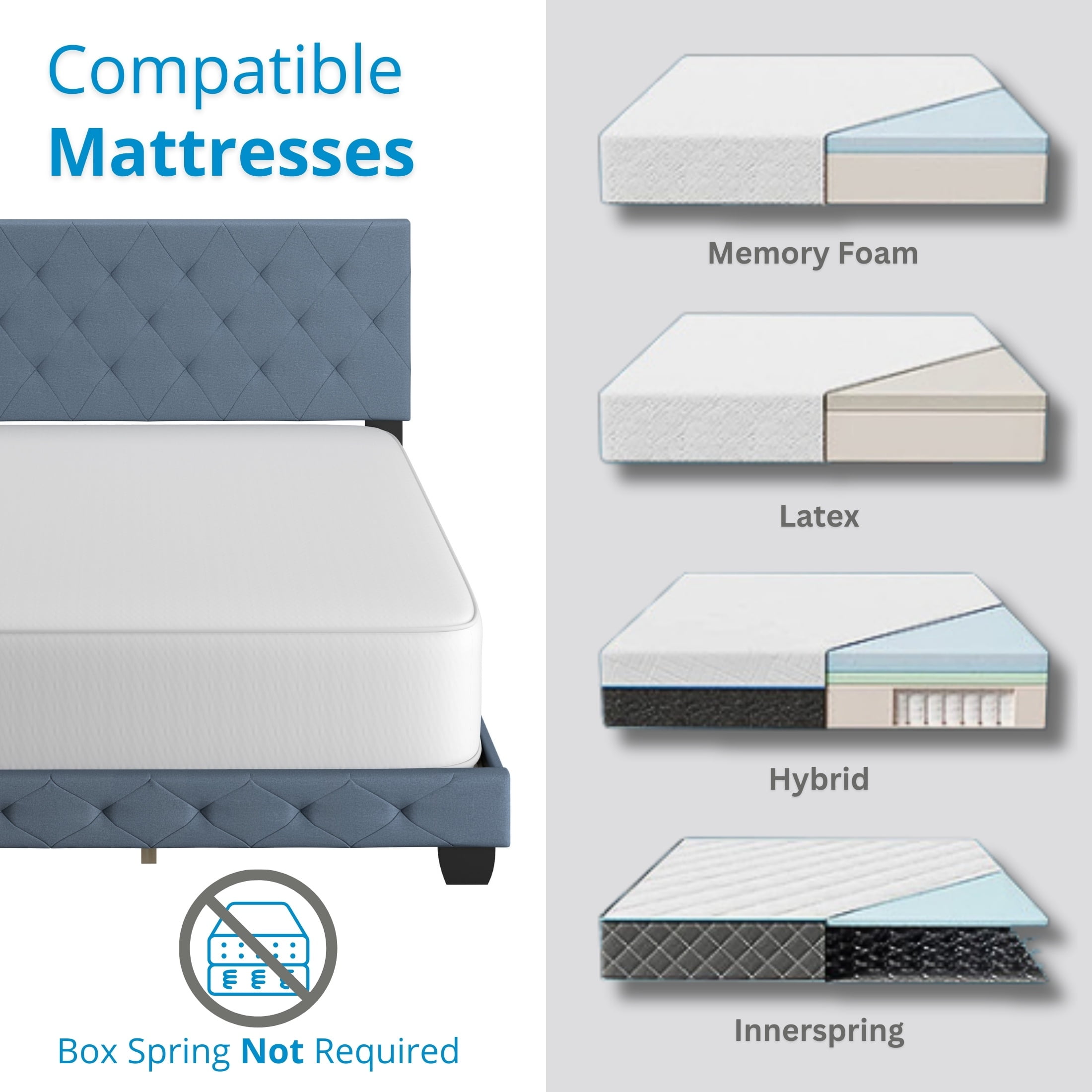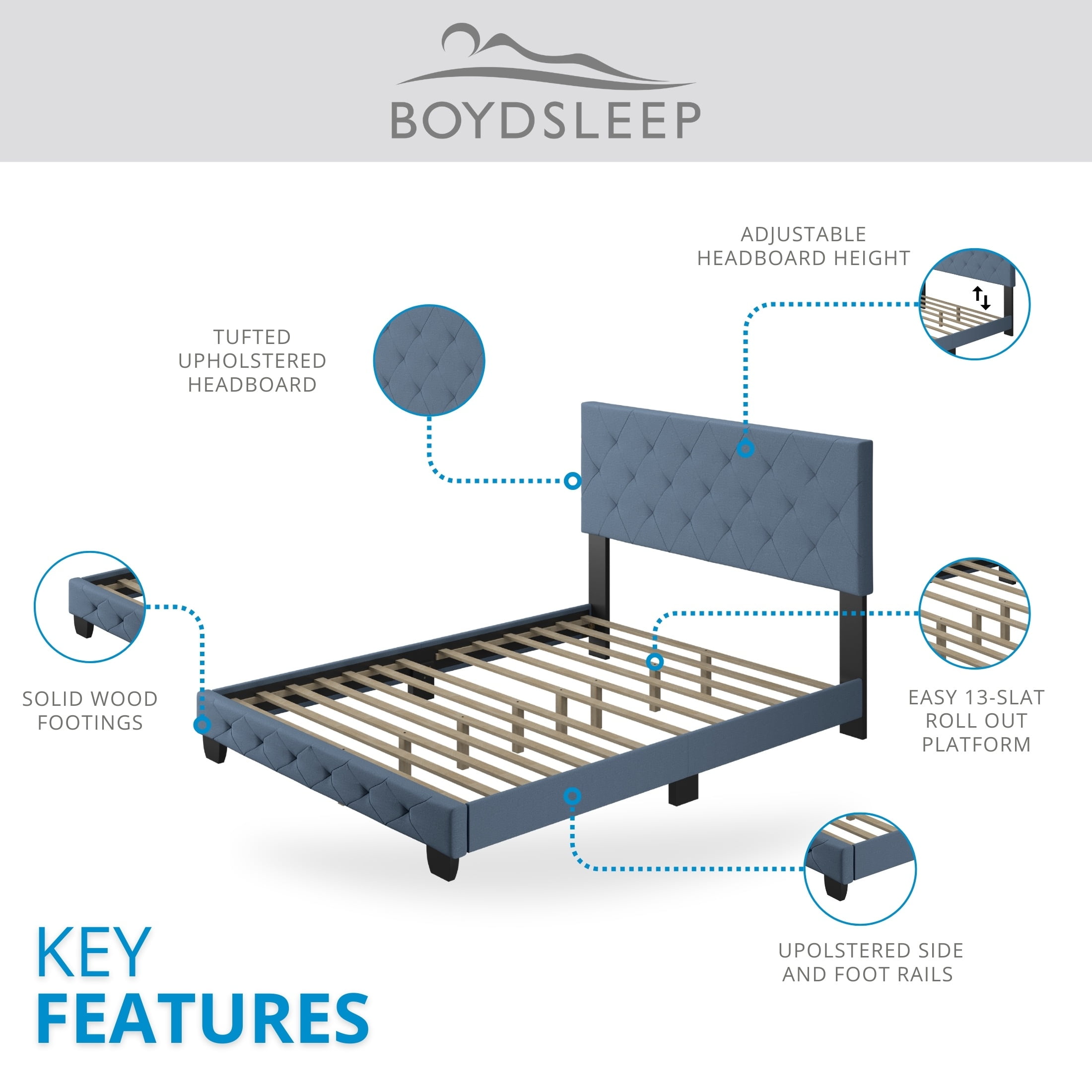 Modern Upholstered Platform Bed: The Boyd Sleep Chloe bed frame features a tufted linen upholstered adjustable headboard, ensuring a tailored fit to a variety of mattress thicknesses. No Box Spring Required: Durable roll-out wooden slat system offers superior mattress support, eliminating the need for a box spring while maintaining noise-free stability for undisturbed sleep. Durable, Noise-Free Support: Crafted with a quiet, heavy-duty frame and strong wood slats, this platform bed provides sturdy support for your mattress and prevents sagging over time. Quick and Easy Assembly: All parts and tools ship zipped into the headboard to make assembly straightforward and hassle-free, completed in under 30 minutes. Versatile Compatibility: Compatible with adjustable bases, and with memory foam, hybrid, innerspring, and latex mattresses, making it a versatile choice for any sleep preference. Assembled Size: King – 80.3″W x 86.4″L x 47″H, 81 lbs; Queen – 64.1″W x 86.4″L x 47″H, 69 lbs; Full – 58.6″W x 82.1″L x 47″H, 65 lbs Box size: King – 82.5″L x 25.5″W x 4.5″H, 89 lbs; Queen – 66.3″L x 25.5″W x 4.5″H, 76 lbs; Full – 60.8″L x 25.5″W x 4.5″H, 72 lbs