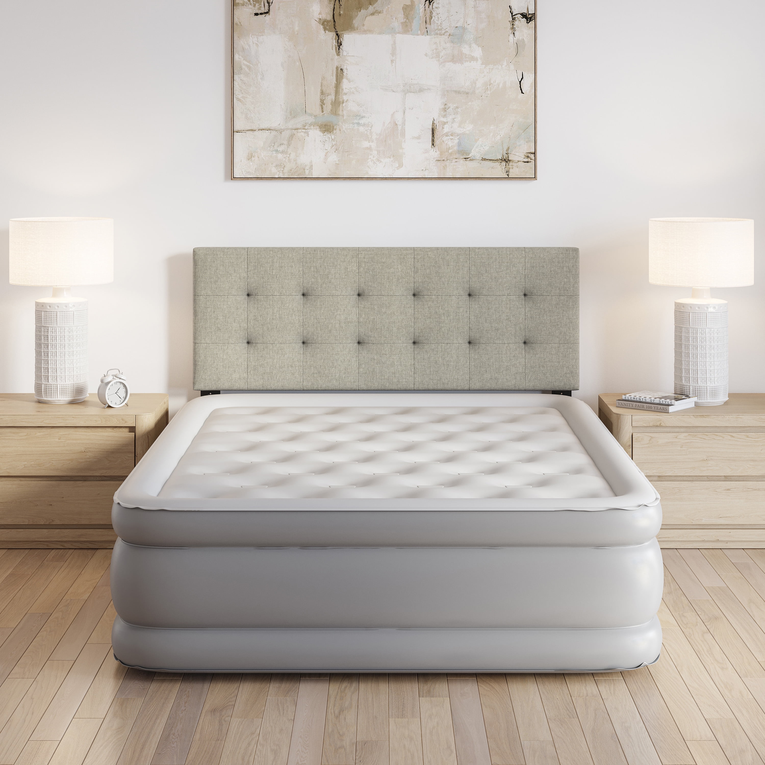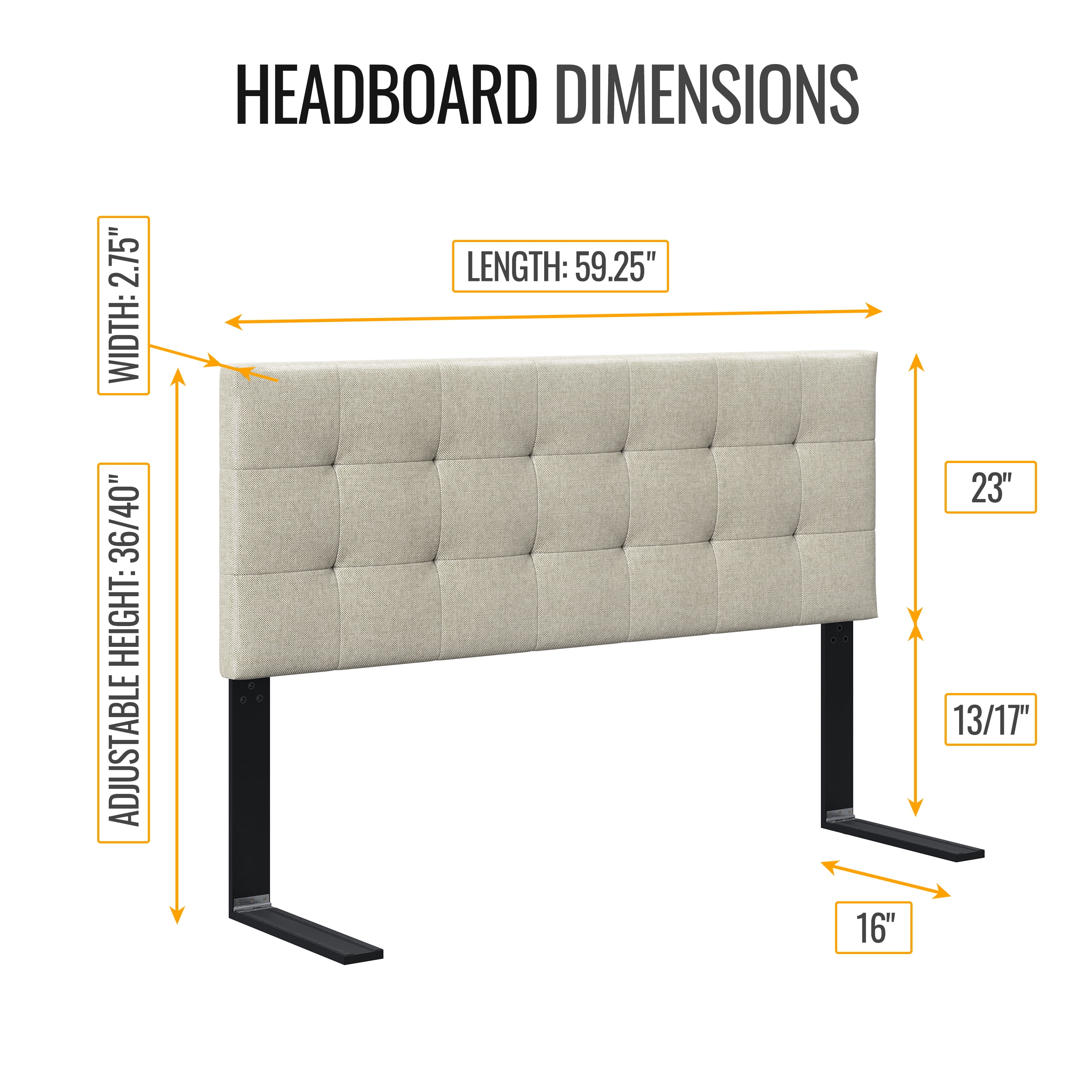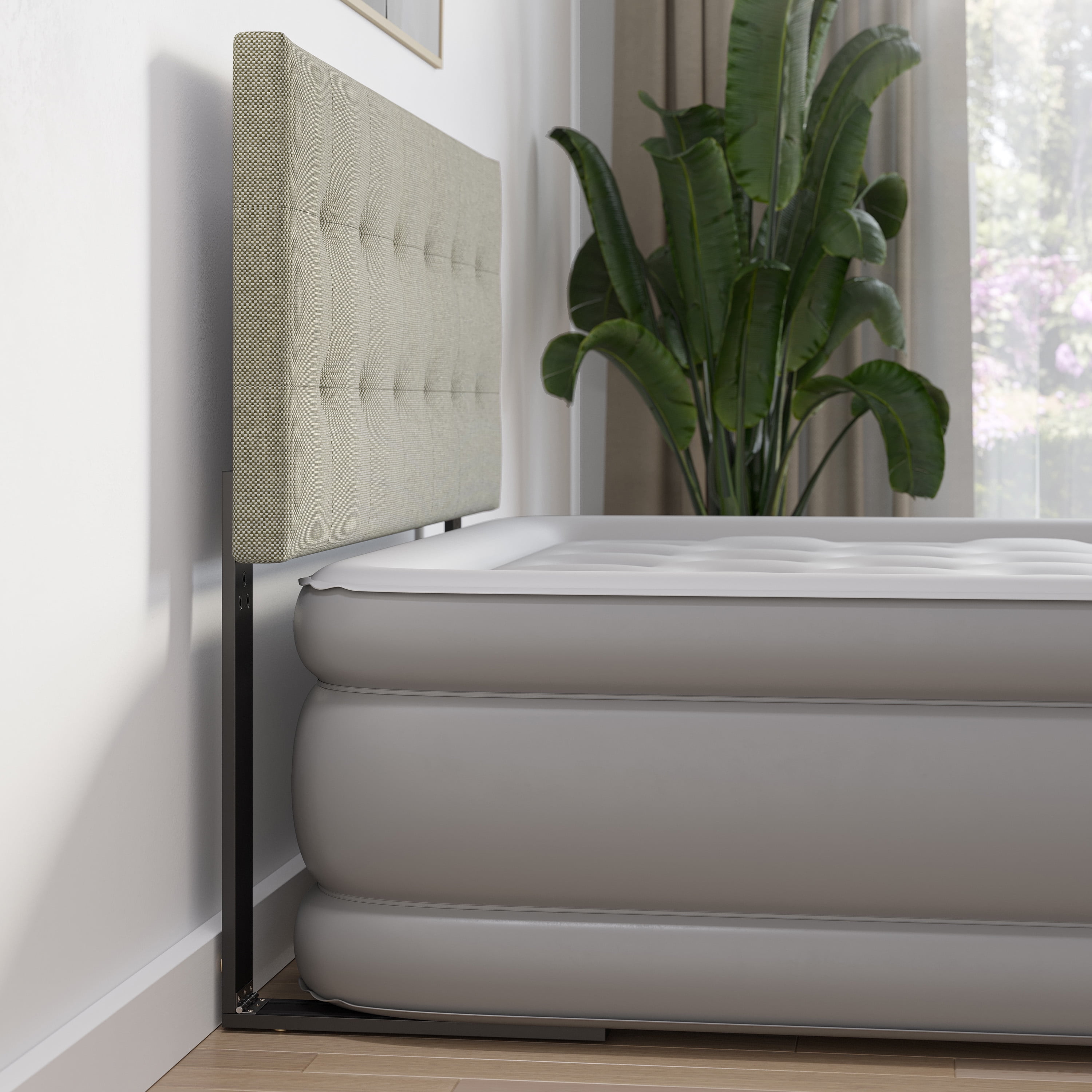 No installation, no mess: the Boyd Sleep Linen Instant Adjustable Headboard is an instant upgrade for your bedroom. Simply slide the L-shaped metal legs under your mattress to anchor, and voila! Your new headboard is ready in a flash. No installation or wall damage makes this headboard the perfect solution for renters and students. Give your guests the comforts of home; this Premier headboard makes the perfect pair with air mattresses. Adjustable legs raise the upholstered headboard from 36 to 40 inches in height, which means you can easily swap between thicker or thinner mattresses. Best used with a Queen or Full/Double size bed, but can anchor under any mattress 20 inches or wider. Upholstered in tufted Khaki linen. Ships in 1 box and assembles in minutes. All hardware and tools are conveniently zipped up in the back of the headboard. The Boyd Sleep Linen Instant Adjustable Headboard is the fastest way to dress up any bed in your home.