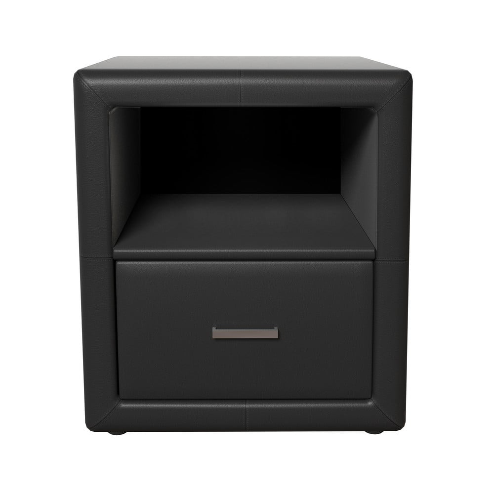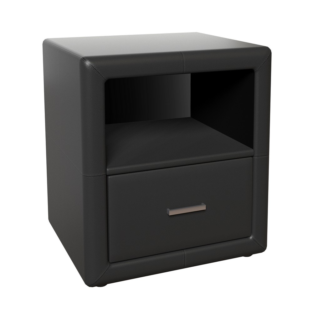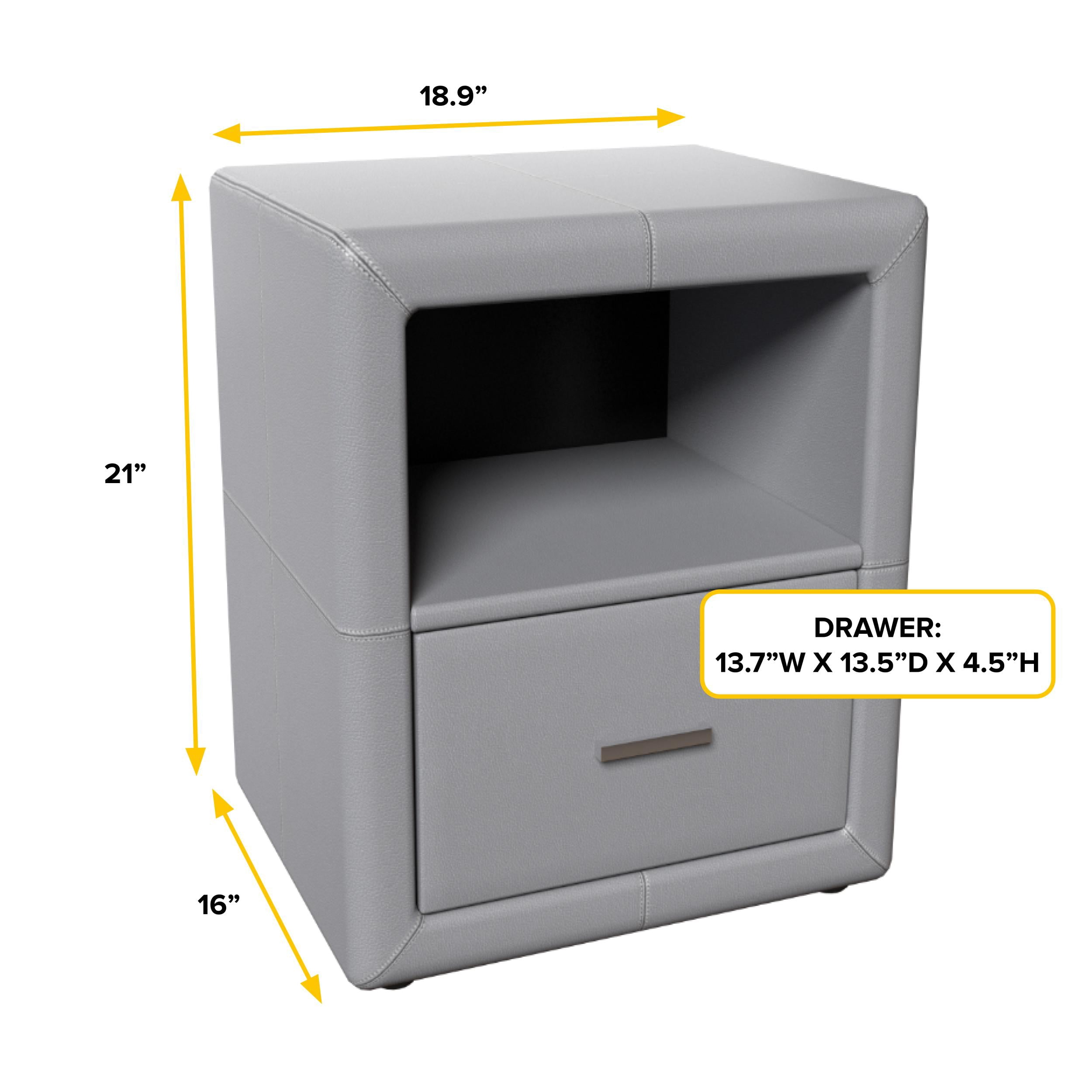 Faux leather upholstered nightstand, with single drawer Comes fully assembled Available in 3 colors: black, white and gray Pairs well with Premier faux leather platform bed frames Dimensions: 21″H x 16″L x 19″W