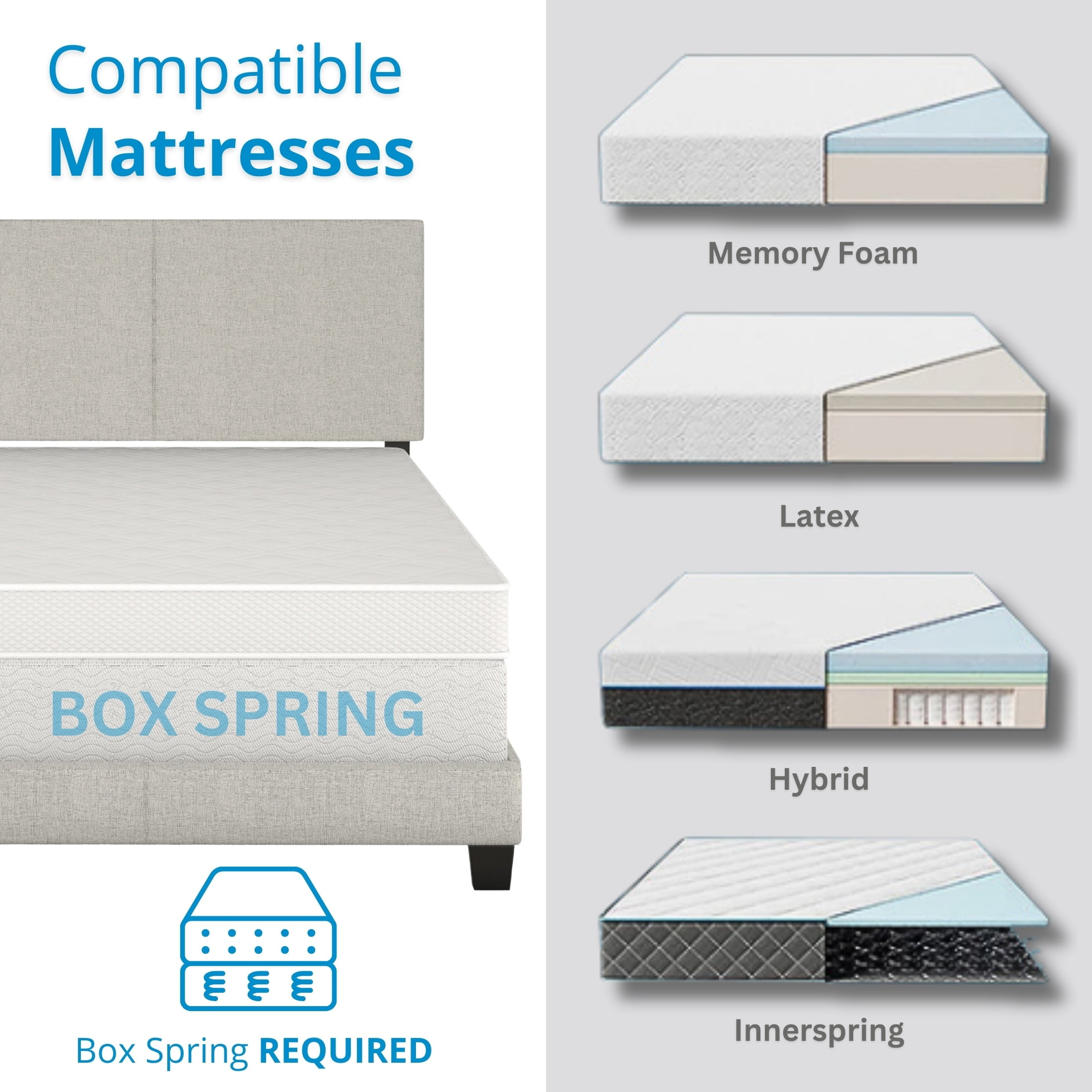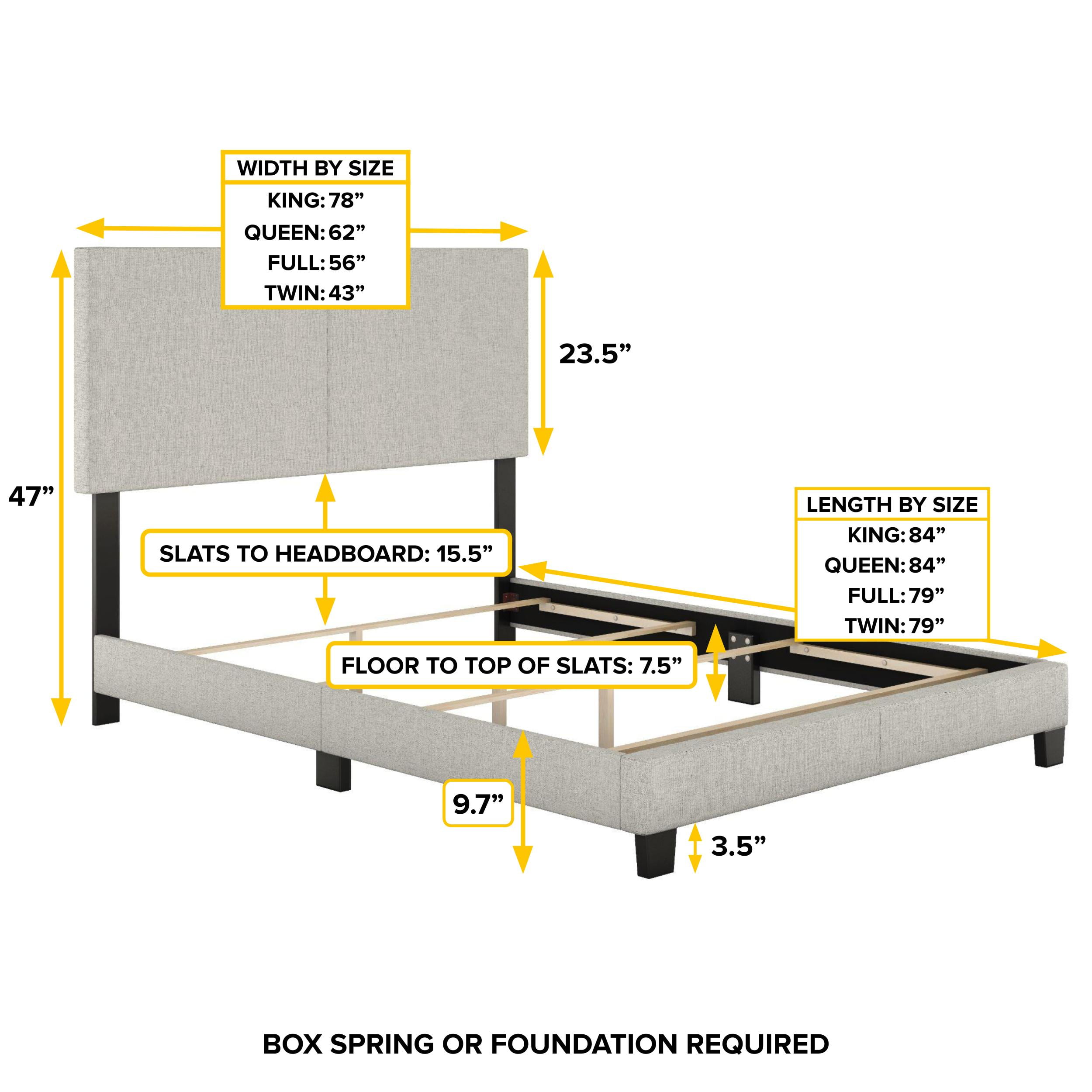 Modern Upholstered Platform Bed: The Boyd Sleep Milan bed frame features a sleek vegan leather upholstered adjustable headboard, ensuring a tailored fit to a variety of mattress thicknesses. Box Spring Required for Added Comfort: Designed to work with a foundation and mattress combo (box spring not included), offering enhanced support and longevity for all mattress types. Durable, Noise-Free Support: Crafted with a quiet, heavy-duty frame and strong wood slats, this platform bed provides sturdy support for your mattress and prevents sagging over time. Quick and Easy Assembly: All parts and tools ship zipped into the headboard to make assembly straightforward and hassle-free, completed in under 30 minutes. Versatile Compatibility: Compatible with adjustable bases, and with memory foam, hybrid, innerspring, and latex mattresses, making it a versatile choice for any sleep preference. Assembled Size: King: 46″ H x 78″ W x 83.75″ L, 70 lbs, Queen: 46″ H x 62″ W x 83.75″ L, 60 lbs, Full: 46″ H x 56″ W x 78.75″ L, 56 lbs, Twin: 46″ H x 41″ W x 78.75″ L, 50 lbs. Box Dimensions: King: 4″ H x 25.2″ W x 82.5″ L, 77 lbs, Queen: 4″ H x 25.2″ W x 66.5″ L, 66 lbs, Full: 4″ H x 25.2″ W x 61″ L, 62 lbs, Twin: 4″ H x 25.2″ W x 45 ” L, 44 lbs.