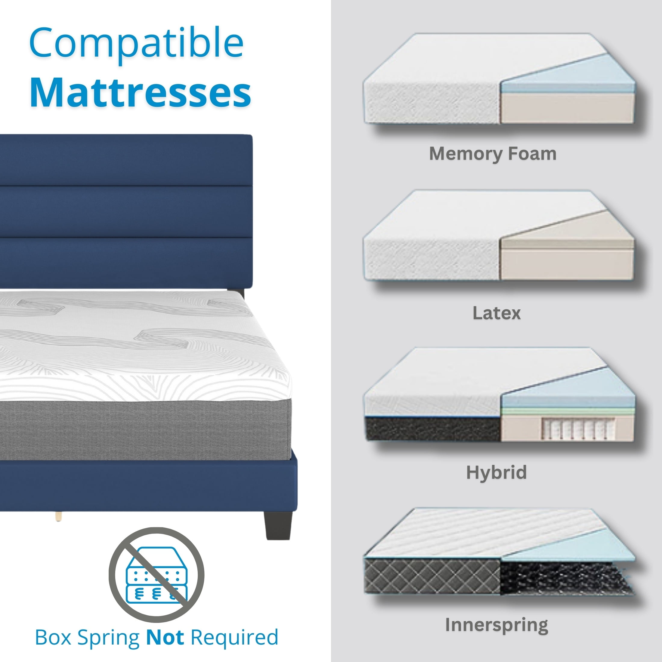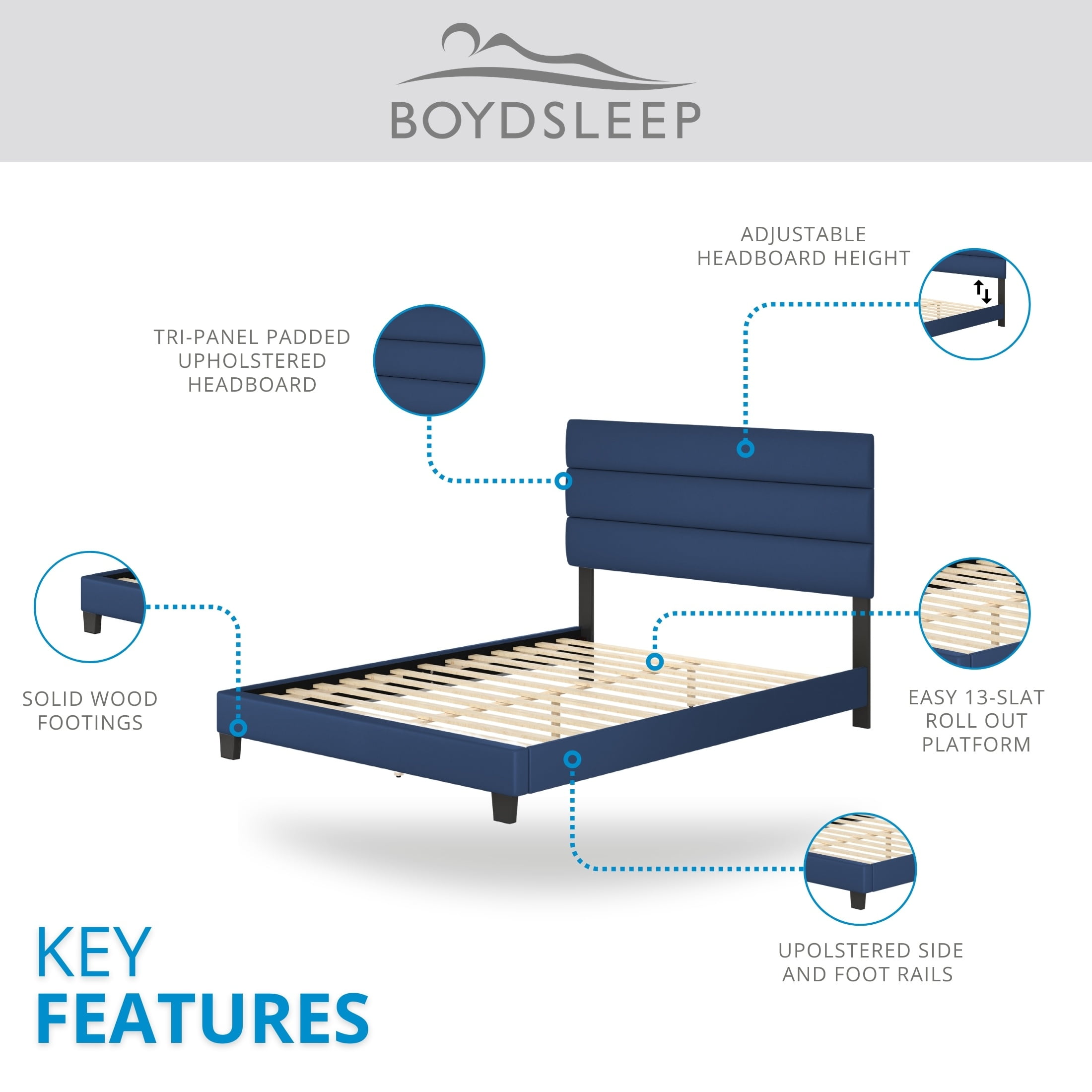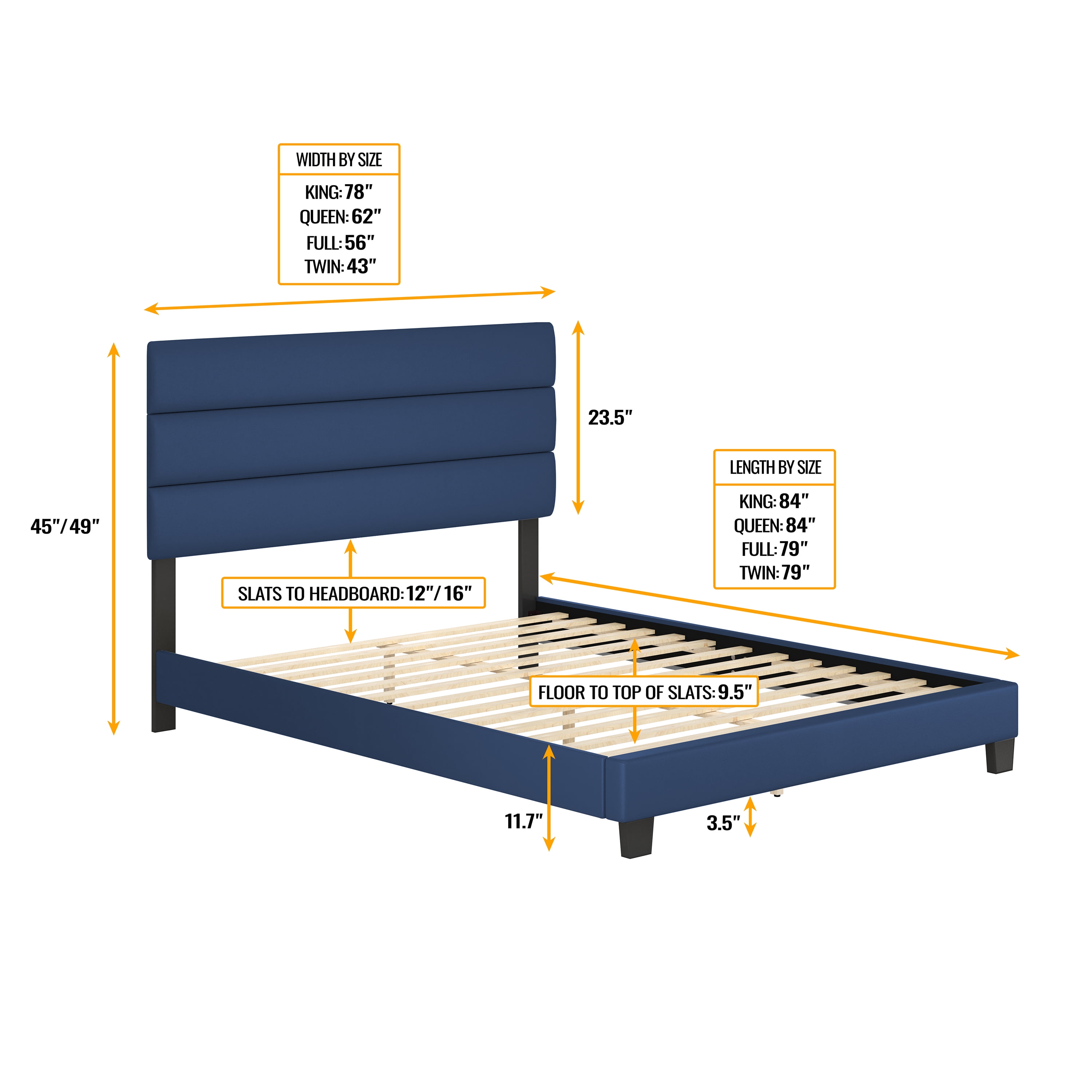 Modern Upholstered Platform Bed: The Boyd Sleep Piedmont bed frame features a sleek vegan leather upholstered adjustable headboard, ensuring a tailored fit to a variety of mattress thicknesses. No Box Spring Required: Durable roll-out wooden slat system offers superior mattress support, eliminating the need for a box spring while maintaining noise-free stability for undisturbed sleep. Durable, Noise-Free Support: Crafted with a quiet, heavy-duty frame and strong wood slats, this platform bed provides sturdy support for your mattress and prevents sagging over time. Quick and Easy Assembly: All parts and tools are included to make assembly straightforward and hassle-free, completed in under 30 minutes. Versatile Compatibility: Compatible with adjustable bases, and with memory foam, hybrid, innerspring, and latex mattresses, making it a versatile choice for any sleep preference. Assembled Size: King: 46″H x 78″W x 83.75″L, 70 lbs, Queen: 46″H x 62″W x 83.75″L, 60 lbs, Full: 46″H x 56″W x 78.75″L, 56 lbs, Twin: 46″H x 41″W x 78.75″L, 50 lbs Box Dimensions: King: 4″H x 25.2″W x 82.5″L, 90 lbs, Queen: 4″H x 25.2″W x 66.5″L, 79 lbs, Full: 4″H x 25.2″W x 61″L, 74 lbs, Twin: 4″H x 25.2″W x 45″L, 62 lbs