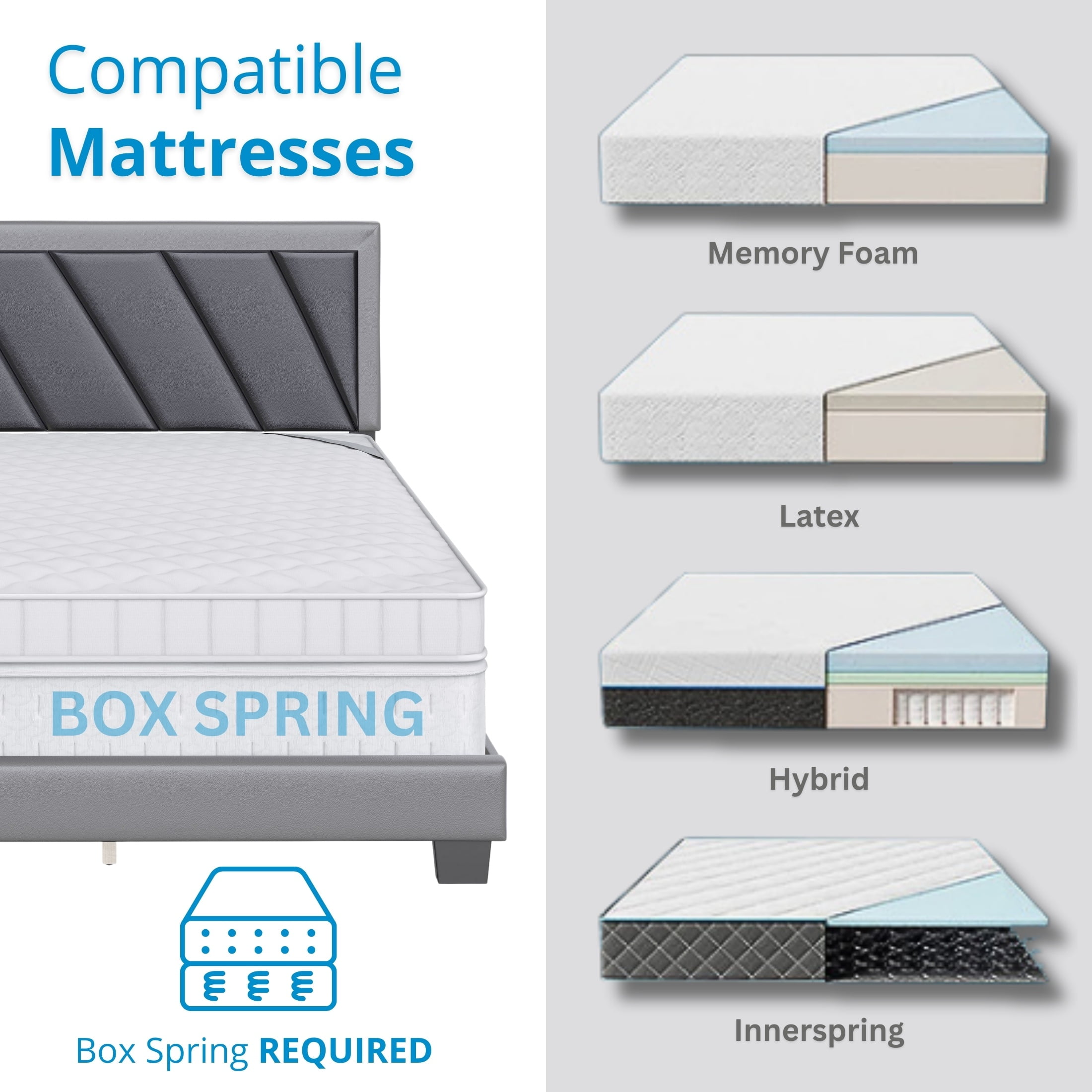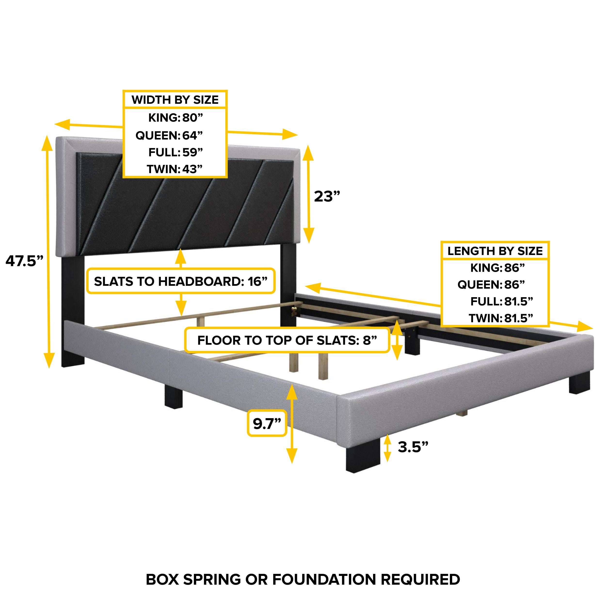 Modern Upholstered Platform Bed: The Boyd Sleep Savona bed frame features a vegan leather upholstered adjustable headboard, ensuring a tailored fit to a variety of mattress thicknesses. Qualified Box Spring Required for Use: Must be paired with a qualified foundation or box spring (not included). Durable, Noise-Free Support: Crafted with a quiet, heavy-duty frame and strong wood slats, this platform bed provides sturdy support for your mattress and prevents sagging over time. Quick and Easy Assembly: All parts and tools ship zipped into the headboard to make assembly straightforward and hassle-free, completed in under 30 minutes. Versatile Compatibility: Compatible with adjustable bases, and with memory foam, hybrid, innerspring, and latex mattresses, making it a versatile choice for any sleep preference. Assembled Size: 86″ L x 80.3″ W x 47.5″ H Box Size: 83.3″ L x 29.5″ W x 4.1″ H