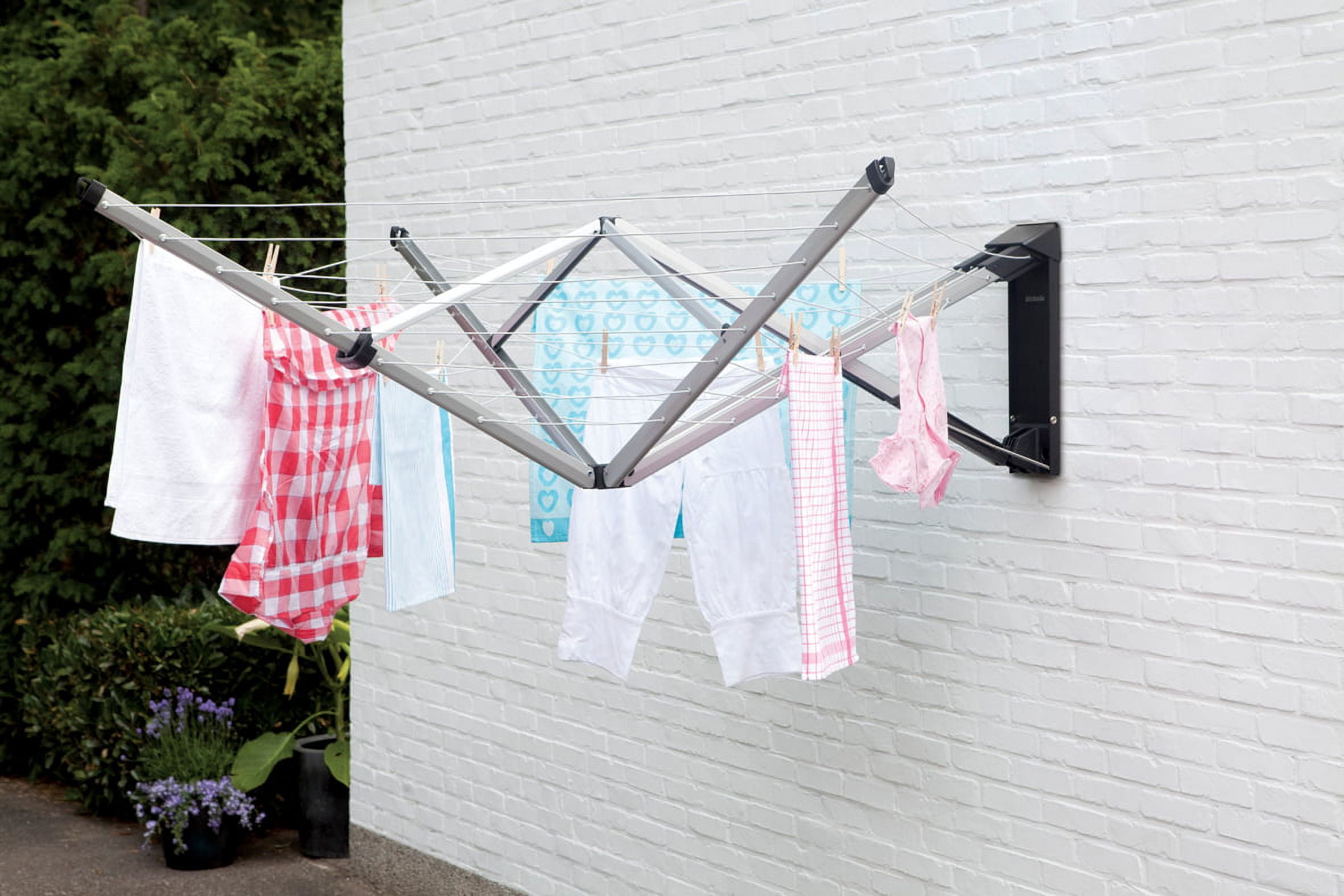 Ideal working height Suitable for large laundry items – outer lines are 3.94 feet long Wind and weather resistant – solid construction made of corrosion resistant materials Easy to install – clear step-by-step instructions, solid wall fixings and drilling template enclosed Complete with cover