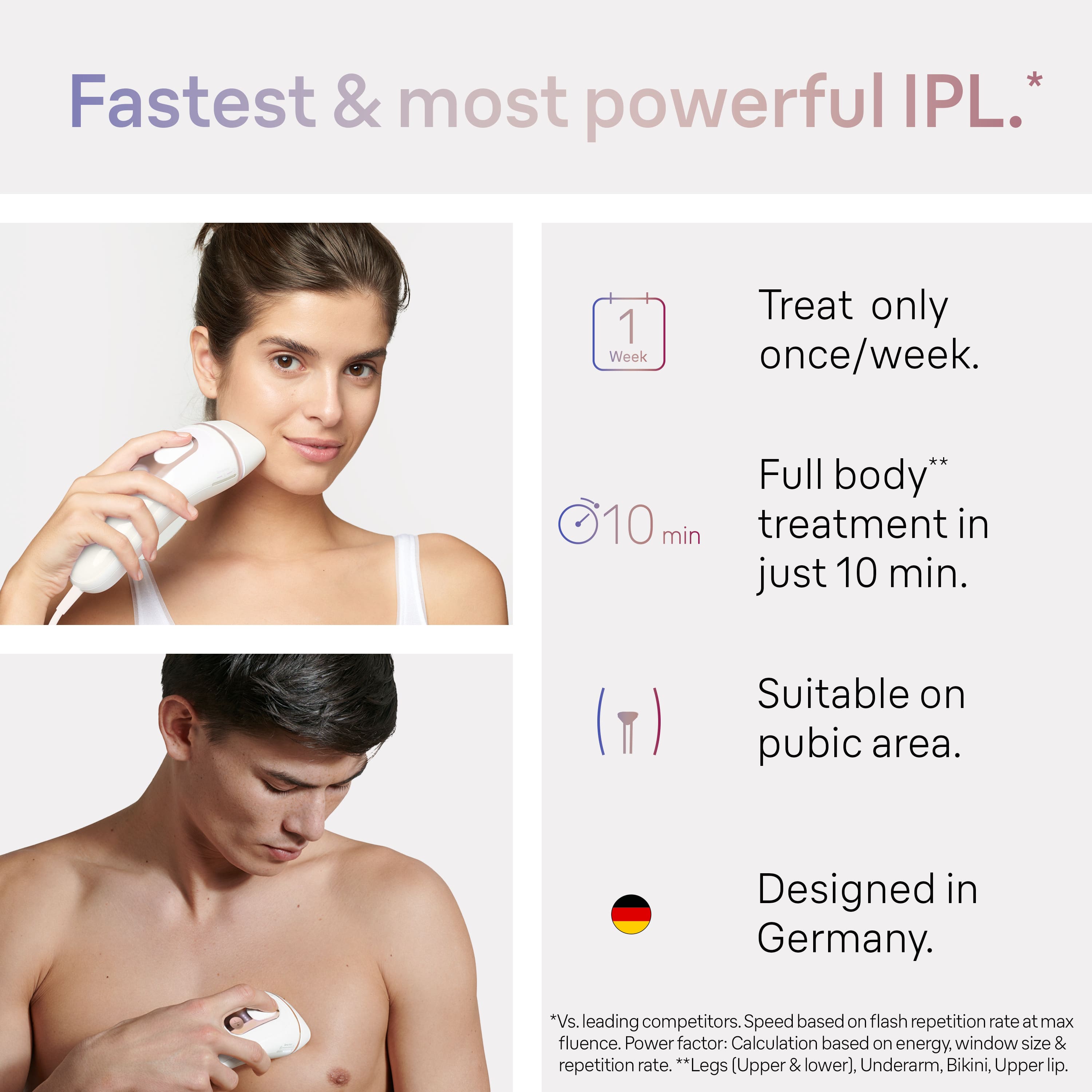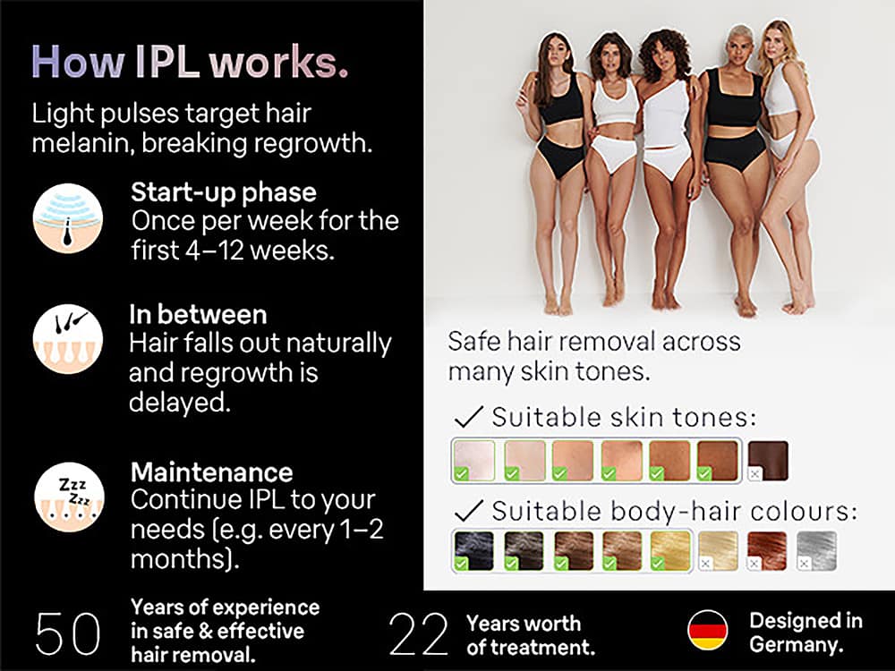 Skip salons with the world’s 1st smart IPL hair removal device that learns and adapts. Whether you look for bikini hair removal, flawless facial hair remover, or pubic hair removal, Braun PL7243 IPL is our fastest way for long-lasting hair removal. Like laser hair removal salon, Skin i·expert tailors the treatment to your needs, provides real-time guidance and tracks progress in the free mobile app in the privacy of home. Safe and effective, the only IPL* that automatically adapts to your skin tone. *shared technology with Cyden.