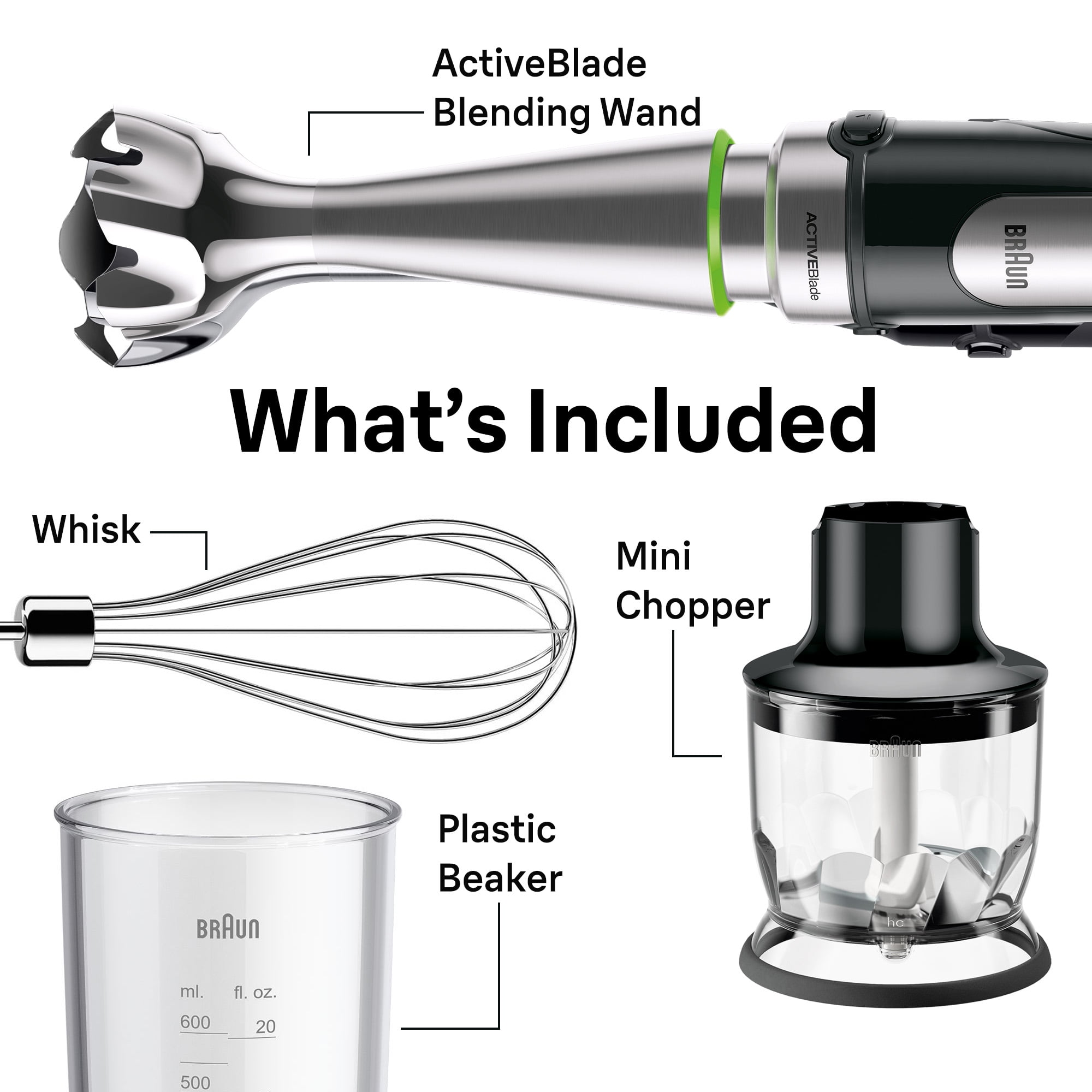 Braun, the #1 brand in hand blenders,* opens a world of new possibilities in the kitchen with the MQ7025 MultiQuick Hand Blender. With the new Easy SmartSpeed technology and 500 watts of power, you can intuitively select the proper speed for the given task. With just one touch, the more you squeeze, the more speed you get. The world’s first ACTIVEBlade technology incorporates a flexible shaft that moves the blade up and down resulting in 250% more active cutting surface** for finer blending. Combined with Braun’s patented PowerBell Plus system, ultra-hard stainless steel blades and added milling blade can easily blend large quantities of food. The unique bell-shaped design decreases suction up to 25% less and gives you faster, more even results. Combined with SplashControl technology, there is virtually no splashing, making cleanup a cinch. You can blend, chop or whisk your favorite foods, right in the pot. It comes with a wide range of versatile attachments, including the ACTIVEBlade blending wand, a blending beaker, whisk, and 1.5-cup chopper. Its EasyClick Plus Accessory System makes switching attachments as fast as the click of a button. With the MQ7025 you’ll get smoother blending with faster results. *Source: independent research institute, value sales leader 2006–2018.**Compared to MQ700 Series