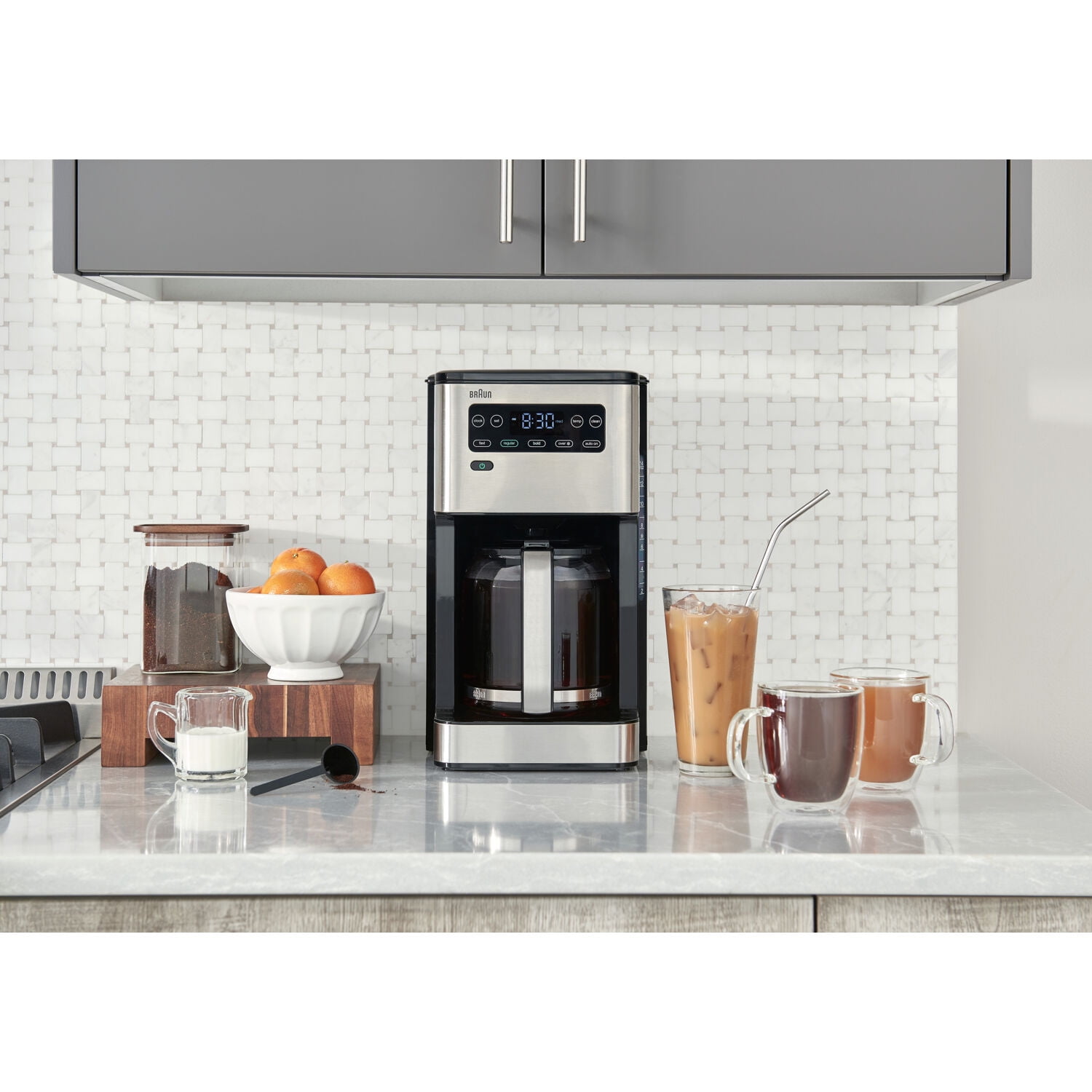 Exceptional in every way, the new PureFlavor Coffee Maker is the first-ever 14-cup machine from Braun. Powered by innovative Fast Brew technology, the machine rapidly brews 14-cups of coffee up to 20% faster*. The intuitive display features a touch-screen to select the brewing process. BrewChoice Plus offers four brewing options—fast, regular, bold or over ice; select your coffee of choice and the built-in brewing signal will alert you when it’s ready. Our refined brewing process retains the coffee’s full-bodied aromas even when poured over ice, so no sip ever tastes watered down; The stainless steel accented FlavorCarafe seals in the flavor, minimizing external air exposure to ensure the coffee’s rich, nuanced flavors are part of every cup. Keep your coffee warm for up to 4 hours on the SteadyTemp Warming Plate that lets you specify an ideal temperature – low, medium or high. A fully automatic 24-hour programmable timer means your much-needed first cup of coffee will be waiting for you when you want it. The front view-level water indicator clearly indicates the precise water levels required for every use. Pair that with the built-in charcoal water filter and you can rest assured no impurities will impact the taste of your fresh brew. And thanks to the automated descaling warning, the machine will inform you when it’s to be cleaned. As for the removable parts, place them in the dishwasher after every use — it’s that easy. The PureFlavor Coffee Maker makes savoring your favorite brew simple. *Compared to the Braun KF7170 on Bold