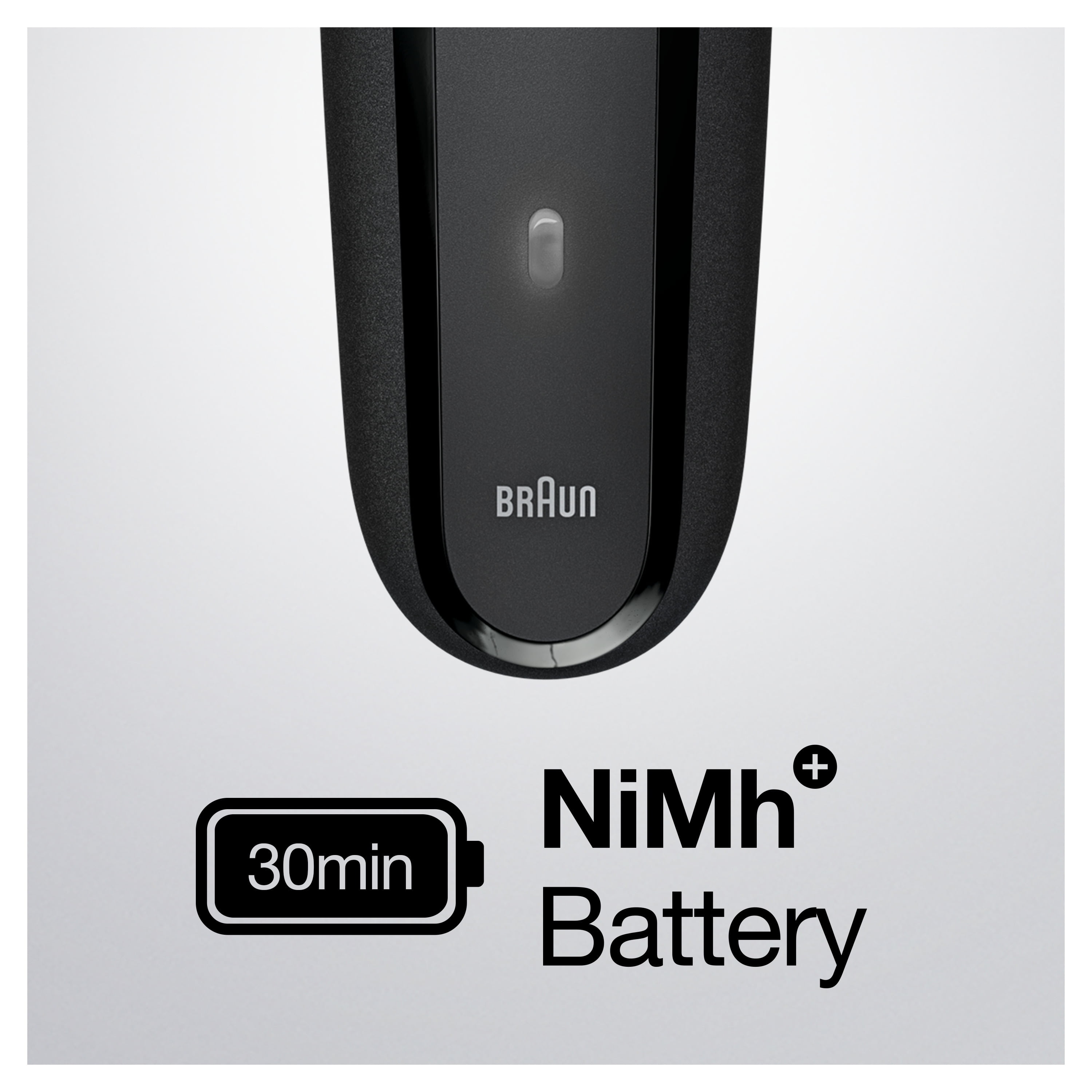 3 independently floating shaving elements adapt to your contours for greater comfort A specialized Micro Comb captures more hair in each stroke*, for a faster and gentler shave *Versus Braun Series 3. Tested on 3 day beard The thin precision head is uniquely designed to tackle hard-to-reach areas, like under the nose 2 rechargeable long-life NiMH batteries included. One charge provides 45 minutes of shaving with no performance loss. A 5 minute charge is enough for 1 shave Designed and engineered in Germany by Braun. Durable with ergonomic grip and waterproof up to 5 meters Contents: Braun Series 3 ProSkin shaver, protective cap, cleaning brush, smart plug for automatic 100-240 voltage adjustment