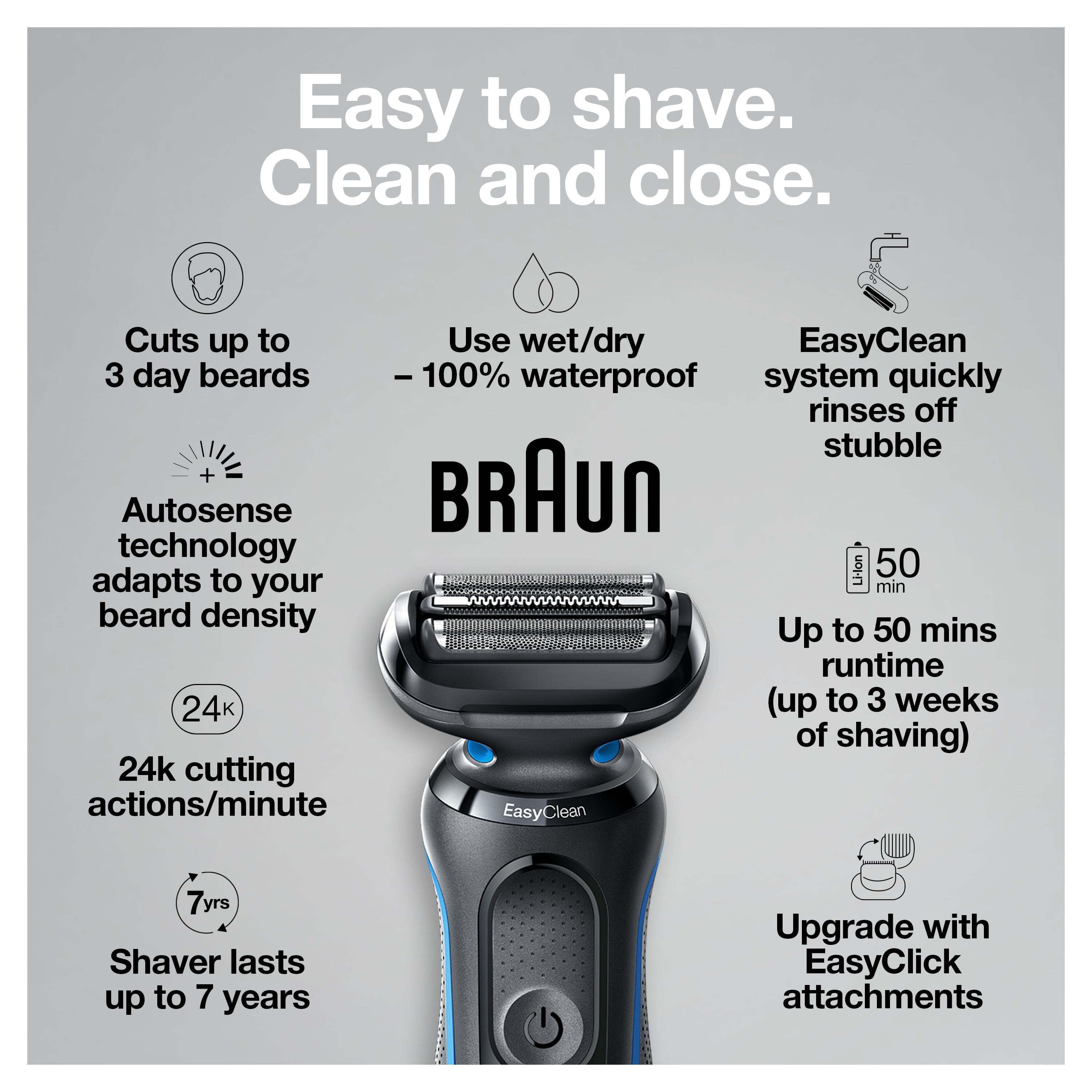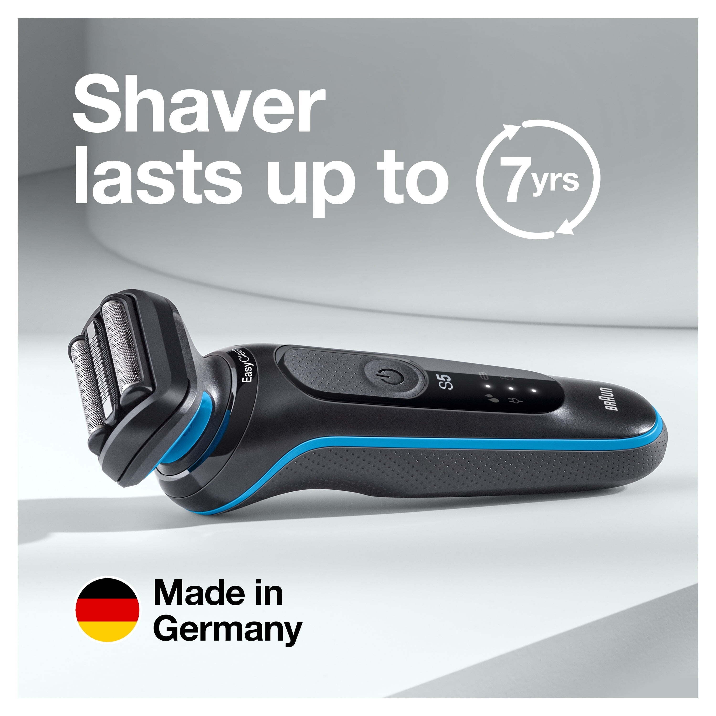Close shaving is made easy with the Braun Series 5 Electric Shaver. This wet and dry foil shaver features three flexible blades that adapt fluidly to your facial contours. Plus, AutoSense technology reads and adapts to your beard, capturing and cutting more hair in every shave. For quick and easy cleaning, this Braun Series 5 Shaver has an EasyClean system that allows you to thoroughly rinse stubble off your electric razor without the need to remove the shaver head. The included precision beard trimmer attachment makes mustache and sideburn trimming simple-and with the convenient EasyClick design, you can easily swap out shaver attachments to accommodate a variety of grooming needs. Braun Series 5 Electric Shavers for men use a powerful Li-Ion battery that provides up to three weeks of shaving (50-minute runtime) and a 5-minute quick charge option. These wet and dry shavers are 100% waterproof and can be used with foam, gel or even under the shower. Each shaving kit includes a Smart Plug charger for automatic 100 to 240 voltage adjustment. All Series 5 electric razors for men are made in Germany with premium craftsmanship.