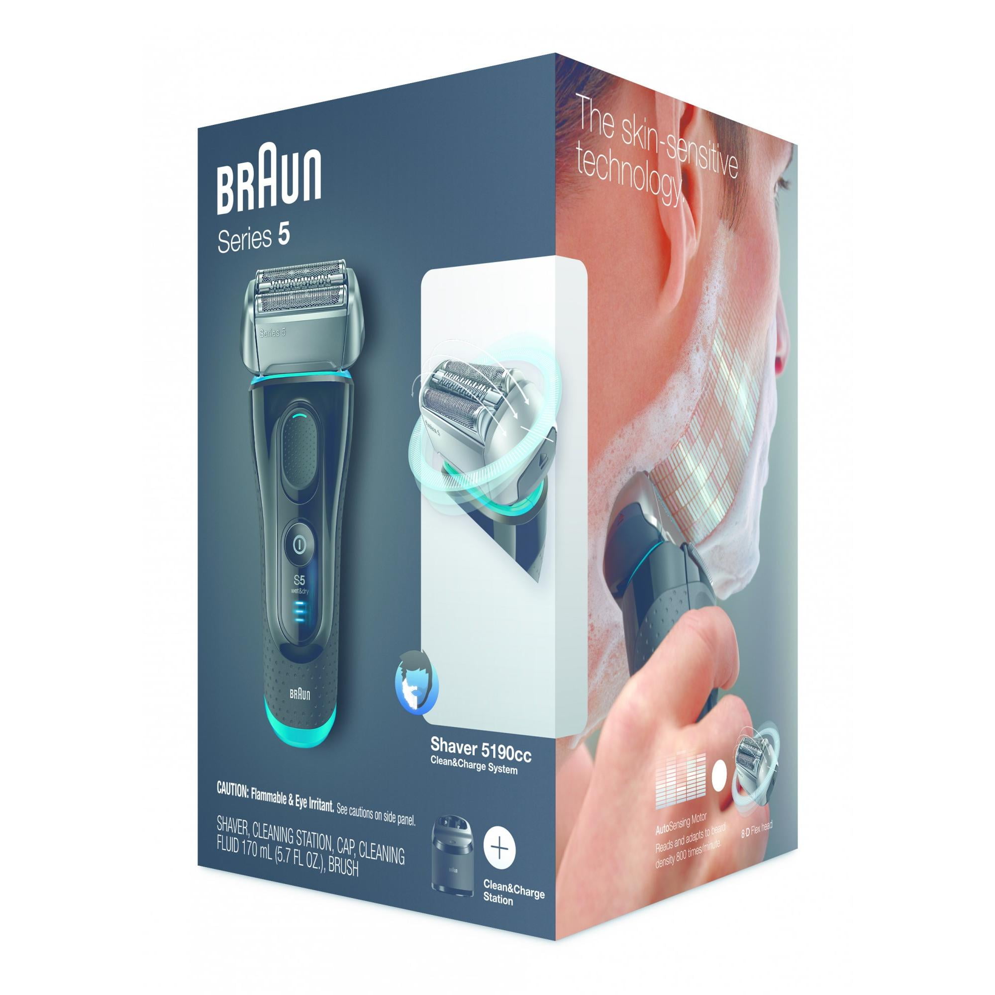 Braun Series 5 5190cc Men’s Electric Foil Shaver with Clean & Charge System, Wet and Dry, Pop Up Precision Trimmer, Rechargeable and Cordless Razor: Electric shaver with skin sensitive technology for maximum performance and excellent skin comfort AutoSensing motor for efficient shaving in every stroke, even with dense beards 8-Direction Comfort flex head for constant skin contact, even in difficult areas 100% waterproof for a refreshing shave with water, foam, gel, or even under the shower Clean & Charge Station cleans, lubricates and dries shaver hygienically