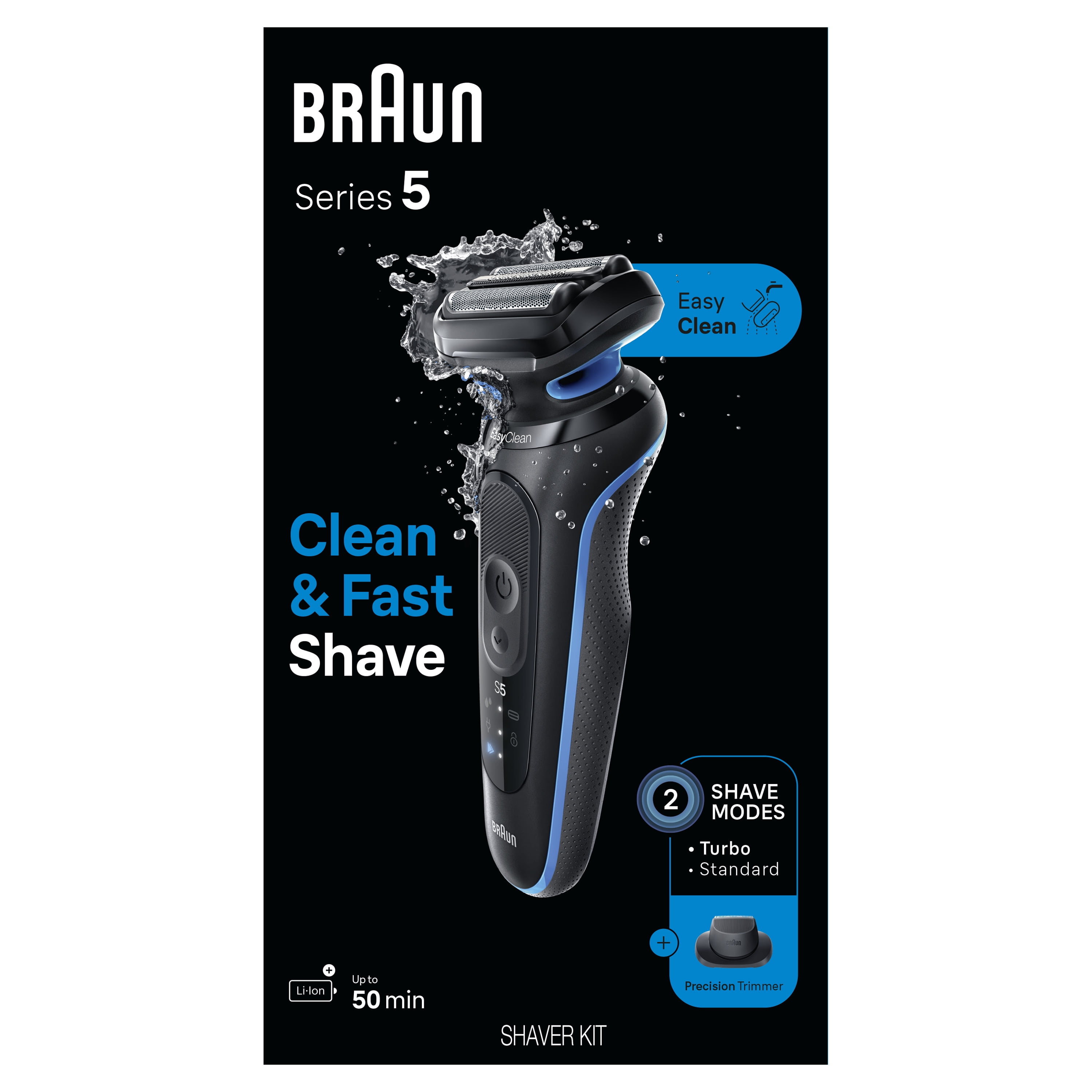 CLEAN AND FAST SHAVE: Braun Series 5 Shaver for a clean and fast shave. Comfortable on your skin 3 FLEXIBLE BLADES: The foil shaver adapts to your unique face contours to deliver a close shave while also protecting your skin 2 SHAVE MODES: Now with Standard and Turbo mode for an extra fast shave with up to 25,500 cutting actions per second BUILT TO LAST: Engineered in Germany, this Braun wet and dry electric shaver uses a Li-Ion battery that lasts up to 50 minutes INCLUDES: Precision Trimmer EasyClick attachment