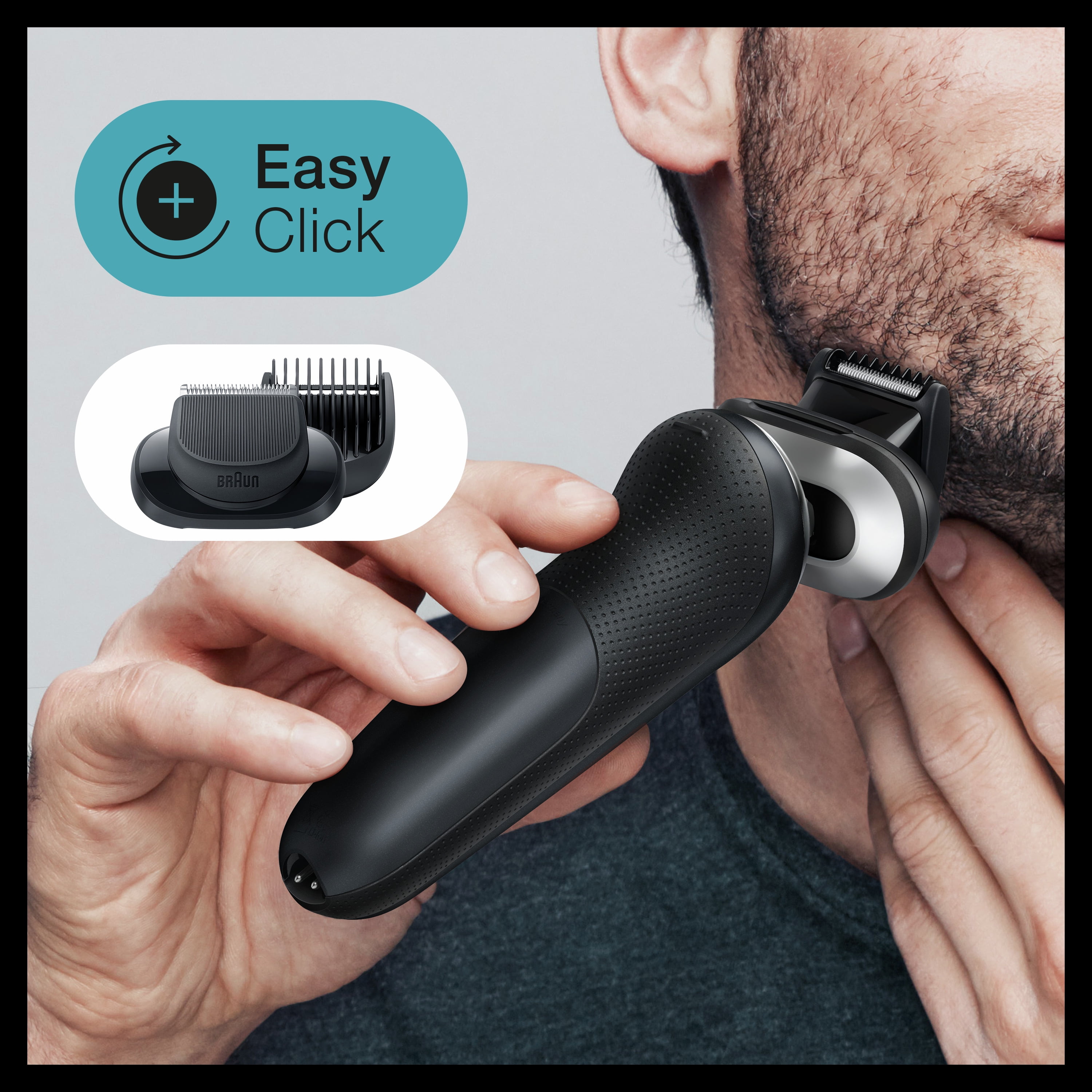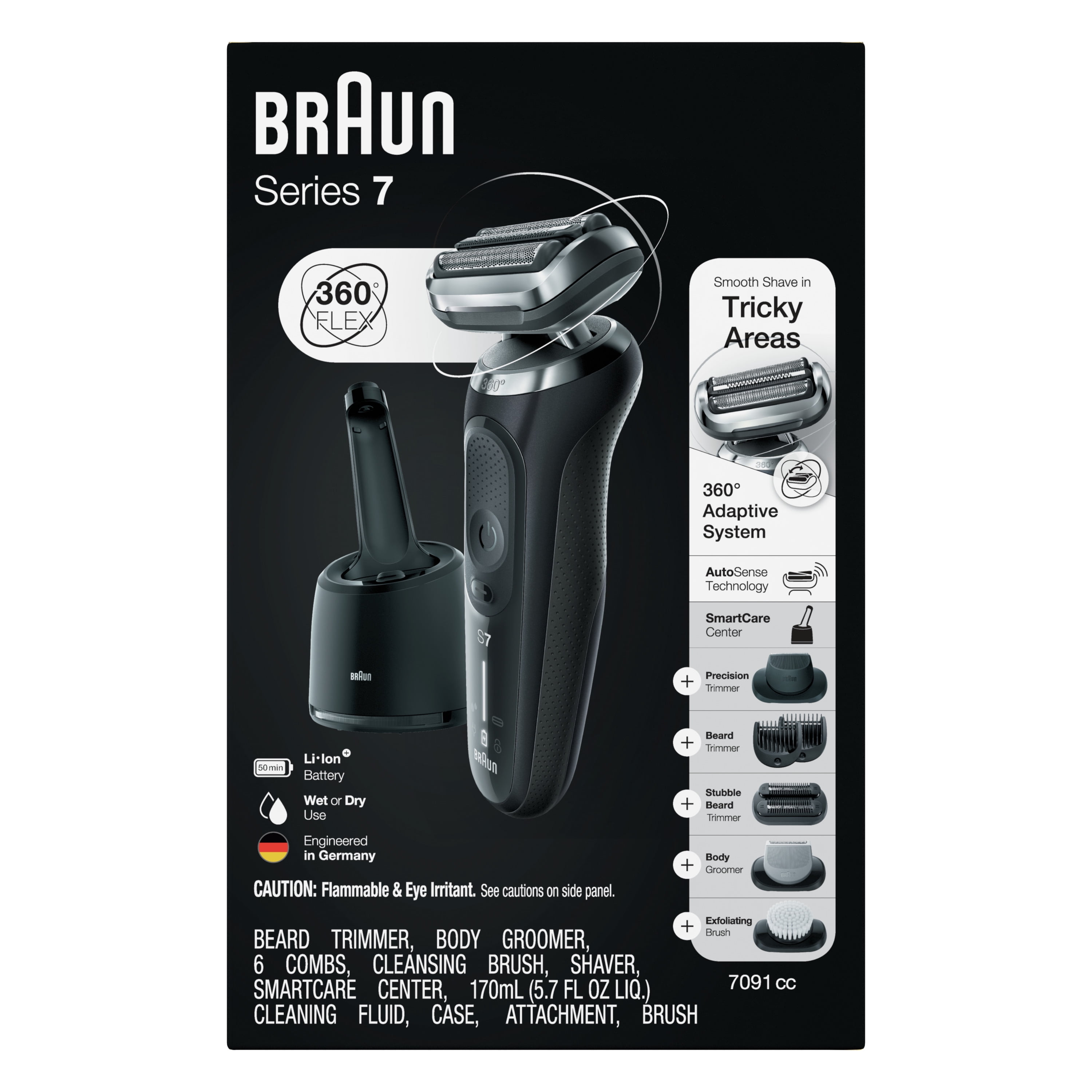 Braun Series 7 Flex electric shaver with Stubble Beard Trimmer, Body Groomer and Exfoliating Brush for men with 360° adaptation for a smooth shave. Features Auto Sense technology that reads and adapts to your beard density, removing more hairs in every stroke. The Li-Ion Battery provides up to 3 weeks of shaving and a 5 min quick charge. This men’s electric razor is 100% waterproof for Wet & Dry use. Includes a 4in1 SmartCare center, and a Beard Trimmer attachment. Box includes · 1x Series 7 Electric razor for men – Black · 1x SmartCare center · 1x Beard Trimmer attachment · 1x Stubble Beard Trimmer attachment · 1x Body Groomer attachment · 1x Exfoliating Brush attachment · 1x Travel case · 1x Smart plug for automatic 100-240 voltage adjustment · 1x Cleaning Brush