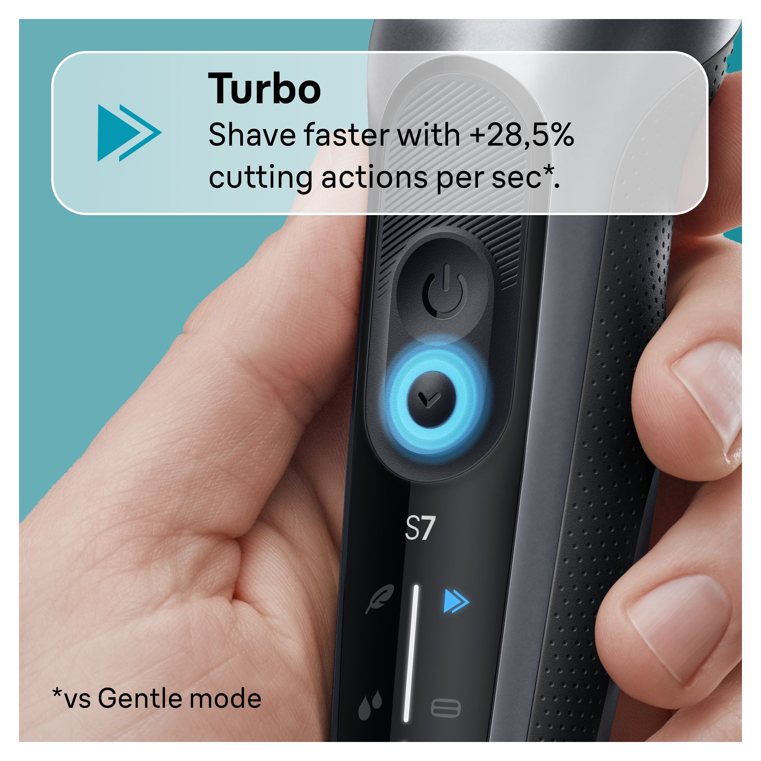 close shave, even in tricky areas (vs previous Braun Series 7) 6 FLEXIBLE BLADES: The foil shaver adapts to your unique face contours to deliver a close shave while also protecting your skin 6 SHAVE MODES: Select Turbo mode for an extra fast shave, Gentle mode for a gentle shave on sensitive skin, or Standard mode for a balanced shave. Customize your shav lasting Li-Ion battery, now up to 18% longer with Gentle Mode QUALITY GUARANTEED: This wet and dry electric shaver’s durable design is made in Germany and built to last INCLUDES: Precision Trimmer and Pouch