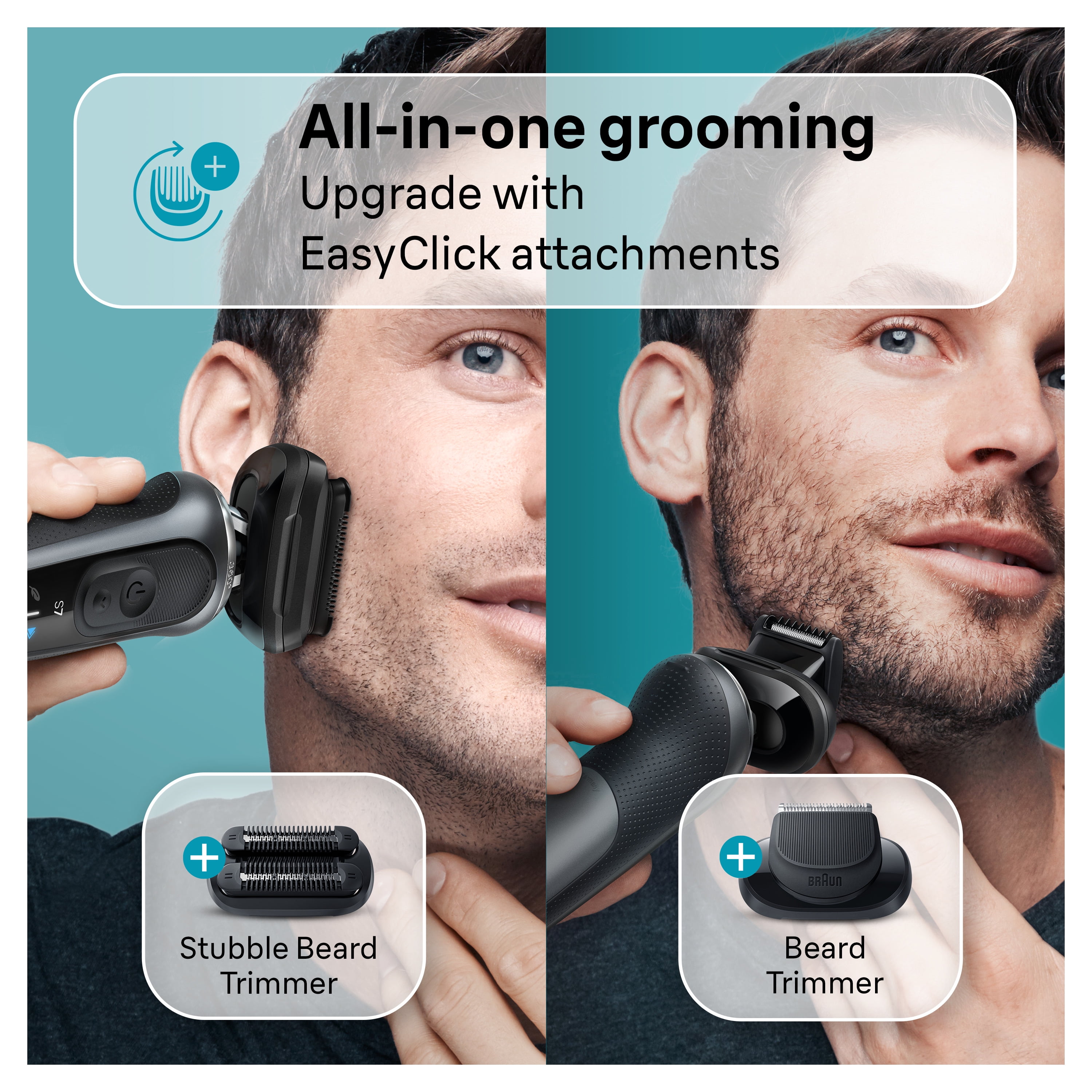 Braun Series 7 7185cc electric shaver for men delivers a close shave faster, thanks to the floating 360 degrees Flex Head that adapts to your contours for an extremely close shave, even in tricky areas. To easily customize your shave, select Turbo mode for an extra fast shave, Gentle mode for a gentle shave on sensitive skin, or Standard mode for a balanced shave. Easily upgrade your shaver with different attachments for all your grooming needs. Includes a SmartCare center for a shaver like new, every day. Made to adapt to your shaving needs, this waterproof electric shaver features AutoSense technology that adjusts power to your beard density. The men’s shaver is made in Germany for guaranteed quality. Box includes: 1x Series 7 shaver, SmartCare Center, Cleaning Brush, Stubbler and Beard Trimmer with attachments.