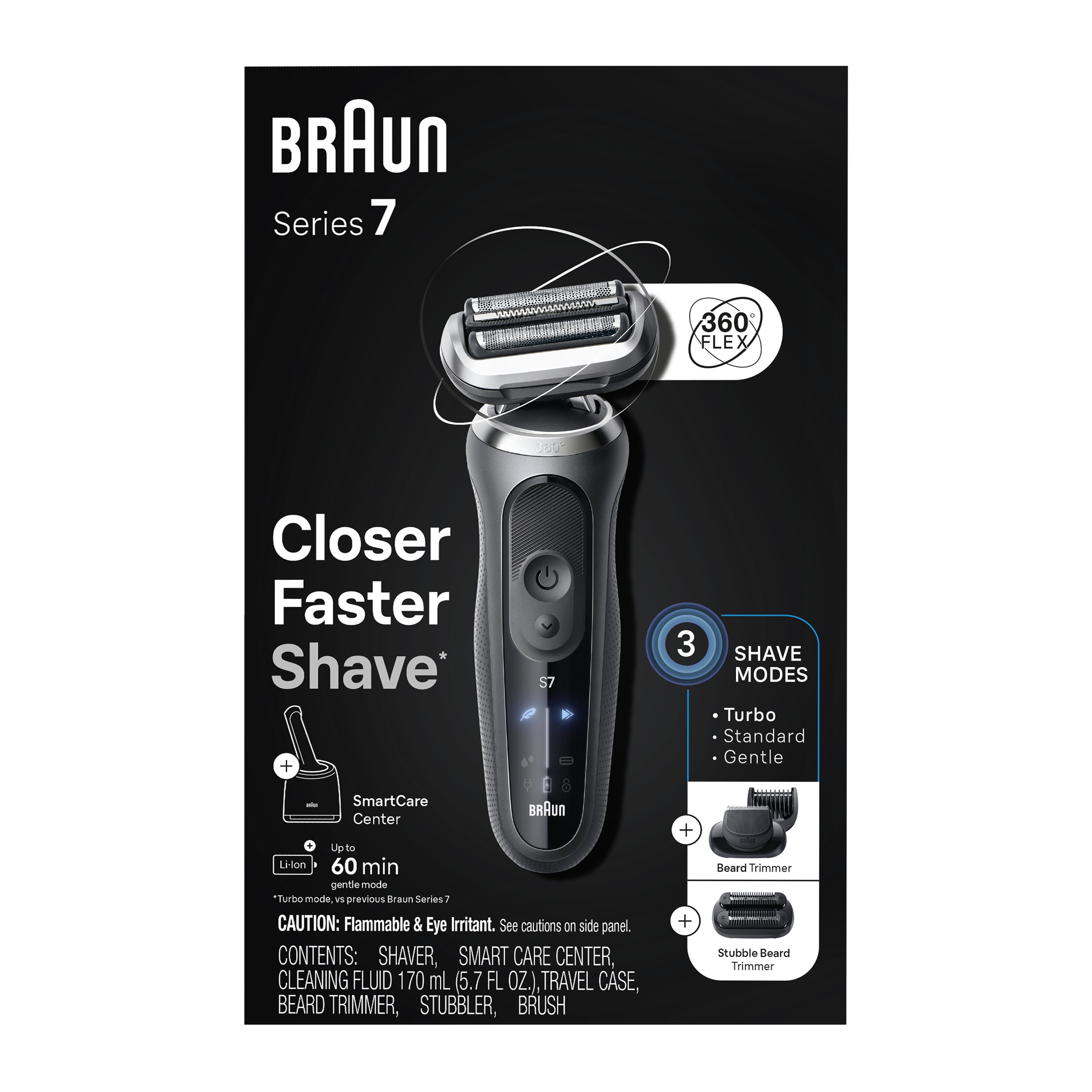 FOR A CLOSE SHAVE, FASTER*: the 360 degrees Flex Head adapts to your contours for an extremely close shave, even in tricky areas (*vs previous Braun Series 7) 3 FLEXIBLE BLADES: The shaver adapts to your unique face contours to deliver a close shave while also protecting your skin 3 SHAVE MODES: Select Turbo mode for an extra fast shave, Gentle mode for a gentle shave on sensitive skin, or Standard mode for a balanced shave. Customize your shave BUILT TO LAST: 100% waterproof so perfect for wet & dry use. With a long-lasting Li-Ion battery, now up to 18% longer with Gentle Mode QUALITY GUARANTEED: this electric shaver’s durable design is made in Germany and built to last INCLUDES: Smartcare Center, Beard Stubbler, and Beard Trimmer attachments