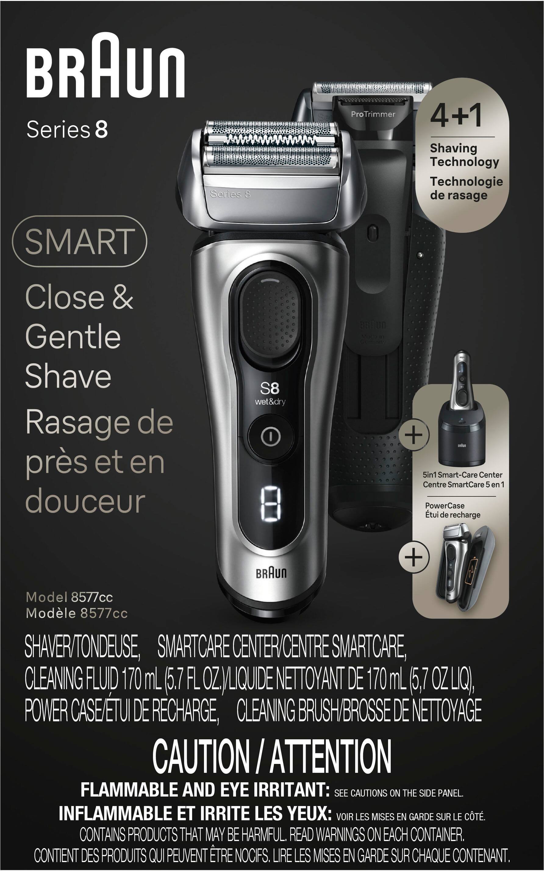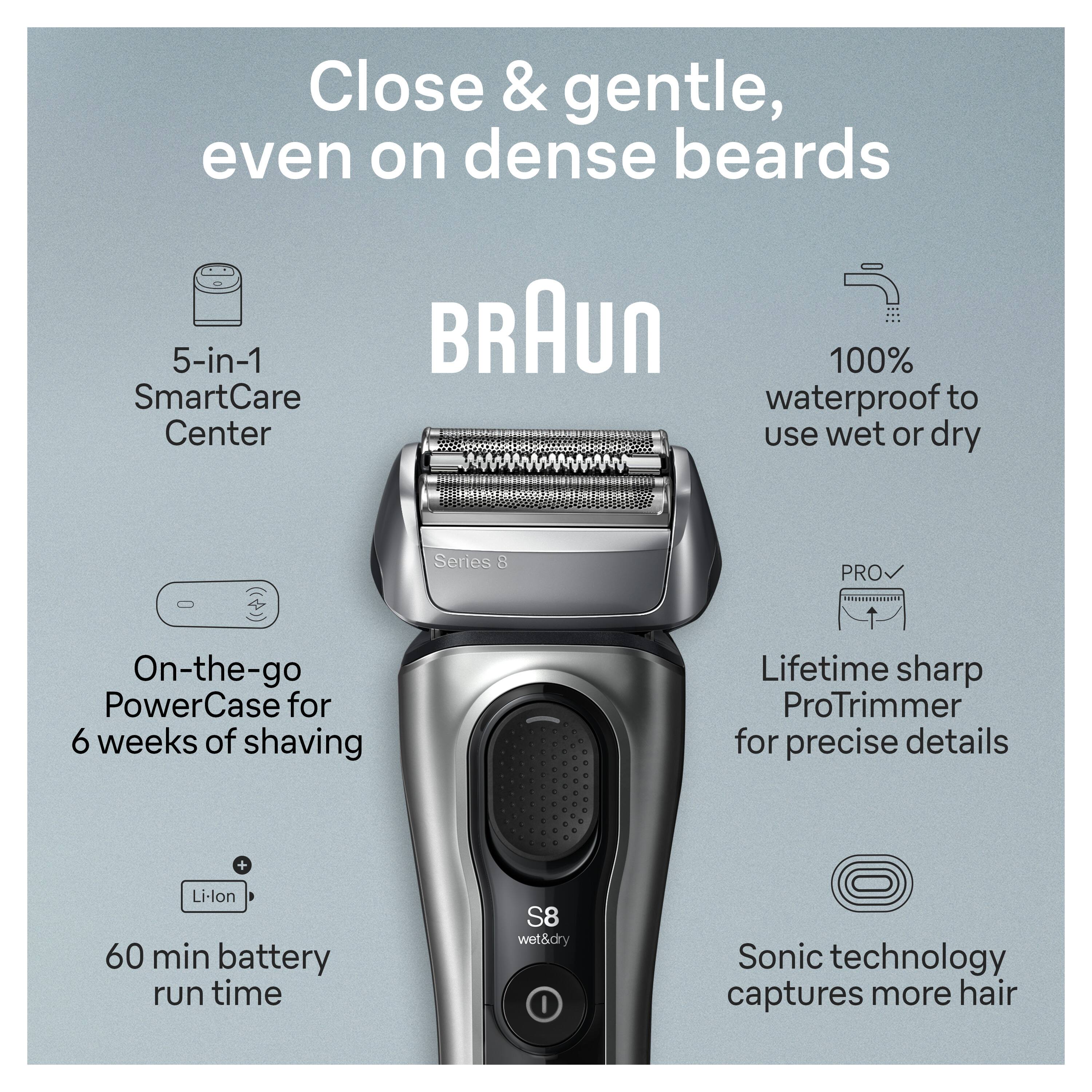 Level-up your shave with Braun’s upgraded Series 8 electric razor. This waterproof foil shaver delivers a close and gentle shave even on the most dense beards. Get a powerful shave on any beard density with 4 sonic-powered shaving elements. The ProTrimmer perfectly cuts even the tricky hair— sideburns, mustache and under nose. The razor has a 40° swiveling head that adapts to any facial contours, ensuring closeness & skin comfort even in tricky areas. 100% Made in Germany. 100% waterproof. Powered by a 60min-runtime Li-Ion battery. For wet or dry use. Comes with the 5in1 SmartCare center for a shaver like new every day.Box Includes:1x Electric Shaver1x 5in1 SmartCare Center1x PowerCase1x Cleaning Brush