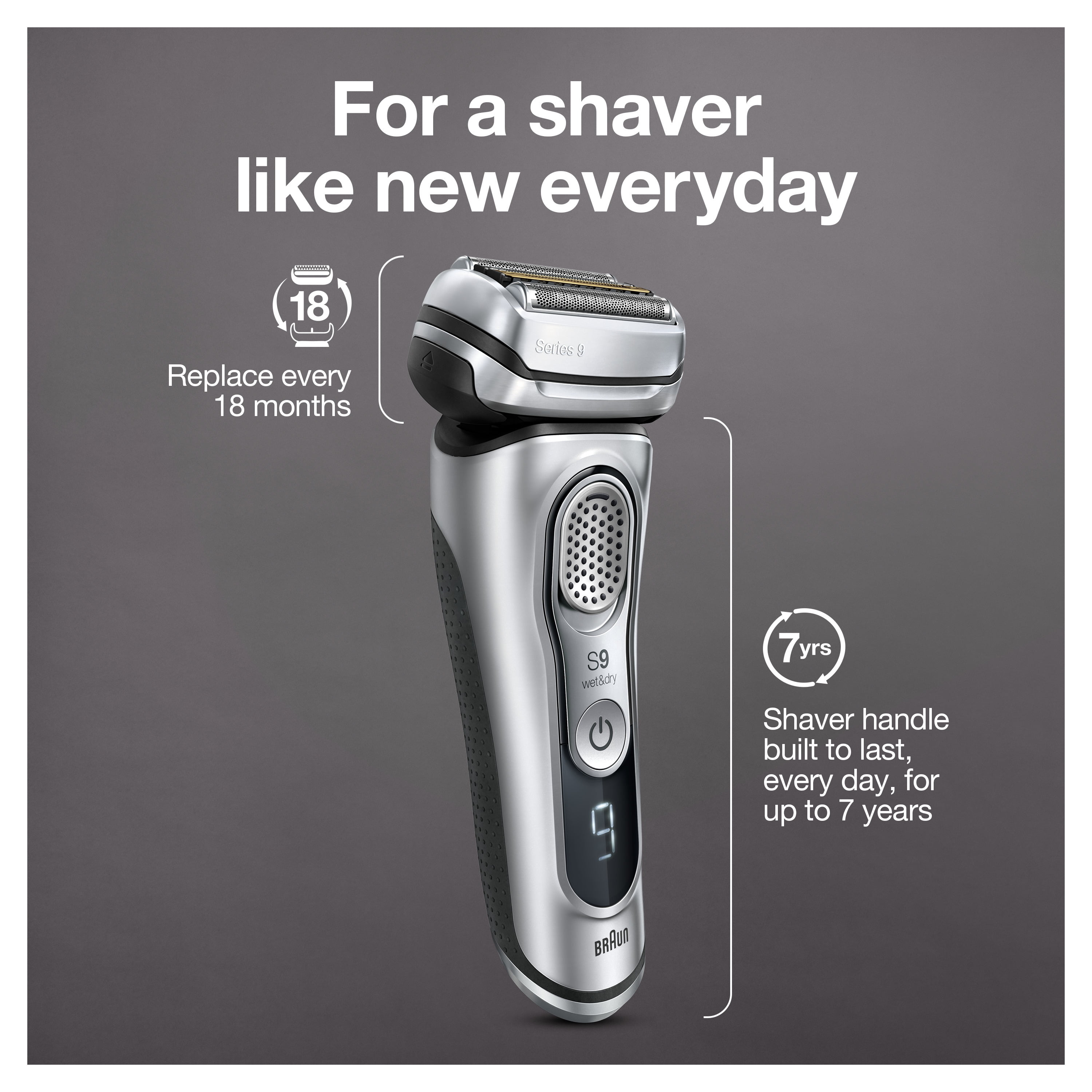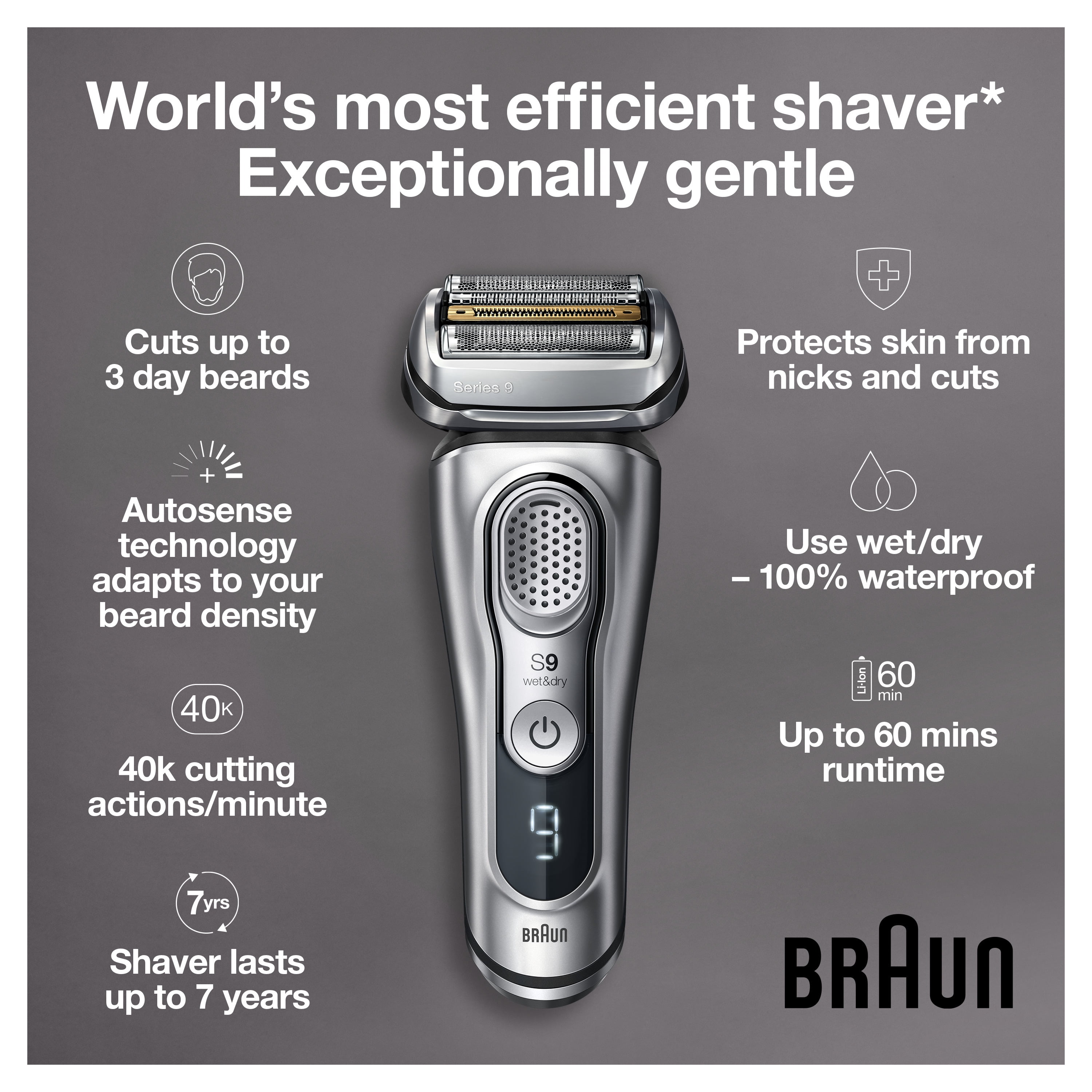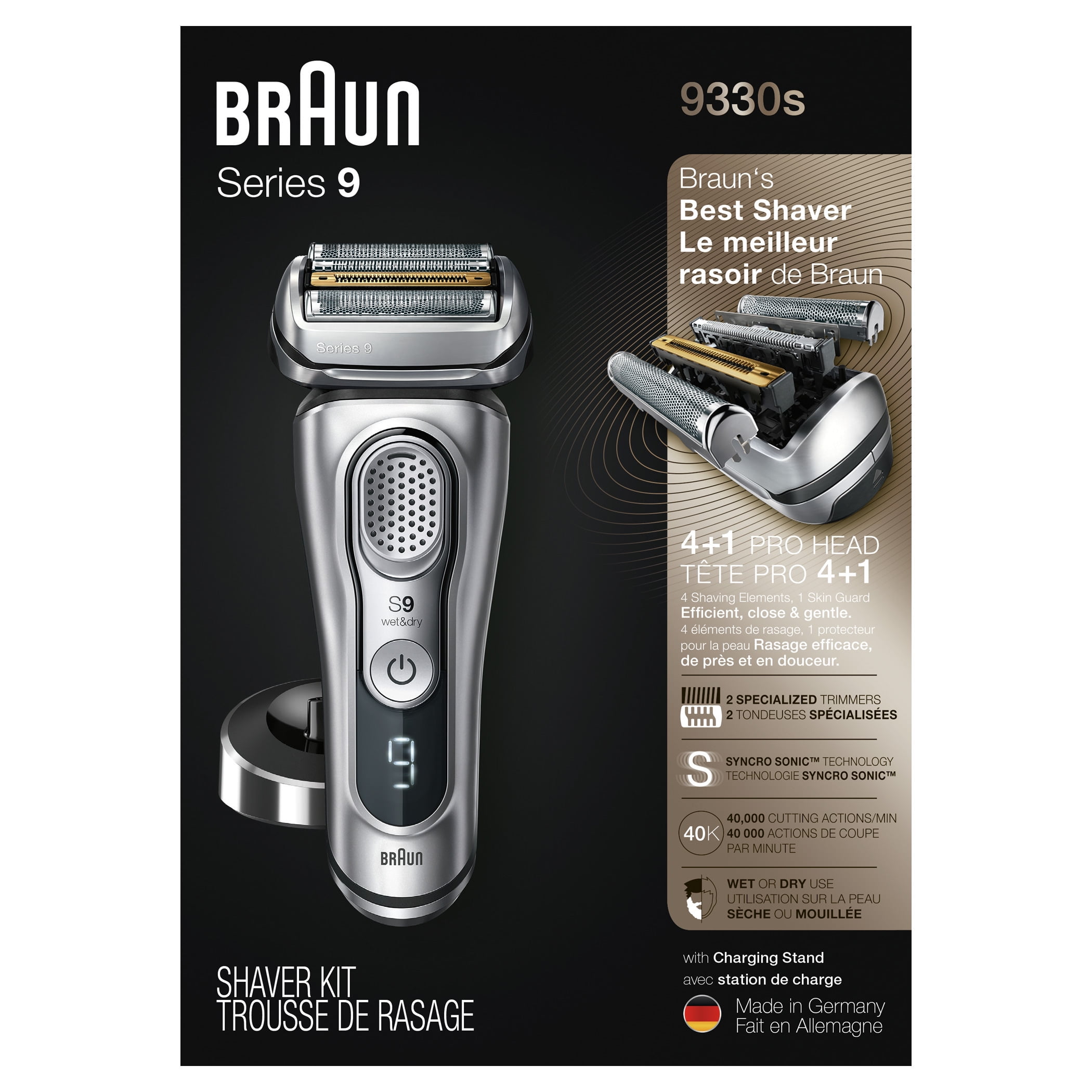 Braun Series 9 9330s Men’s Electric Shaver with Charging Stand, Travel Case, Smart Plug and Cleaning Brush World’s most efficient electric shaver* features 5 shaving elements to get more hair in one stroke than any other shavers This face and beard shaver intelligently responds to your face contours and beard density, giving you more skin contact for a more thorough shave Battery on rechargeable shavers for men lasts 20% longer** (60-minute full charge) or you can quick-charge for one shave in only 5 minutes Wet and dry men’s electric razors are 100% waterproof; easy to clean; and can be used with foam, gel or even under the shower Titanium-coated electric razors for men are extremely durable and resistant to corrosion *Tested on 3-day beard vs. leading premium tier products **vs. previous Series 9