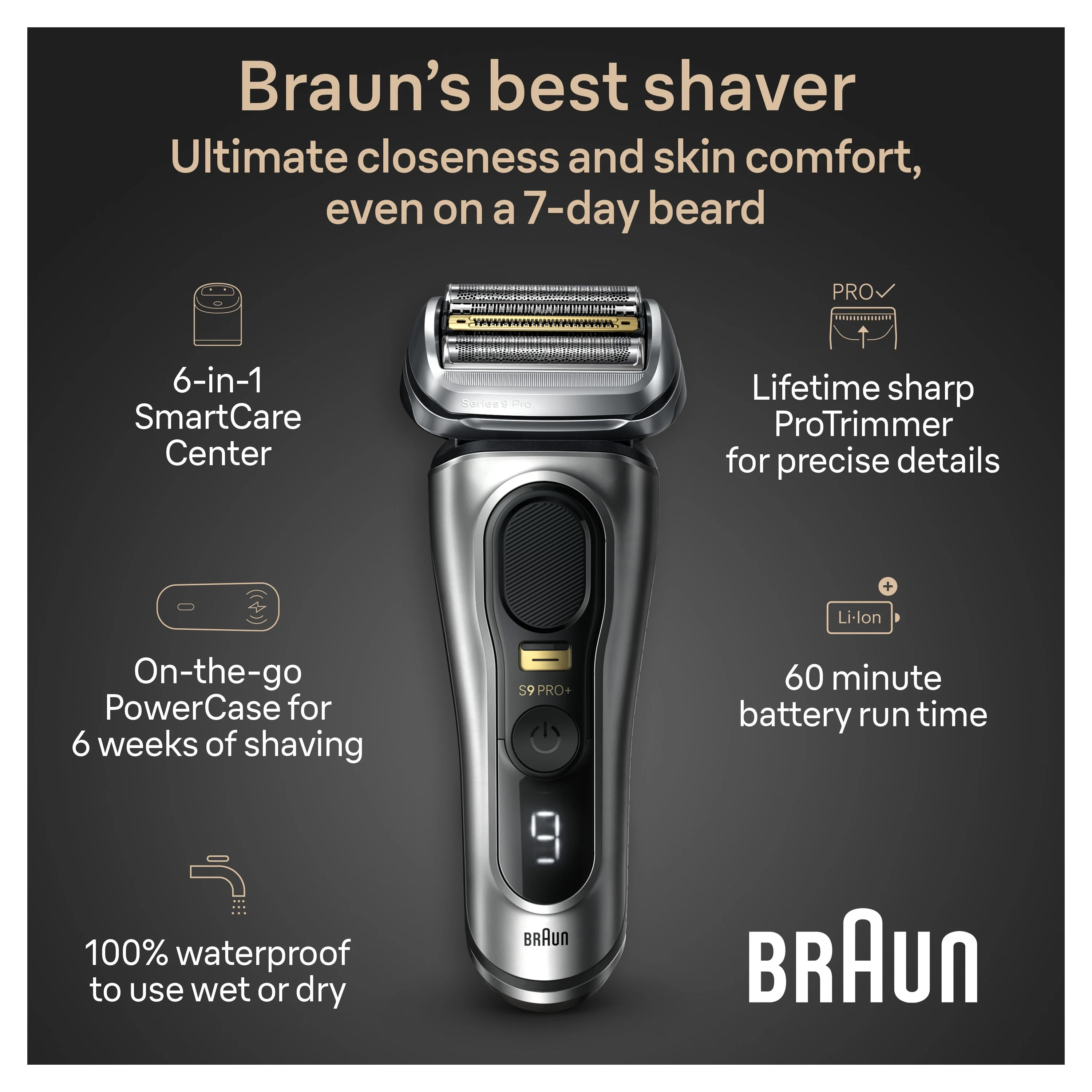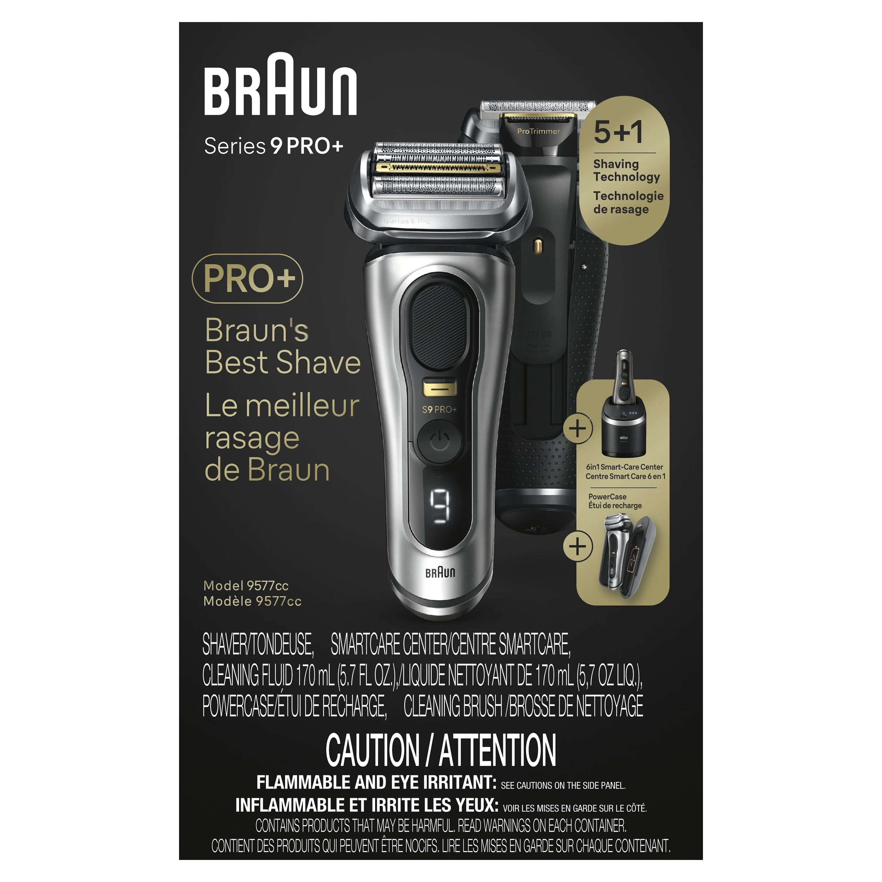 Braun Series 9 PRO+ 9577cc Men’s Electric Shaver with built-in Precision ProTrimmer, 6-in-1 SmartCare Center, PowerCase and Cleaning Brush NO MATTER 1, 3, OR 7-DAY BEARD: Series 9 PRO+ electric shaver for men features 5 perfectly synchronized shaving elements that deliver exceptional efficiency and skin comfort, even on the longest and trickiest hair in every stroke ULTIMATE PRECISION EVEN ON TRICKY HAIR: Built-in precision ProTrimmer on this beard shaver is enhanced with surgical-grade steel and gives maximum cutting efficiency even on mustache, sideburns and under nose PREMIUM ACCESSORIES: This electric razor includes a 6in1 SmartCare Center that cleans, lubricates, and dries at the touch of a button-plus a PowerCase, a charging razor travel case that gives up to 60 minutes of shaving BUILT TO LAST FOR YEARS: Made in Germany, this durable cordless shaver for men is titanium-coated for resistance to corrosion and 100% waterproof with a powerful 60-minute Li-Ion battery runtime