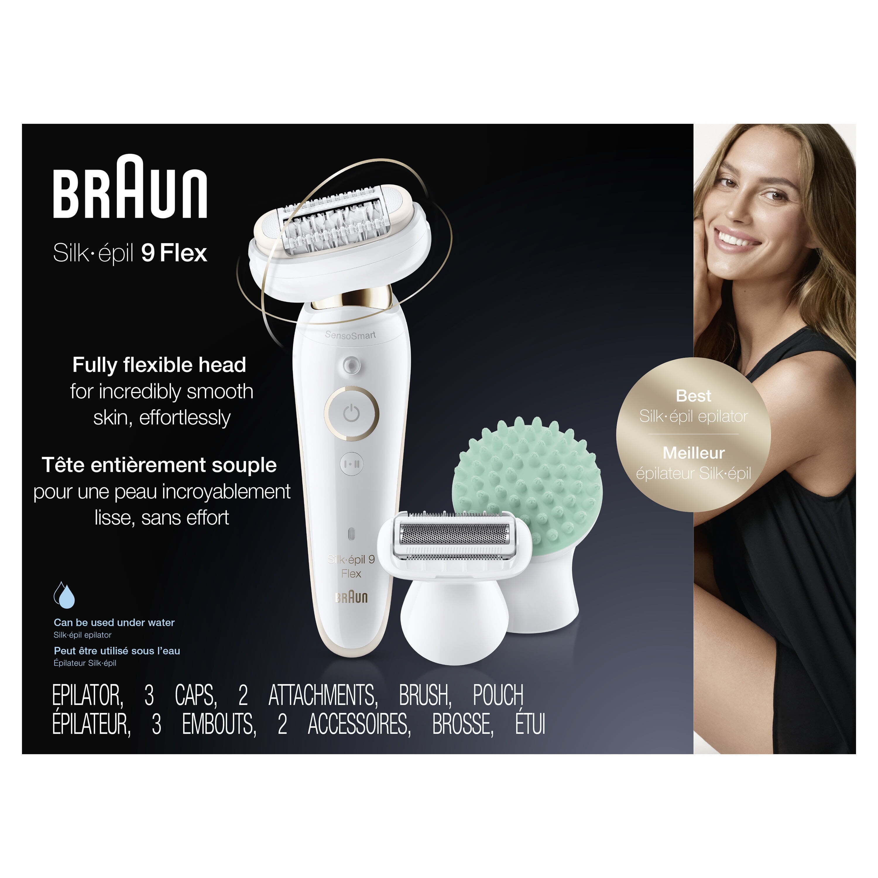 EFFORTLESS: World’s 1st epilator for women with a fully flexible head, for easier hair removal MULTIFUNCTION: Includes shaver head, which can be used instead of epilator head in sensitive areas CONVENIENT: Ergonomic handle with anti-slip grip, perfect for epilating in the shower BETTER RESULTS: Senso-Smart technology applies just the right amount of pressure and can be used underwater for more comfort SMOOTH SKIN: Micro-Grip tweezer technology (40 tweezers) provides smooth skin for weeks, not days Braun