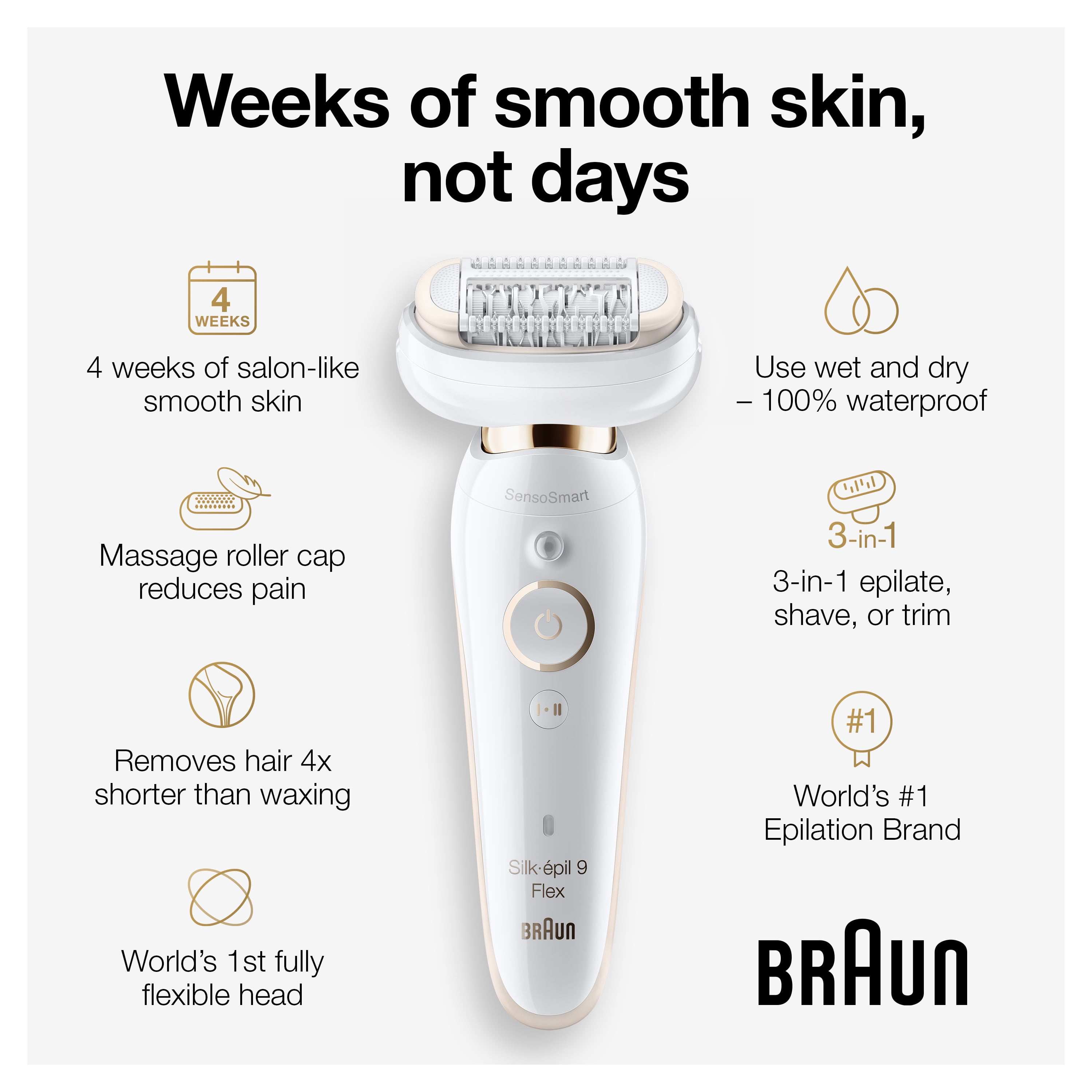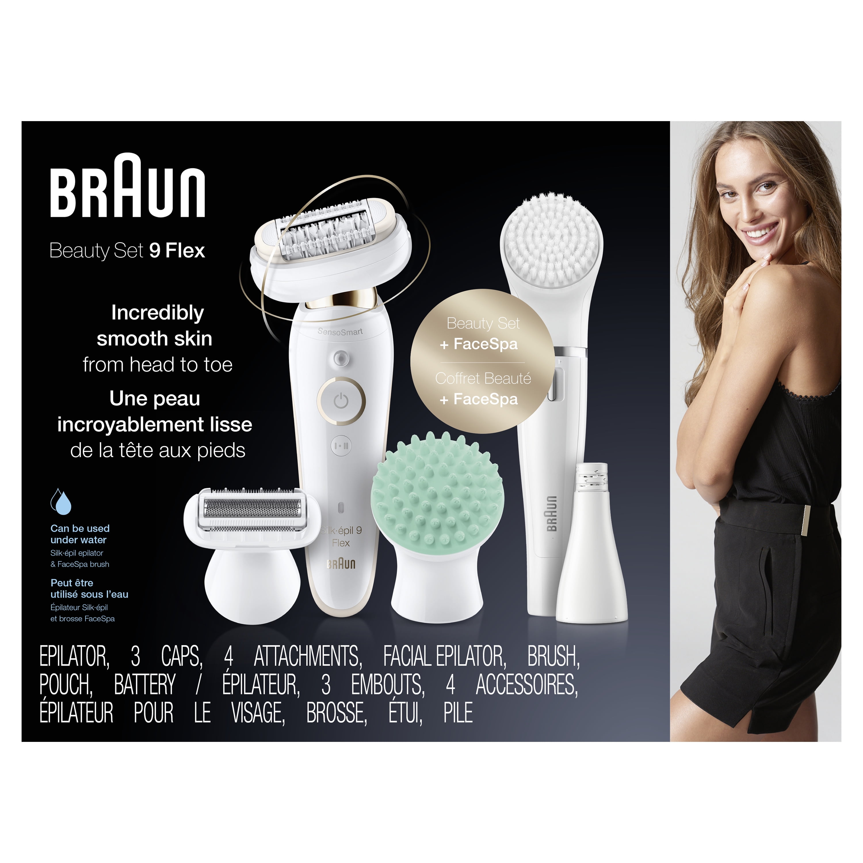 EFFORTLESS: World’s 1st epilator for women with a fully flexible head, for easier hair removal VERSATILE: Includes Face Spa with epilator, cleansing brush and massage pad attachment CONVENIENT: Ergonomic handle with anti-slip grip, perfect for epilating in the shower BETTER RESULTS: Senso-Smart technology applies just the right amount of pressure and can be used underwater for more comfort SMOOTH SKIN: Micro-Grip tweezer technology (40 tweezers) provides smooth skin for weeks, not days Braun Includes 1 AA Battery