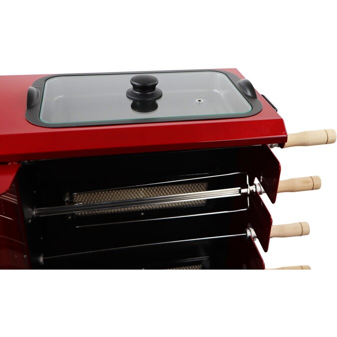 - Includes 4 single skewers, 1 triple skewer, and grease drippings tray