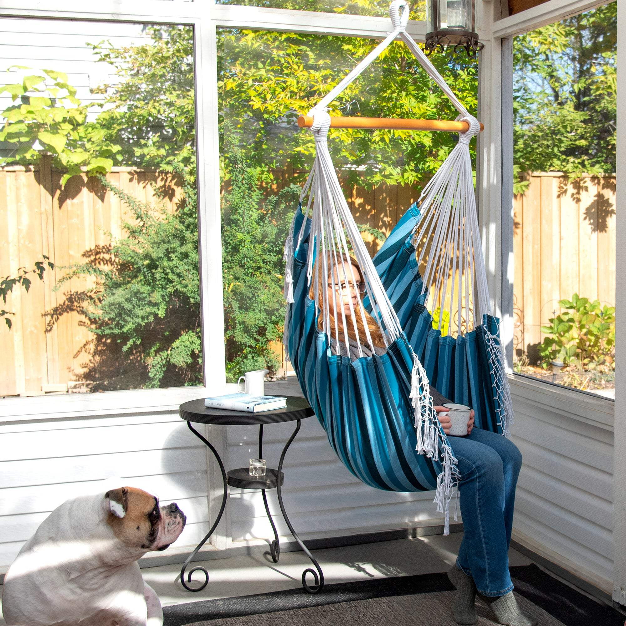 Brazilian Style Cotton Hammock Chair in Blue Lagoon Vivere’s Brazilian Hammock Chair offers unmatched comfort and style. Made from tightly woven 100% cotton, it’s soft, durable, and perfect for lounging indoors or outdoors. Available in a selection of vibrant colors, each chair features a hand-crocheted fringe for a chic Bohemian vibe. The extended fabric supports your back, while the included wooden spreader bar and sling make setup simple. With its compact footprint, this hammock chair transforms any space into a relaxing retreat. Hooks sold separately. Includes: Cotton Hammock Chair with Spreader Bar and Hanging Ropes Product Specs Spreader Bar Length: 76 cm (30in) Seat Depth: 61 cm (24 in) Total Height: 183 cm (72 in) Capacity: 113 kg (250 lb) Fabric: Cotton Frame: Beech Wood 1-Year Limited Warranty Straps Sold Separately