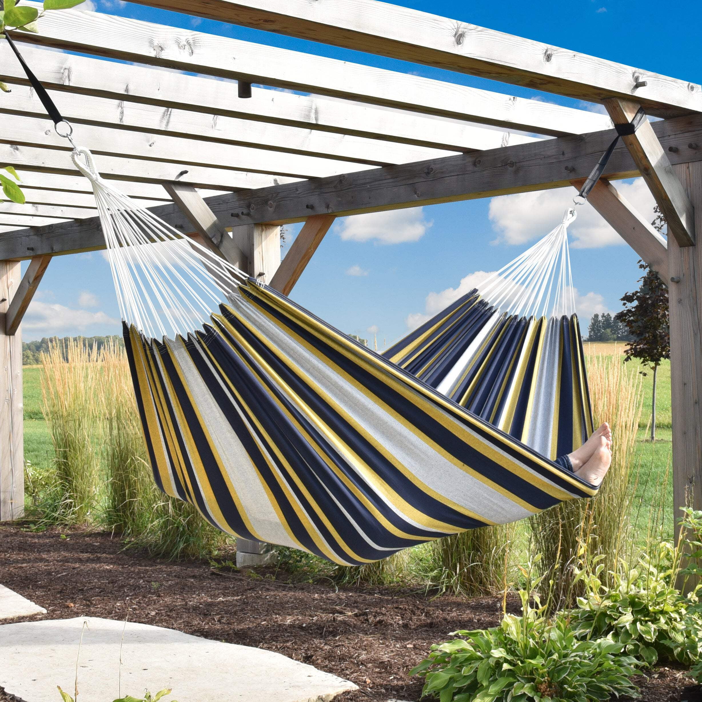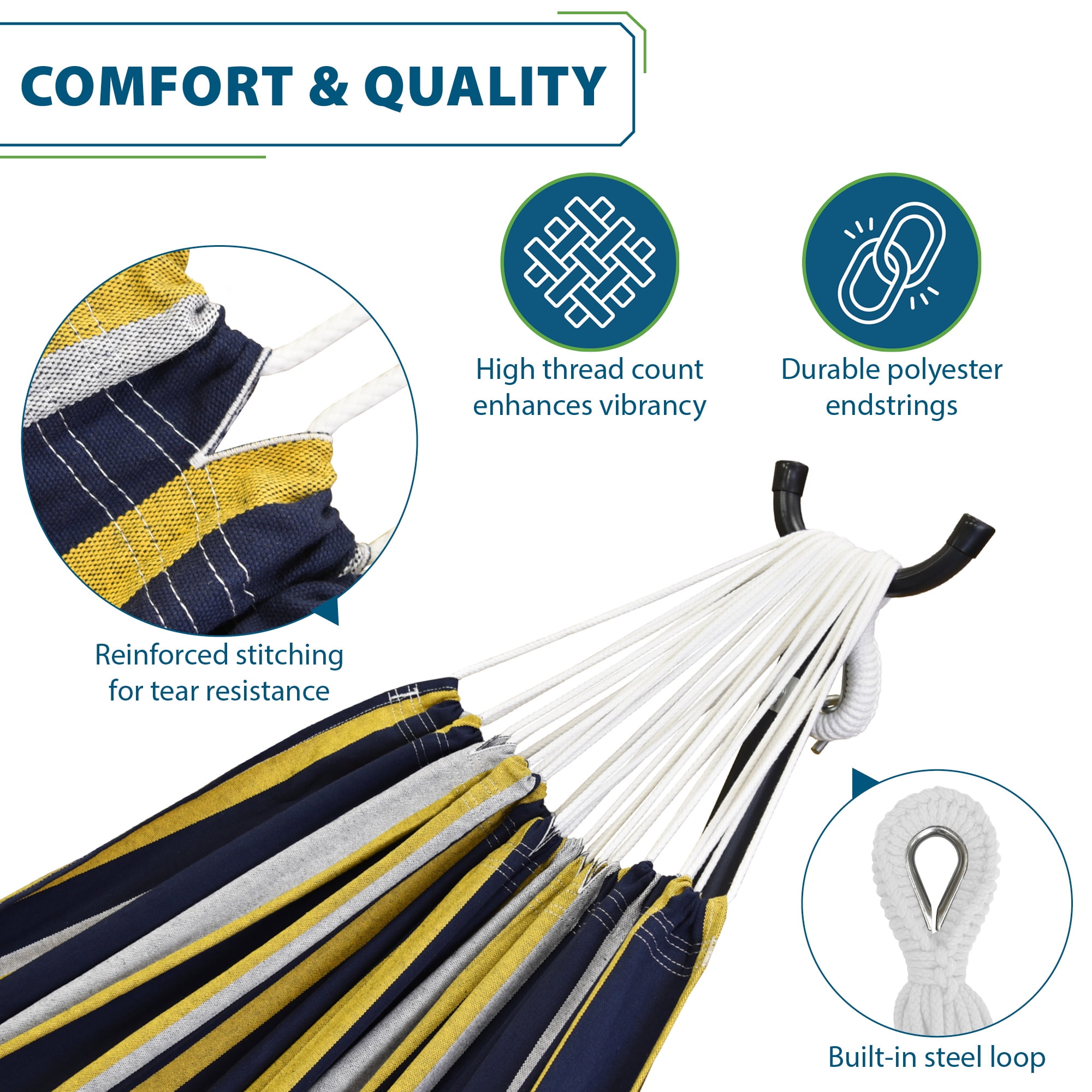 Stunning colours make this hammock the highlight of the yard Pairs with Eco-Friendly Tree Straps or Ultra-Lite Tree Straps to expand your relaxation zone 100% cotton to give you the comfort of indoors while appreciating the lively outdoors Tightly woven and durable fabric; delicate on the skin, strong to the elements