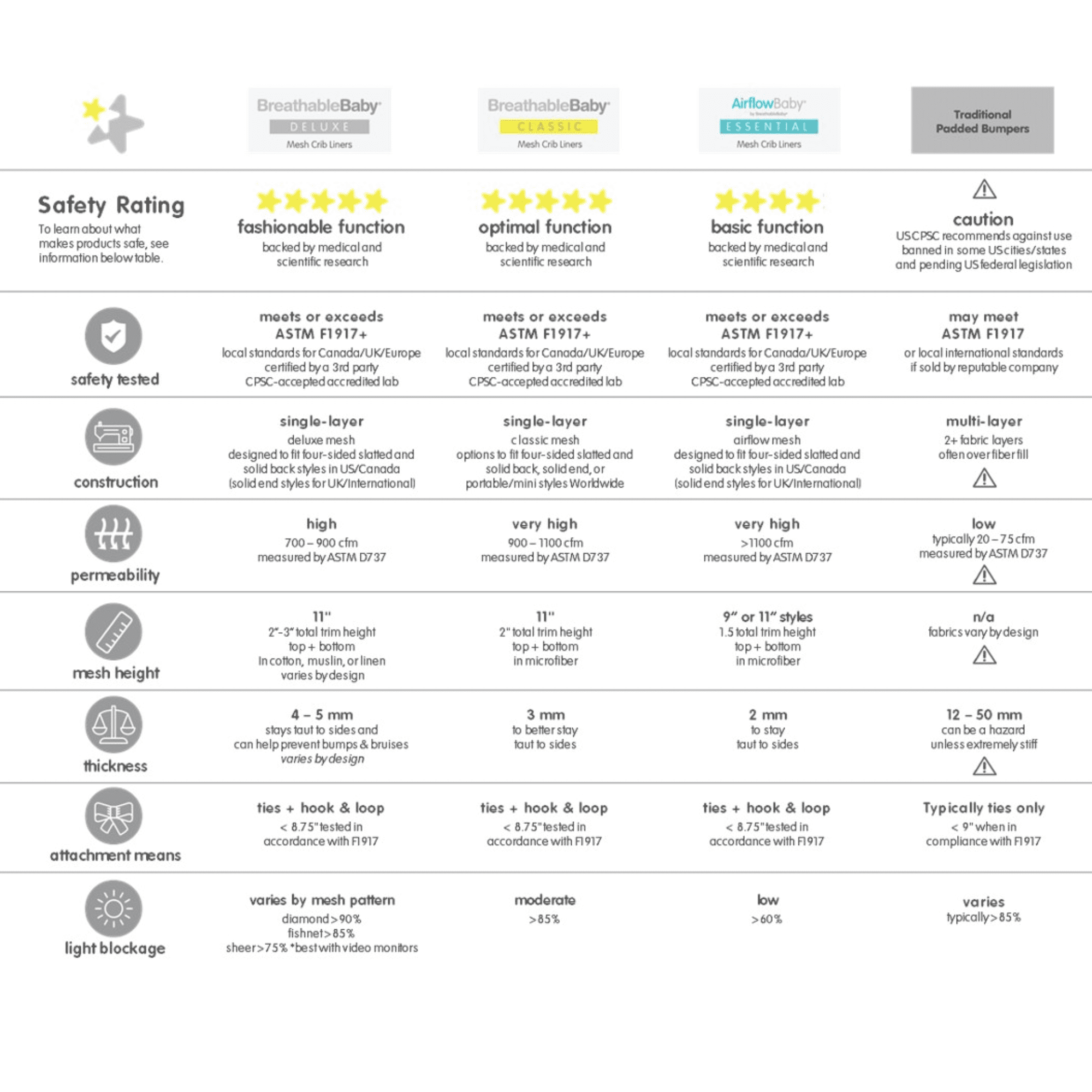 3MM CLASSIC MESH WITH 85% LIGHT BLOCKING RATING: Constructed from 3 mm mesh with A.C.T. Air Channel Technology for unrestricted airflow. 100% polyester. 1″ (2.54 cm) trim on top and bottom. Machine washable. FITS FULL-SIZE STYLES WITH A 52″ x 28″ (132 CM x 71 CM) MATTRESS: Install long 11″ x 111″ (28 cm x 282 cm) and short 11″ x 82″ (28 cm x 208 cm) panels to cover 4 sides or only the long panel to cover 3 sides. Do not use on solid end styles or mini cribs. SAFETY TESTED & TRUSTED: From BreathableBaby, the original breathable mesh liner with millions sold since 2002. Independently tested for safety to comply with ASTM F1917 for infant bedding. Contains no added chemicals, flame retardants or formaldehyde. HELPS KEEP ARMS AND LEGS SAFELY INSIDE WITHOUT THE RISK OF RESTRICTED AIRFLOW: A single layer of breathable mesh allows exhaled air to pass through the fabric and mitigates risks associated with padded “crib bumpers” (banned in the US in 2022). EASY TO INSTALL: Adjusts to fit with hook and loop. Tuck the bottom fabric trim below the top edge of the mattress and secure all fastenings before use. Review instruction manual and installation video or contact customer care for assistance.