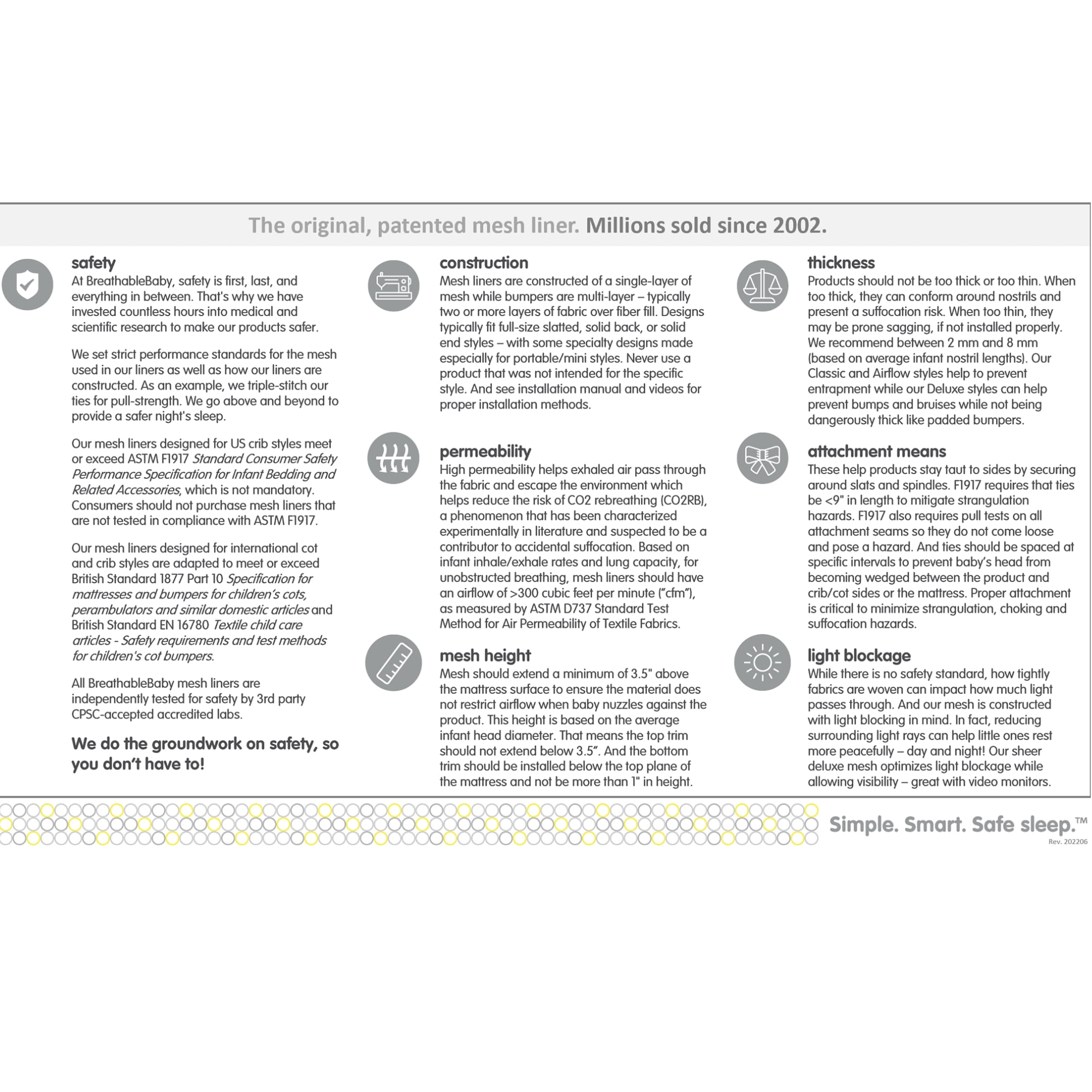 3MM CLASSIC MESH WITH 85% LIGHT BLOCKING RATING: Constructed from 3 mm mesh with A.C.T. Air Channel Technology for unrestricted airflow. 100% polyester. 1″ (2.54 cm) trim on top and bottom. Machine washable. FITS FULL-SIZE STYLES WITH A 52″ x 28″ (132 CM x 71 CM) MATTRESS: Install long 11″ x 111″ (28 cm x 282 cm) and short 11″ x 82″ (28 cm x 208 cm) panels to cover 4 sides or only the long panel to cover 3 sides. Do not use on solid end styles or mini cribs. SAFETY TESTED & TRUSTED: From BreathableBaby, the original breathable mesh liner with millions sold since 2002. Independently tested for safety to comply with ASTM F1917 for infant bedding. Contains no added chemicals, flame retardants or formaldehyde. HELPS KEEP ARMS AND LEGS SAFELY INSIDE WITHOUT THE RISK OF RESTRICTED AIRFLOW: A single layer of breathable mesh allows exhaled air to pass through the fabric and mitigates risks associated with padded “crib bumpers” (banned in the US in 2022). EASY TO INSTALL: Adjusts to fit with hook and loop. Tuck the bottom fabric trim below the top edge of the mattress and secure all fastenings before use. Review instruction manual and installation video or contact customer care for assistance.