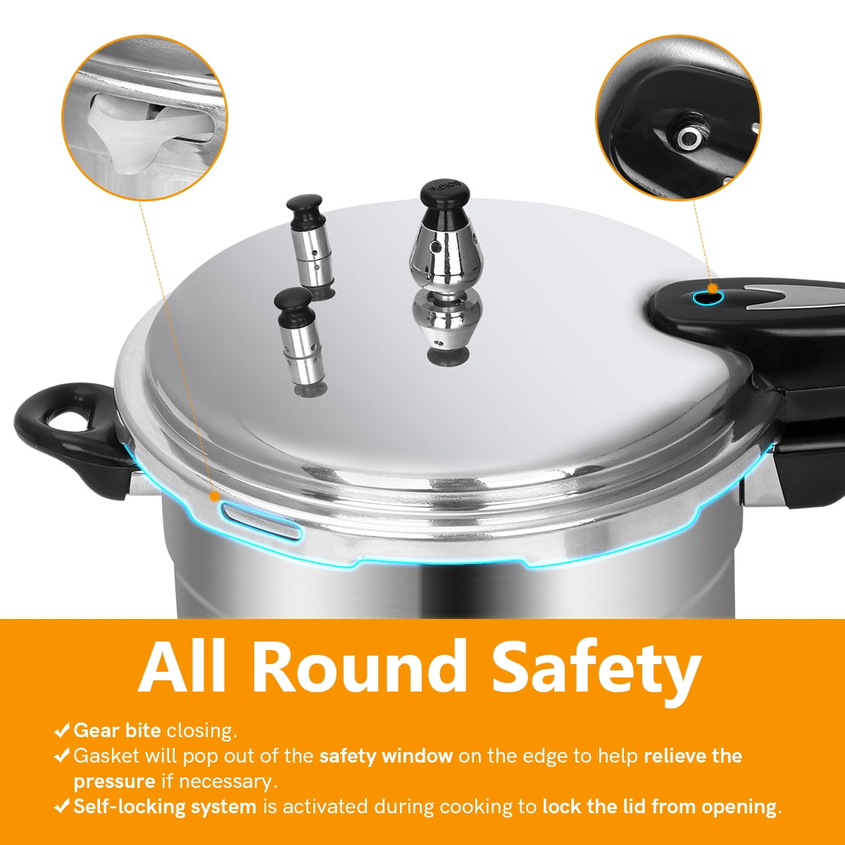 Features: *3 Layers heavy gauge aluminum. *Decent 5.3 quart capacity. *Honeycomb stainless steel base. Induction compatible and gathers heat better. *10 Psi (Exactly 11.6 psi) Pressure weight *Canning rack included for 4+ pin jars canning at a time. *Multiple protections. IN A JIFFY – Constructed with heavy gauge aluminum and honeycomb bottom, this pressure cooker is built to last and will finish your meal 70% faster than the steel ones. STEADY 10 PSI – Triple valves are set on this small pressure cooker to maintain a stable 10 PSI (Exactly 11.6 psi) to raise up to 240℉ and shorten 2/3 cooking time for fine and even pressure cooking and at least 3 pint jars canning simultaneously. INDUCTION COMPATIBLE – The stainless steel clad base makes the aluminum pressure canner available on ALL cooktop including induction stove. Honeycomb structure gathers the heat in every spot evenly for impressive heat conductivity. SAFE TO USE – Balance the pressure by a 10 psi pressure regulator & 2 safety valves. The gasket will pop out through the specially designed safety window to release the pressure if extreme over pressure happens. Self-locking system will lock the handle and lid from rotating during pressure cooking/canning. 5.3 QT CAPACITY – You deserves a fast meal cooking daily in this busy life, held by a decent 5.3 quart capacity on this little pressure cooker. It’s also friendly to those who prefer a small amount of jars canning in a time. Specification: Material: Hard Aluminum Finish: Polished Capacity: 5.3 Quart Pressure Weight: 10 Psi (Exactly 11.6 psi) Depth: 5 1/2″ Diameter: 8 1/4″ Canning Available: Yes. 4+ pint jars at a time w/ included canning rack