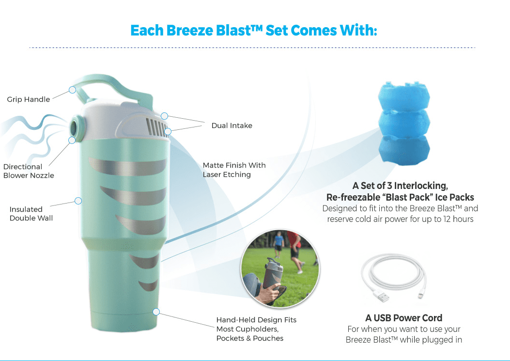 PORTABLE HAND-HELD DESIGN Makes it easy to carry or fit into pockets, backpacks, pouches or cupholders so you can escape the heat on-the-go! Perfect for use at your desk, at the office, while hiking, camping, at the game, at the park, the beach, while exercising, on the job, around the house, in a stroller & much more COLD AIR POWER FOR UP TO 8 HOURS Breeze Blast’s double insulated wall chamber helps keep the Blast Pack Ice Packs frozen, providing cold air power for up to 8 hours or until the unit is powered on. Ice Cubes can also be used in the unit each provides a temporary cool. Blast Packs provide cooling relief for longer than traditional ice FAST & EASY TO USE Just insert batteries or plug in with micro USB, insert Blast Pack Ice Packs or regular ice cubes, and press the power button for a refreshing cool breeze that provides instant relief from the searing heat! COOLS The turbine fans draw in hot air and cools it before blowing it out of the directional blower to relieve you with air as cold as 55 Degrees Fahrenheit. To maximize ice preservation, turn it ON when you need it, and OFF when you do not. 30-Minute Auto Off feature preserves cooling power. Power is maximized when using the micro USB BREEZE BLAST Provides a temporary cool powered by ice. Ice generally delivers 20-40 minutes of refreshing cooling relief depending on the fan speed. The unit has an adjustable eyeball valve to direct the air