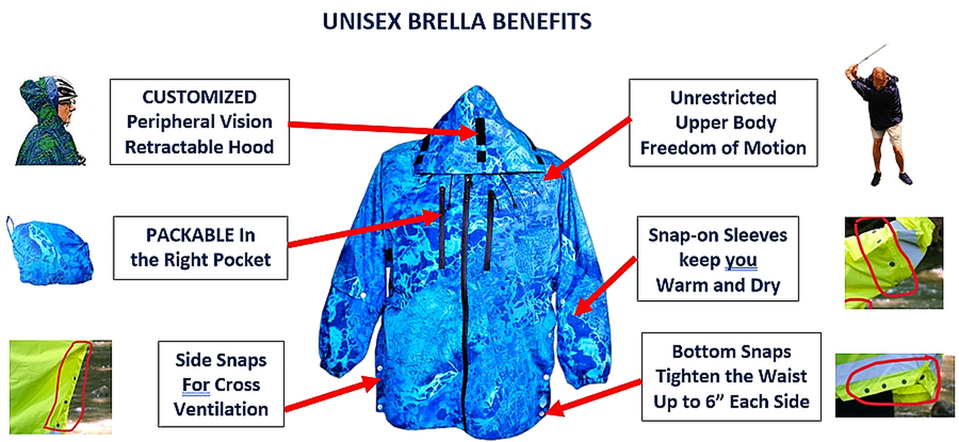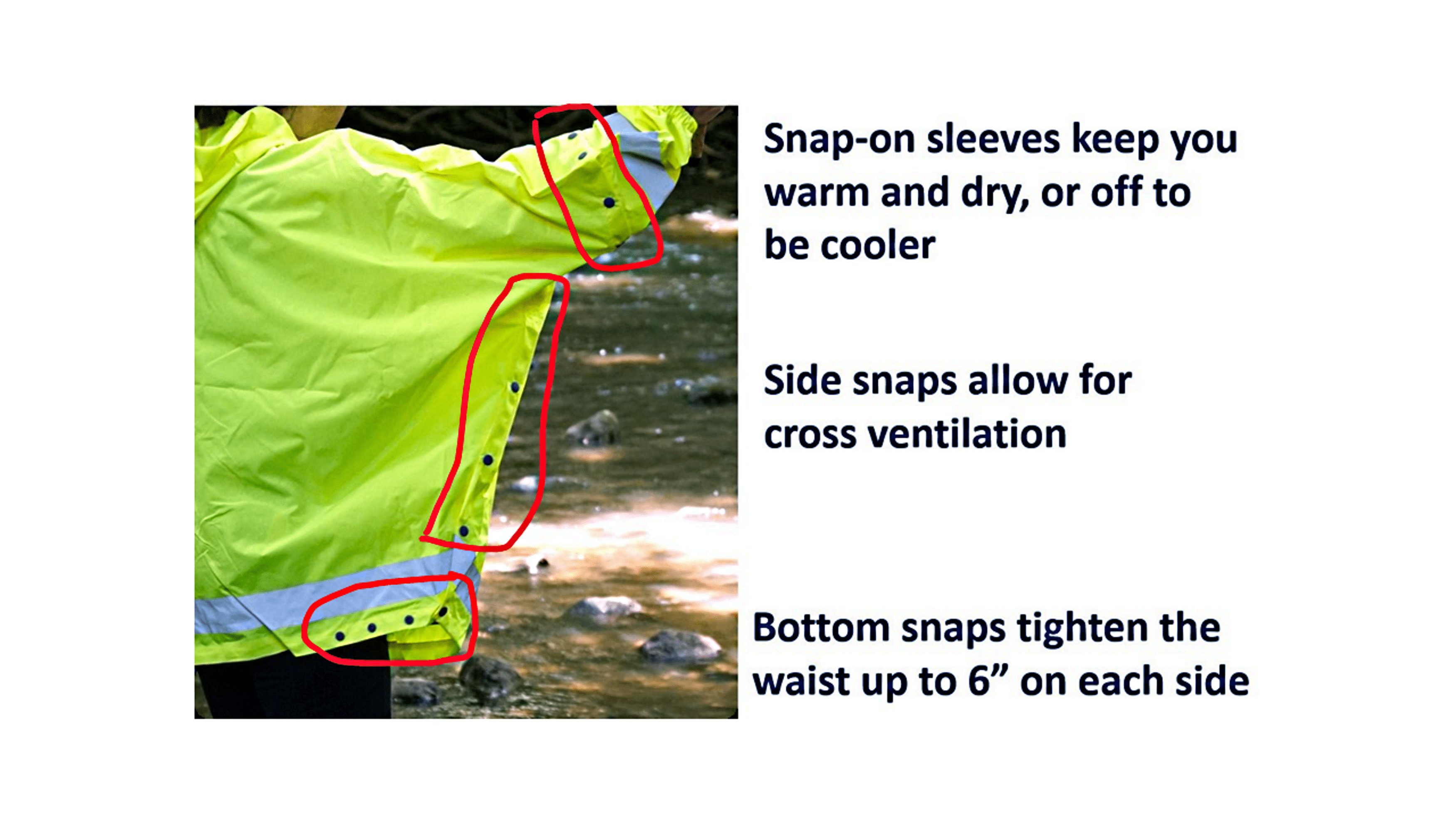 20,000mm waterproof 20,000 breathable 75 dernier polyester, lightweight – 14oz. patented retractable hood for better vision and safety snap-on sleeves to keep you cooler fully taped waterproof seams cross venting system heavy duty YKK waterproof front zipper outside pockets with YKK waterproof zipper closures packable in the pocket Back length: 30 in. Care: wash cold water with mild soap and hang dry Imported