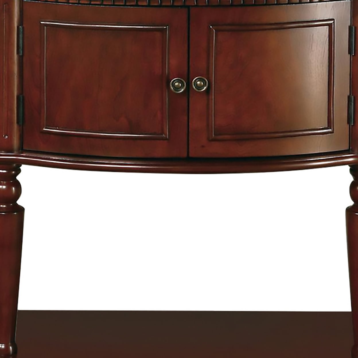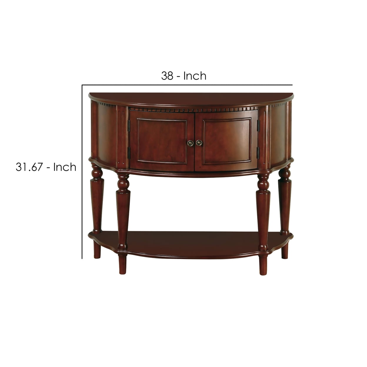Brown Wooden Console Table With Curved Front and Inlay Shelf – Saltoro Sherpi This elaborate console table is a lovely piece to welcome all your guests. A rich brown finish emanates a warmth that is comforting and calming while intricate woodwork details add visual appeal. Four legs are traditional turned and supported by a lower inlay shelf that offers the perfect space for home accents and decorations. Two upper center doors add decoration and storage space while a curved fronts add shape and movement to the table. Fit for both a formal or casual room this entry table is elegant and refined to adorn your home.