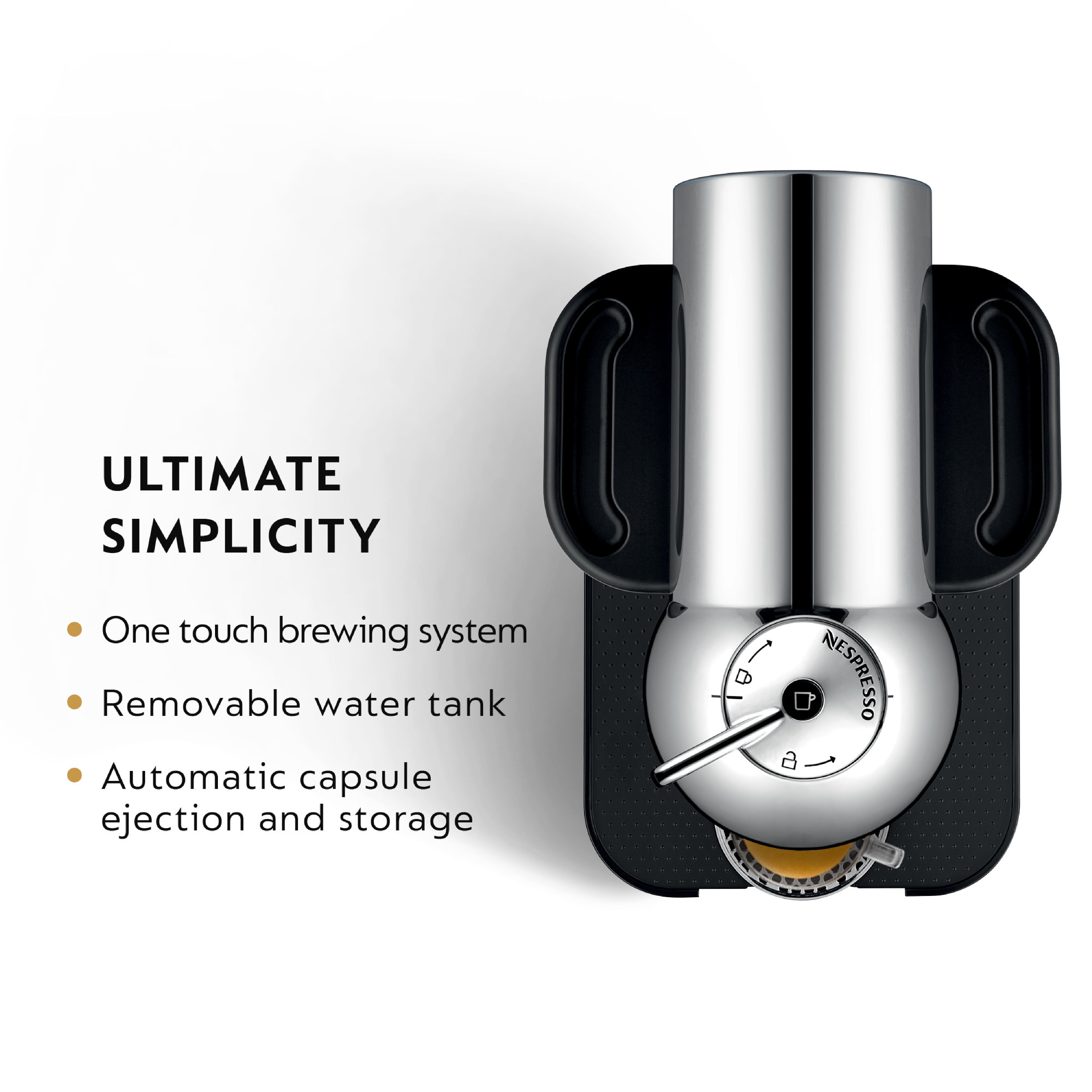Single-serve machine with Centrifusion technology to gently brew both coffee and espresso Designed for Nespresso Vertuo capsules 12-capsule tasting pack includes 4 espresso capsules and 8 regular coffee capsules Simple and convenient 1 button operation Two capsule sizes: a large one for coffee and a small one for espresso Capsule recognition and code reading technology for blend-specific parametric brewing Adjustable drip tray with 4 positions to accommodate tall recipe glasses and travel mugs Easy insertion and ejection of capsules (holds 17 used capsules) Removable water tank: 54 oz Fast heating time: 15-20 seconds Automatic power off after 9 minutes Descaling alert Color: Chrome Buyer’s Note: Capsules are sold by Nespresso directly to consumers via the Nespresso Club