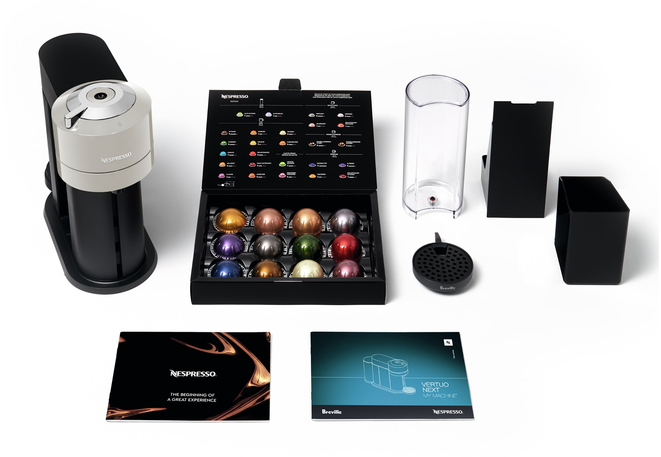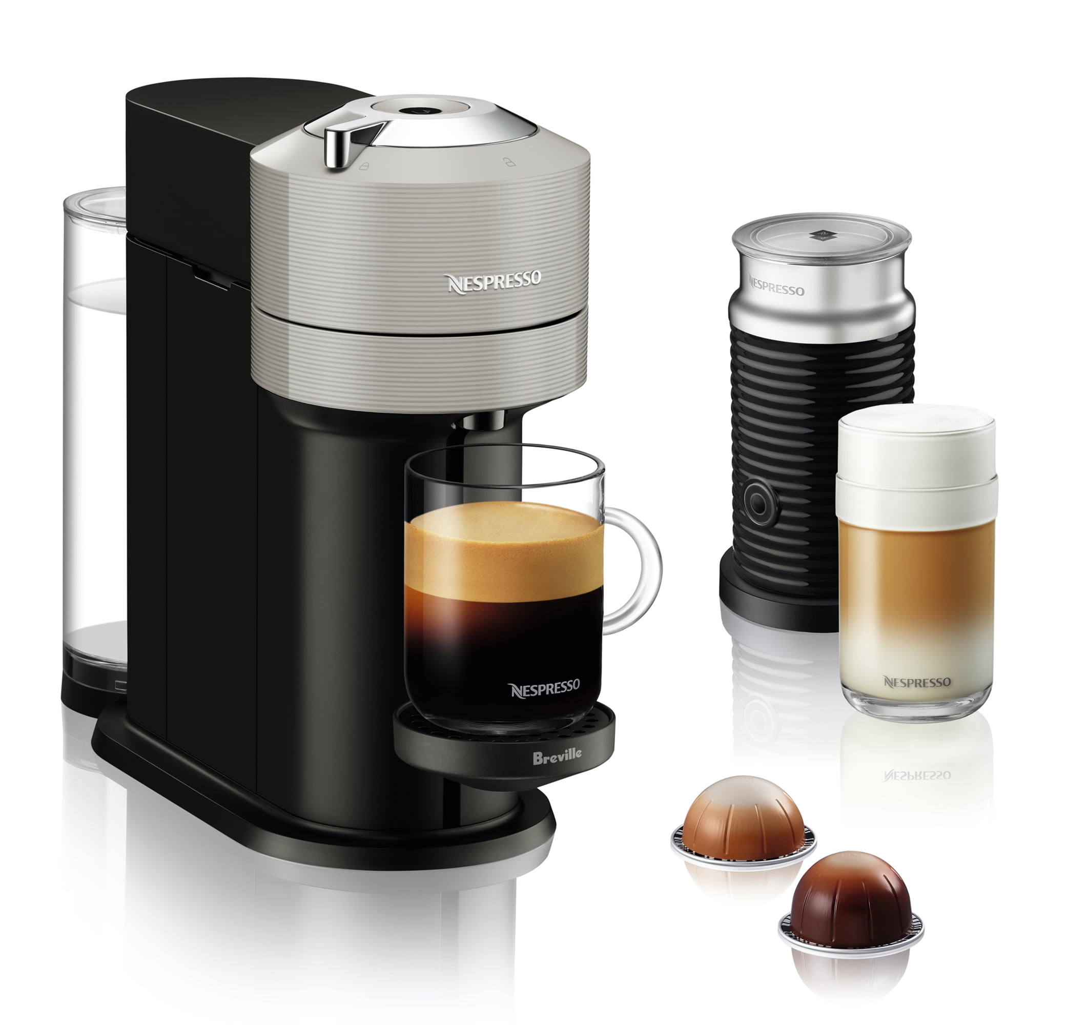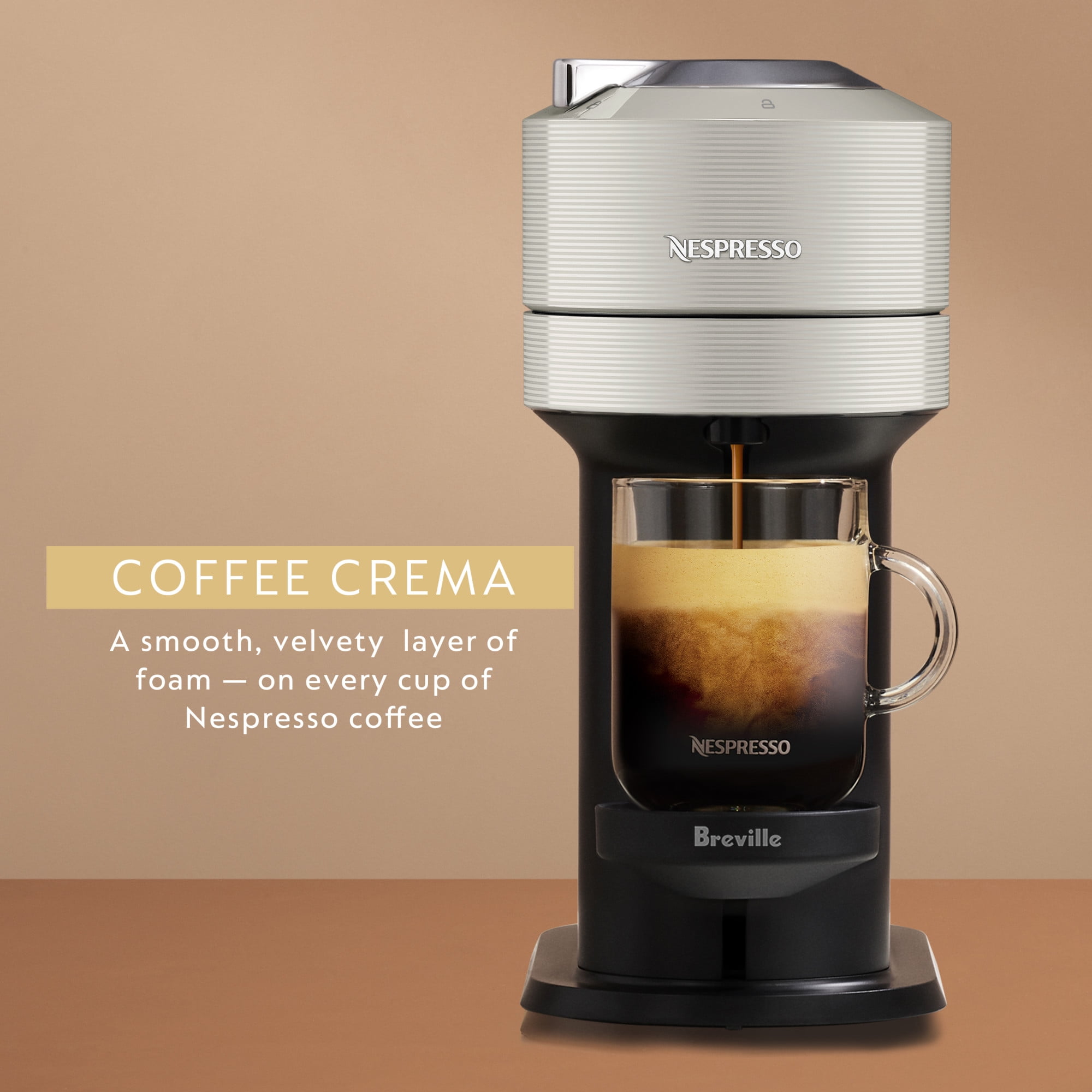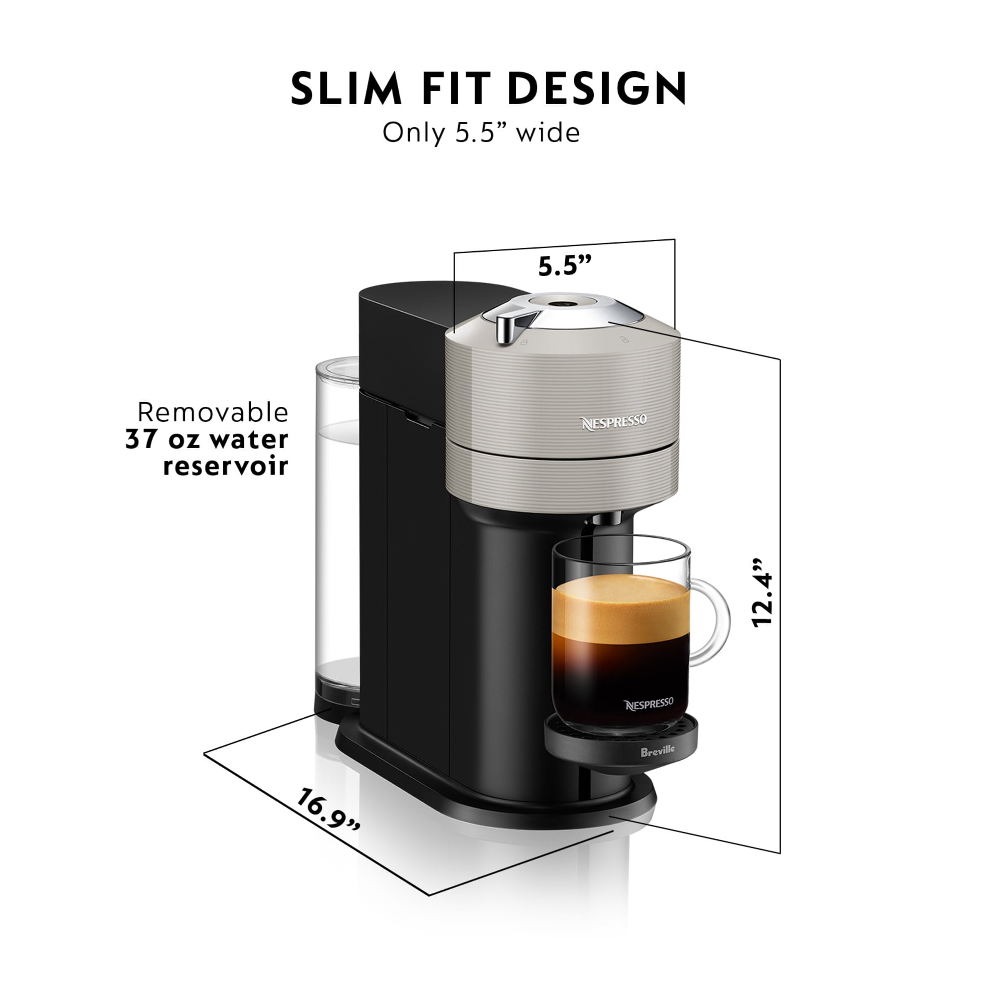 Vertuo Next Coffee and Espresso Maker in Light Gray Single-serve machine with Centrifusion technology to gently brew both coffee and espresso – assures perfect output every time Designed for Nespresso Vertuo capsules with simple and convenient 1-button operation Two capsule sizes: a small one for espresso and a large one for coffee – includes 12-capsule tasting pack with 4 espresso capsules and 8 coffee capsules Capsule recognition and code reading technology for blend-specific parametric brewing Automatically adapts brewing parameters to each capsule – cup size, pressure, temperature, and brewing time 5 factory presets but cup sizes may also be programmed from 0.7 to 17 ounces: Alto (14 oz.), Mug (8 oz.), Gran Lungo (5 oz.), Double Espresso (2.7 oz.), and Espresso (1.35 oz.) Adjustable drip tray with 3 positions is removable to accommodate tall recipe glasses and travel mugs Motorized brew head for easier capsule insertion and automatic capsule ejection (holds up to 10 used capsules)