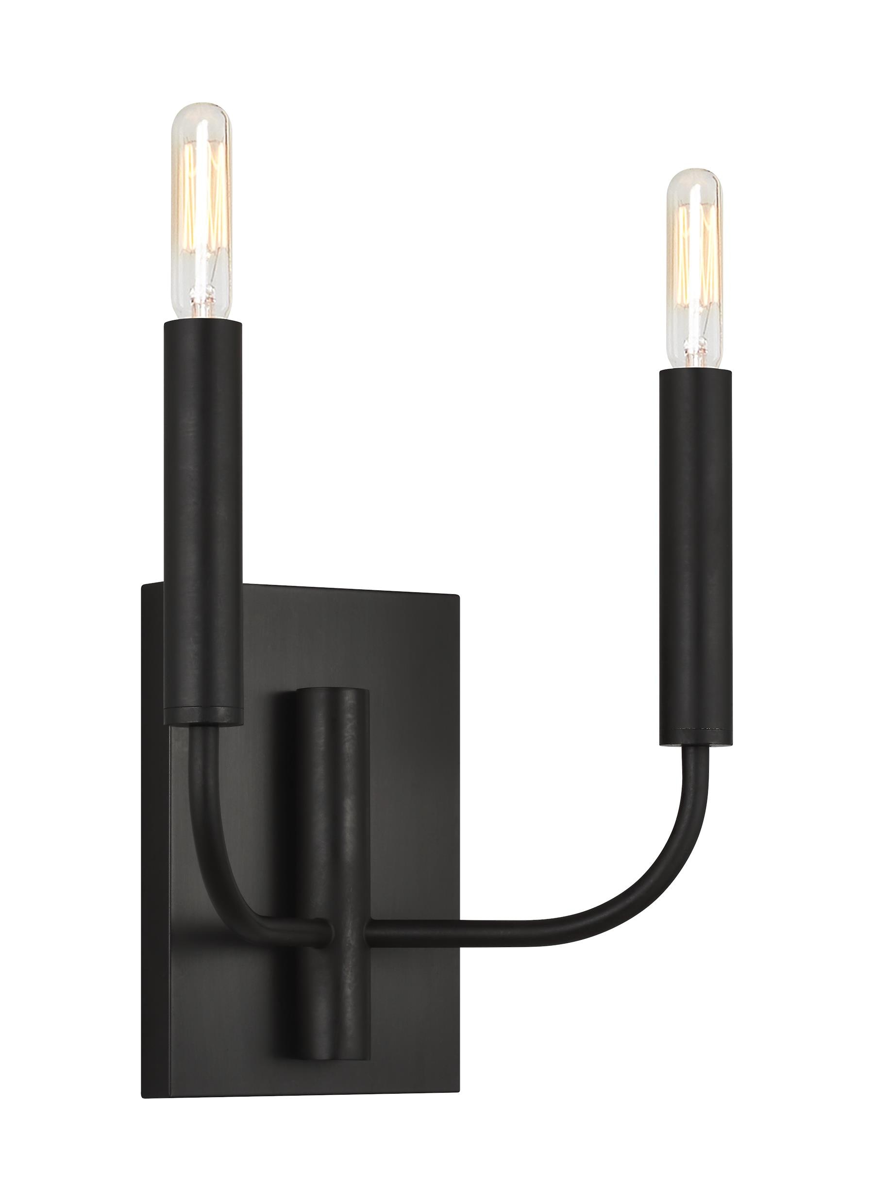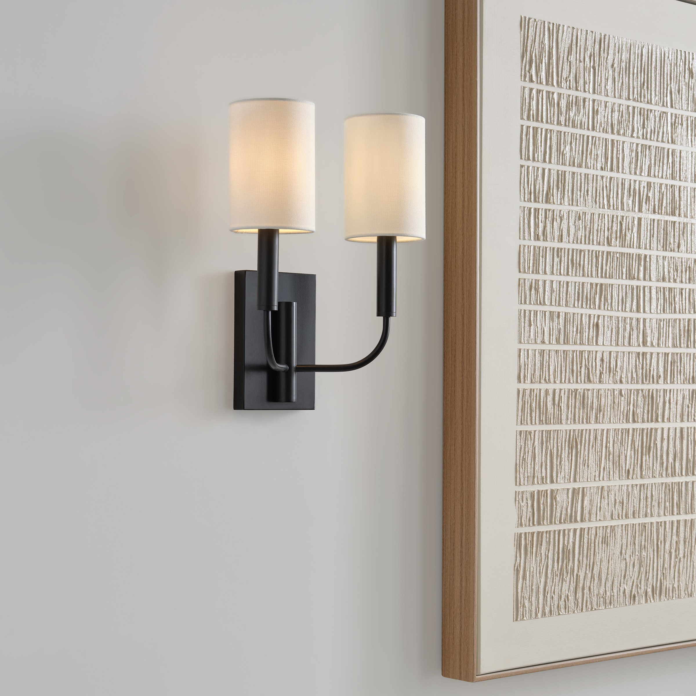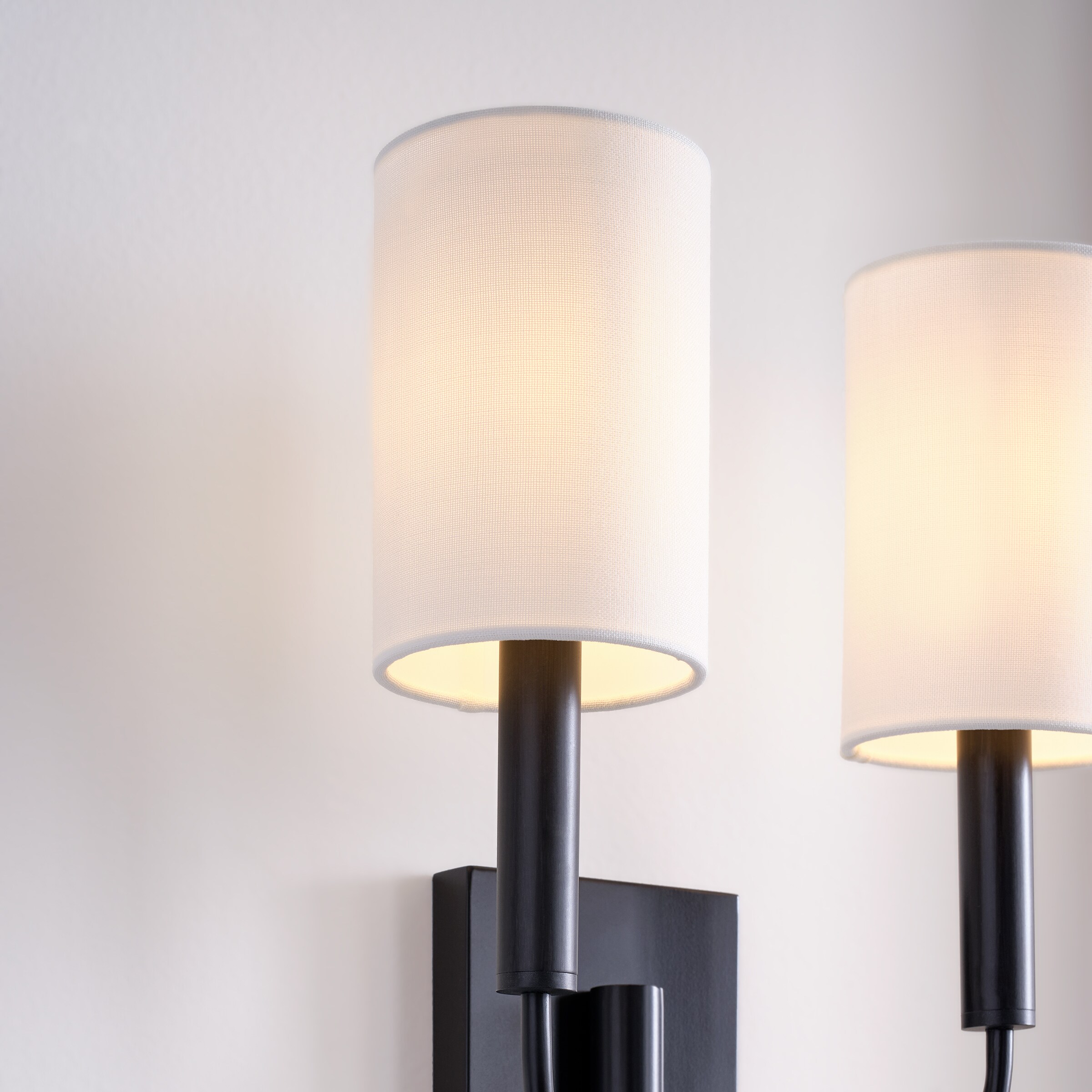 The Brianna two light wall sconce in aged iron offers shadow-free lighting in your powder room, spa, or master bath room. Brianna’s graceful, seamless curvature and elongated tubular arms lend fluidity and modern appeal to this classic minimalist silhouette. Available in rich, gilded Burnished Brass and the more contemporary Polished Nickel finish. Brianna wall sconces include cylindrical shades in fresh White Linen.