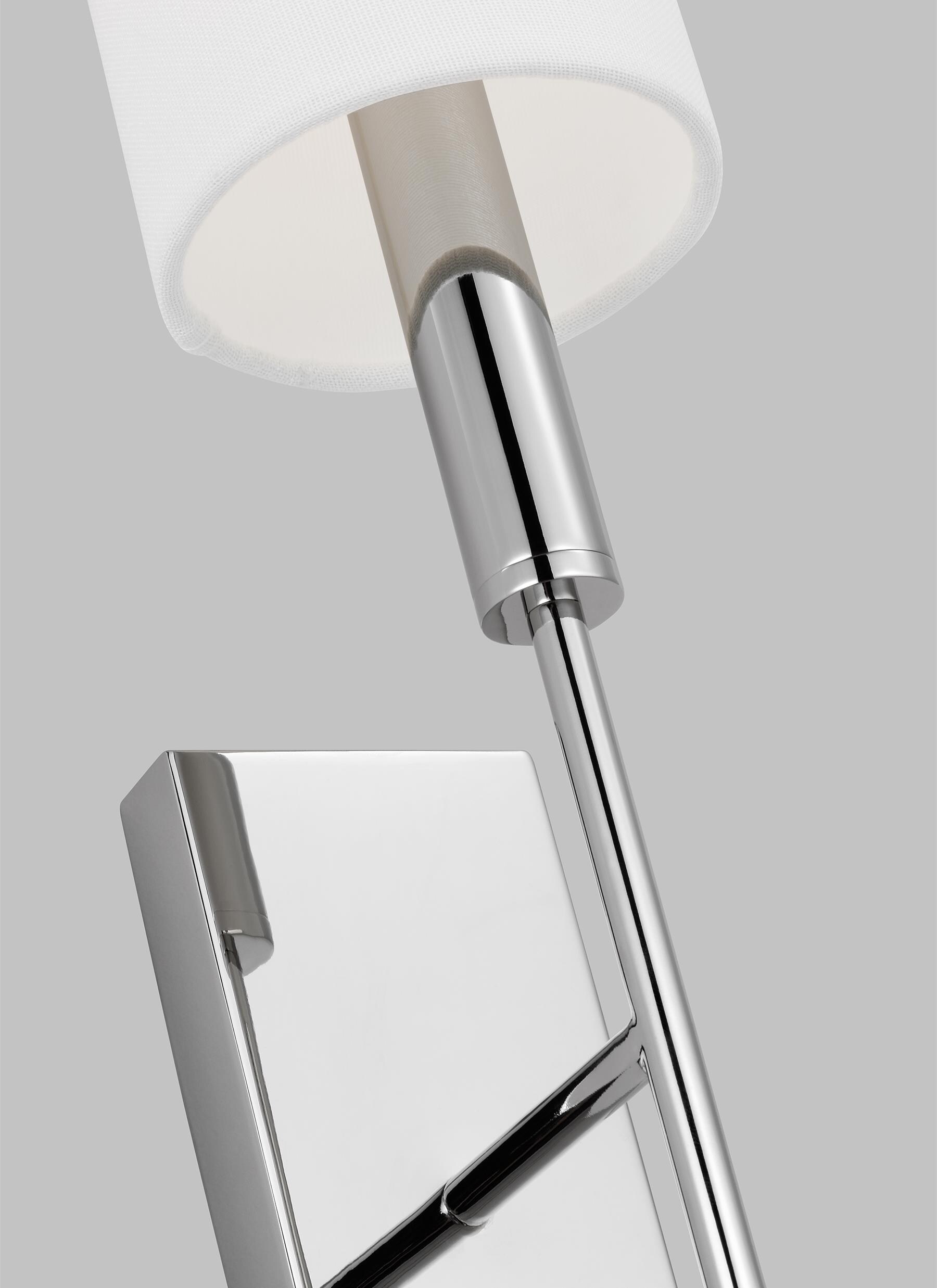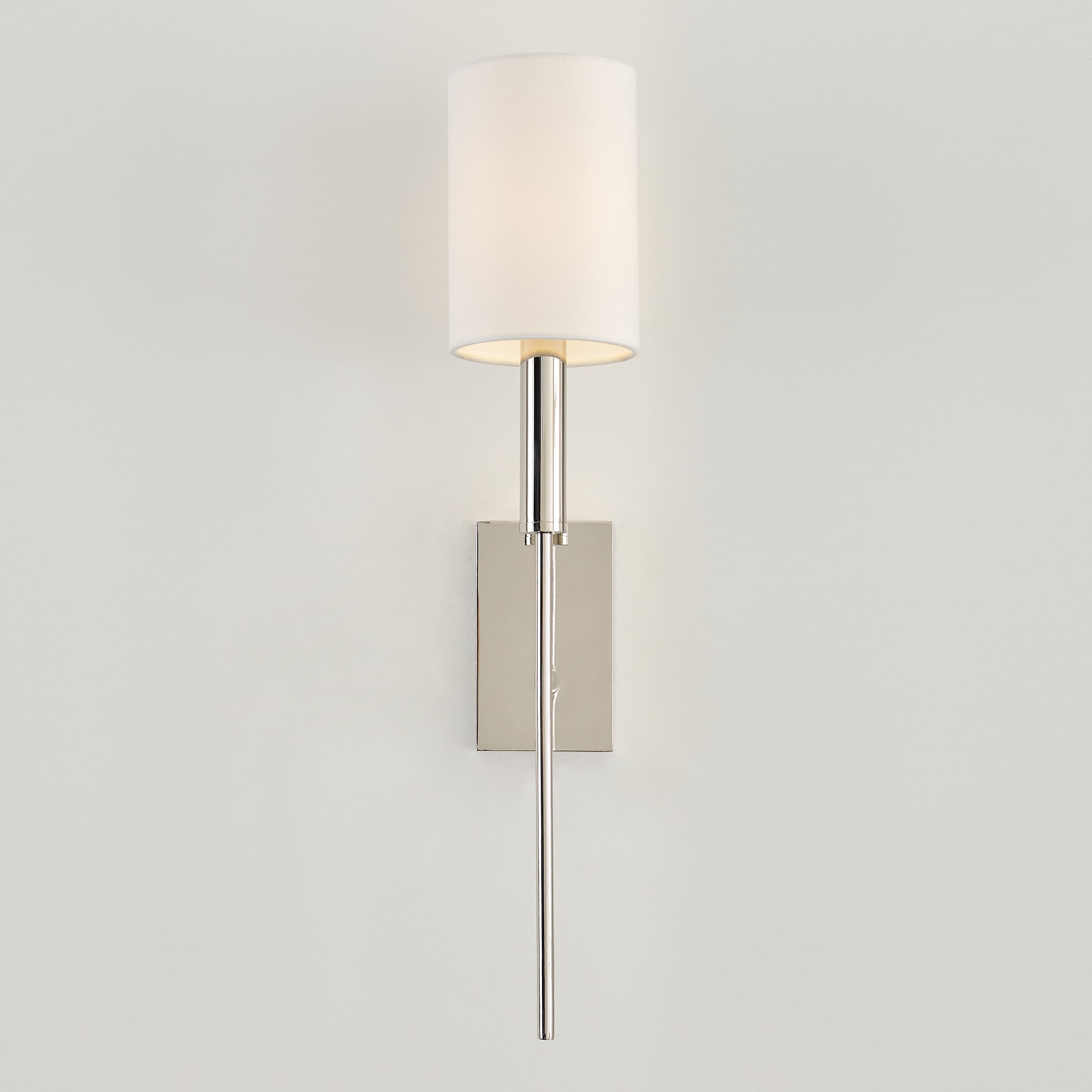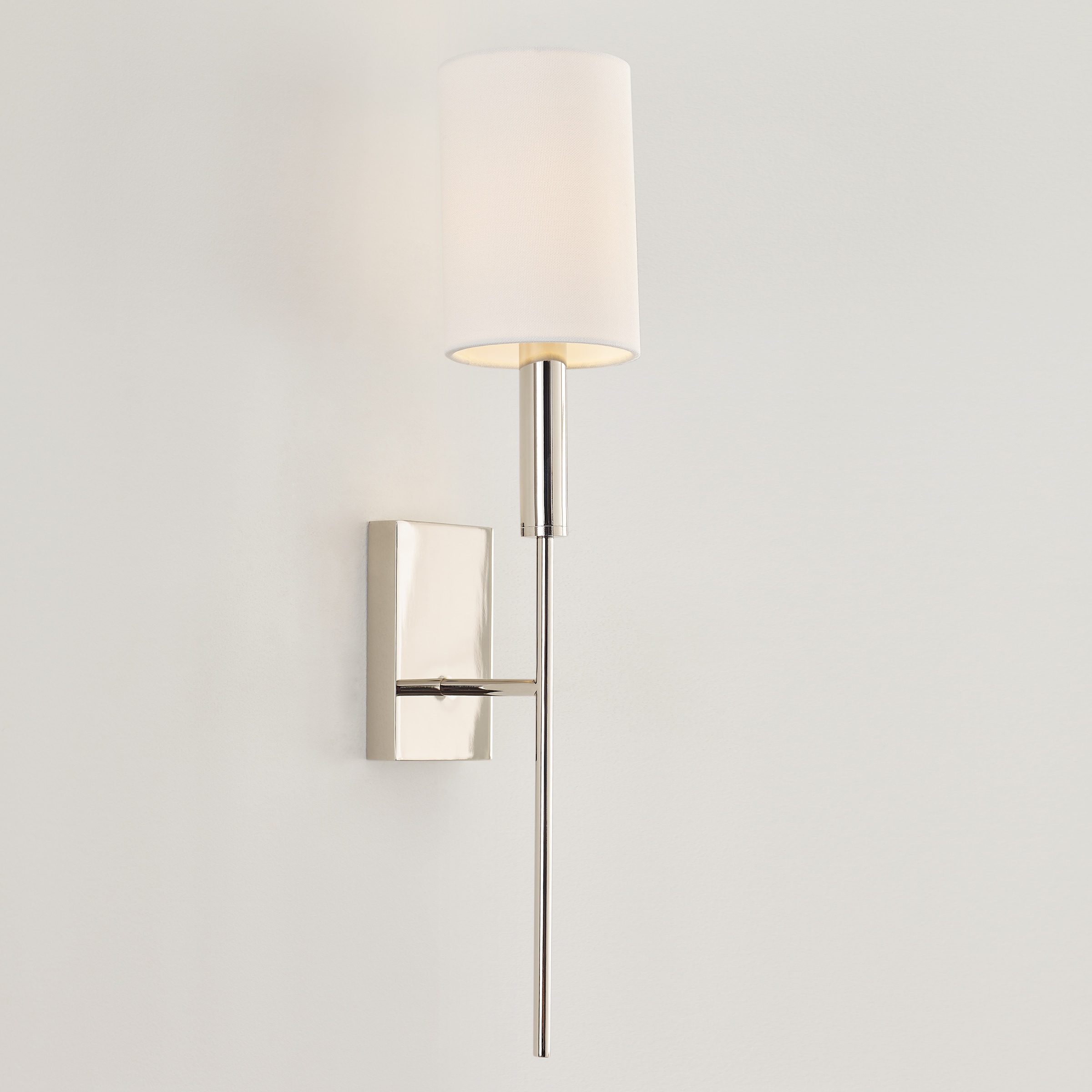 The Brianna one light wall sconce by Ellen DeGeneres in Polished Nickel offers shadow-free lighting in your powder room, spa, or master bath room. Brianna’s graceful, seamless curvature and elongated tubular arms lend fluidity and modern appeal to this classic minimalist silhouette. Available in rich Aged Iron, Burnished Brass and Polished Nickel finish. Brianna wall sconces include cylindrical shades in fresh White Linen. We are expanding this top selling series by Ellen DeGeneres to include a tail sconce in three finishes.