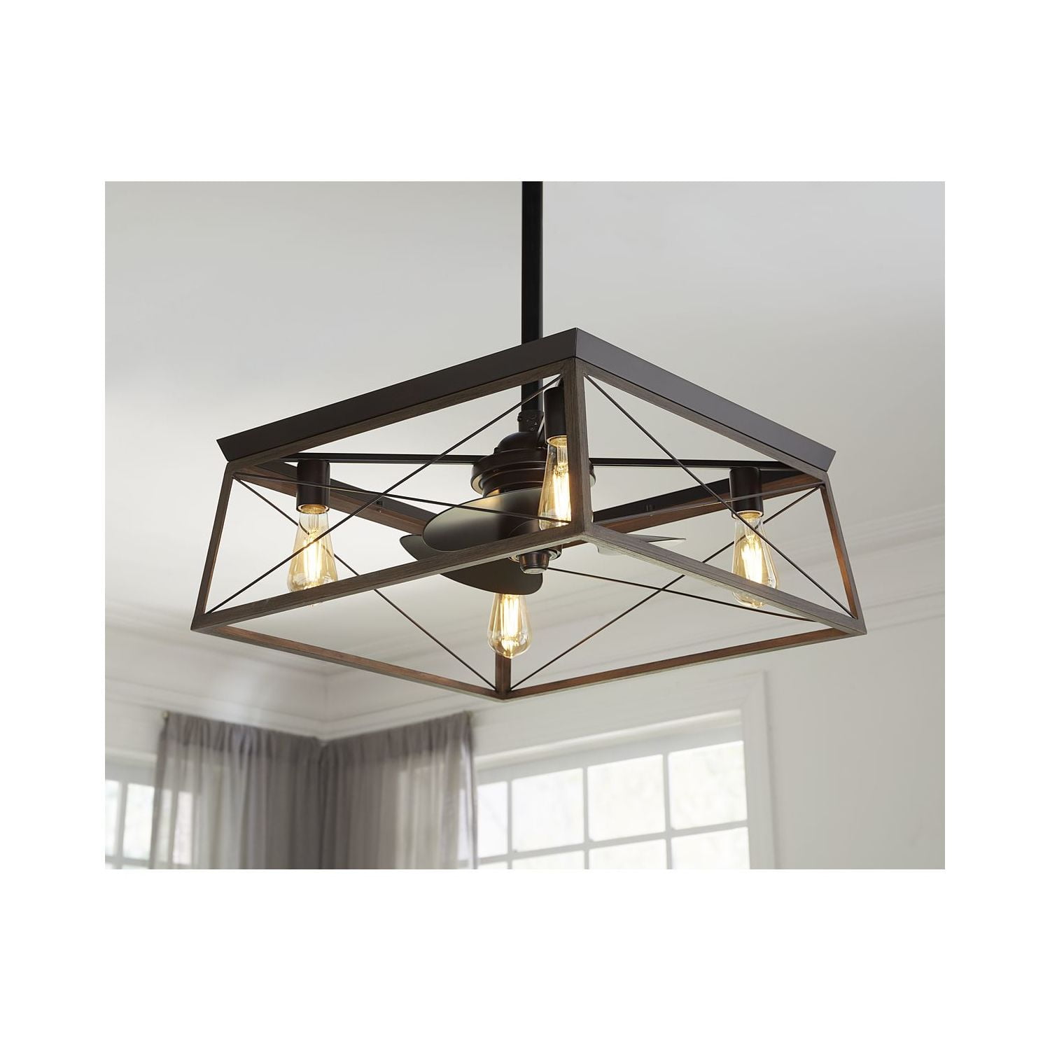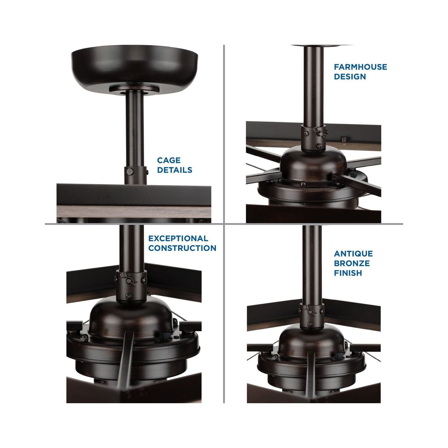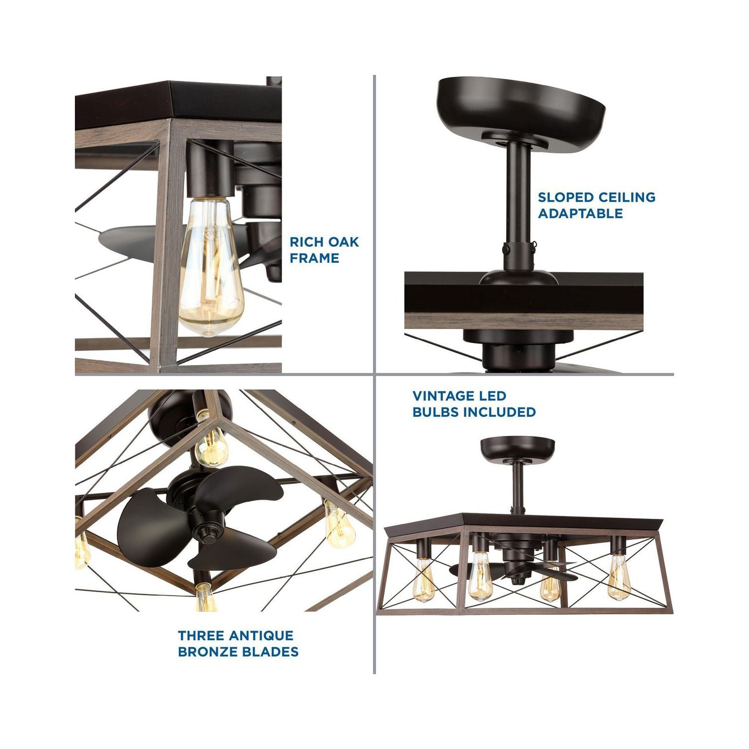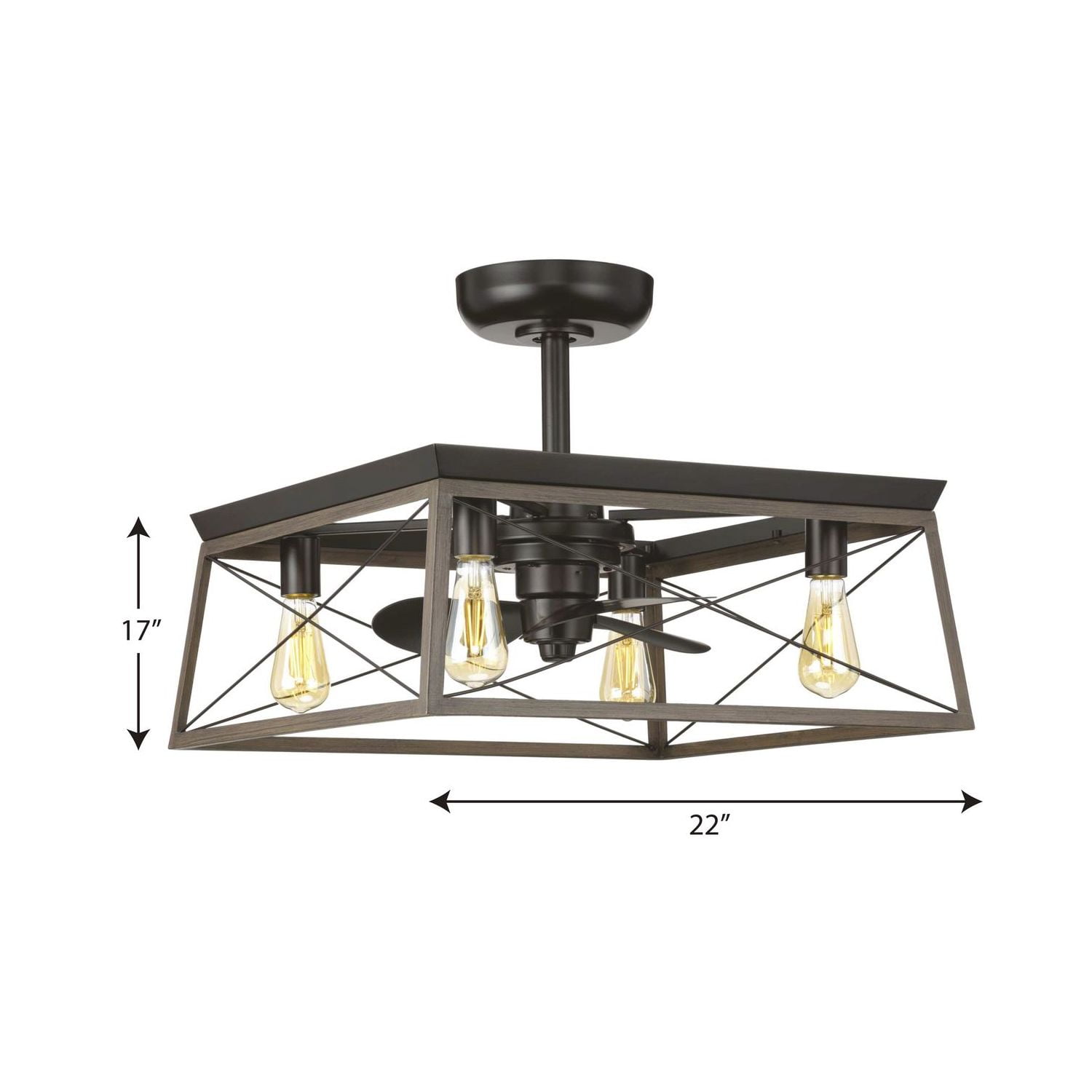 APPLICATION: Ideal for any great room, bedroom, living room, or bonus room. STYLES: Perfect for farmhouse, rustic, and coastal style settings. BLADES: 3 blades coated with an antique bronze finish rotate within the rich oak open-frame design that boasts a classic cross-brace pattern. DIMENSIONS: Measures 22-inch diameter by 17-inch height. A 1-inch x 6-inch downrod is included. Longer accessory downrods can be ordered separately REMOTE CONTROL/CANOPY: A 3-speed remote control with batteries is included so you can adjust full-range dimming and fan speed without breaking a sweat. Dual mount canopy that accommodates flat or sloped ceilings (sloped -22 degrees). BULBS: Includes 4 medium base Vintage bulbs, each 5.5 W LED, 2200 color temp, 500 lumens, 80CRI, dimmable. MOTOR: Experience energy-efficient savings with the fan’s cutting-edge AC motor. CERTIFICATIONS: Title 20, cETLus, and Damp Location Listed. PAIRS WITH: Pairs with a variety of Progress Lighting fixtures. WARRANTY: Our Limited Lifetime Warranty ensures your complete satisfaction with your purchase and we offer professional after-sales customer service support.