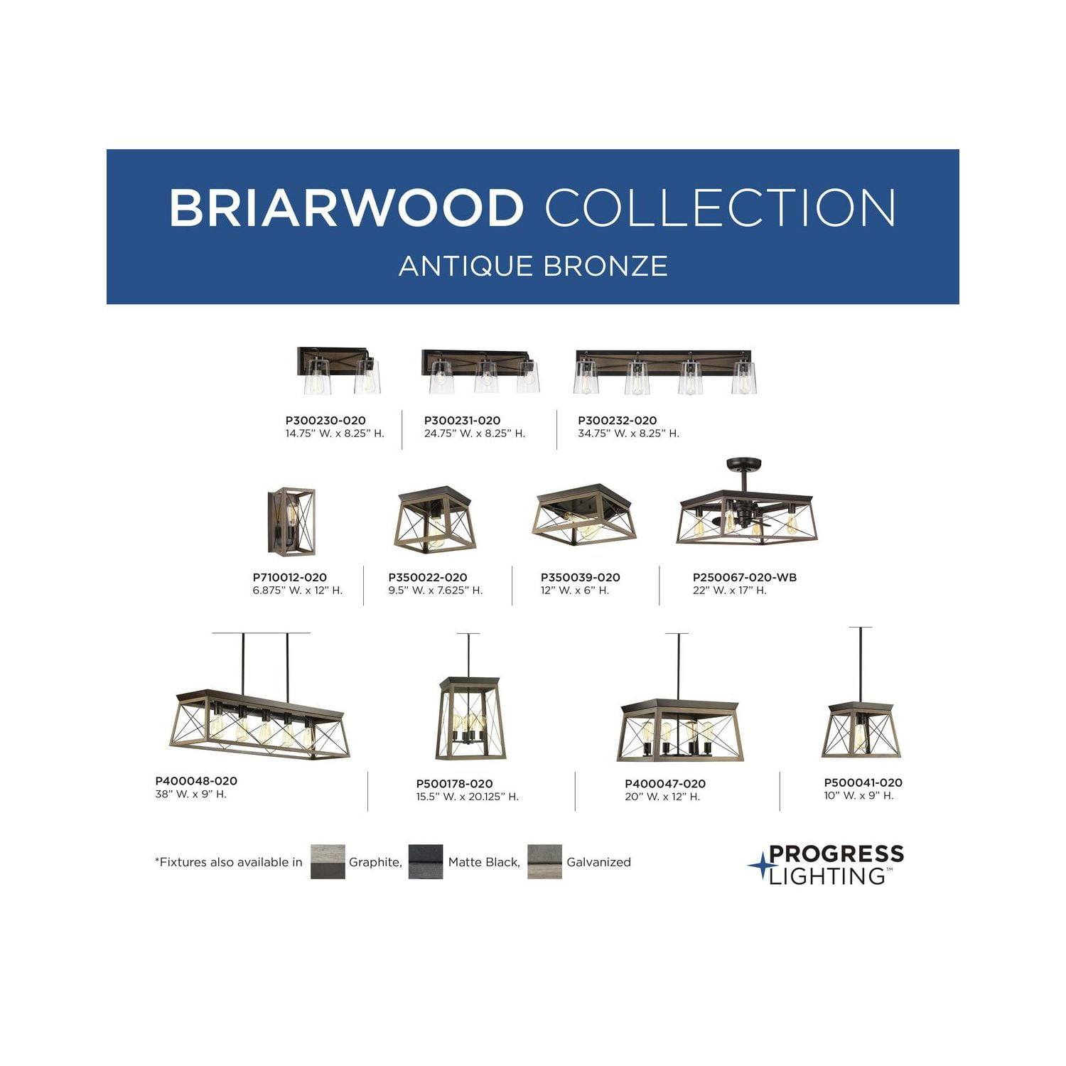 Create a cozy and comfortable home atmosphere with the Briarwood Collection 22-Inch 3-Blade Antique Bronze Indoor/Outdoor AC Motor Farmhouse Ceiling Fan ideal for any great room, bedroom, living room, or bonus room. Perfect for farmhouse, rustic, and coastal style settings. 3 blades coated with an antique bronze finish rotate within the rich oak open-frame design that boasts a classic cross-brace pattern. Measures 22-inch diameter by 17-inch height. A 1-inch x 6-inch downrod is included. Longer accessory downrods can be ordered separately. A 3-speed remote control with batteries is included so you can adjust full-range dimming and fan speed without breaking a sweat. Dual mount canopy that accommodates flat or sloped ceilings (sloped -22 degrees). Includes 4 medium base Vintage bulbs, each 5.5 W LED, 2200 color temp, 500 lumens, 80CRI, dimmable. Experience energy-efficient savings with the fan’s cutting-edge AC motor. Certifications: Title 20, cETLus, and Damp Location Listed. Pairs with a variety of Progress Lighting fixtures. Our Limited Lifetime Warranty ensures your complete satisfaction with your purchase and we offer professional after-sales customer service support. It’s time to breathe new life into the mundane every day with timeless and truly transformative lighting. Make your purchase today to begin your journey to a whole new lighting experience. Progress Lighting products are designed for exceptional quality, reliability, and functionality.