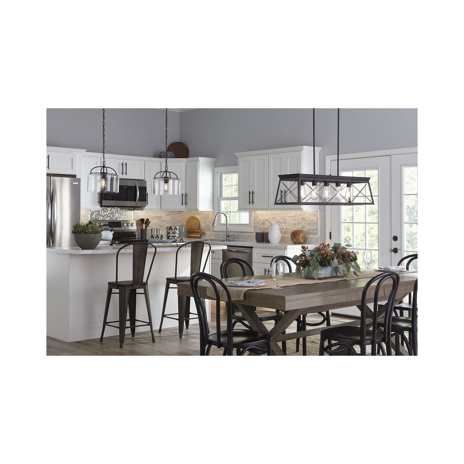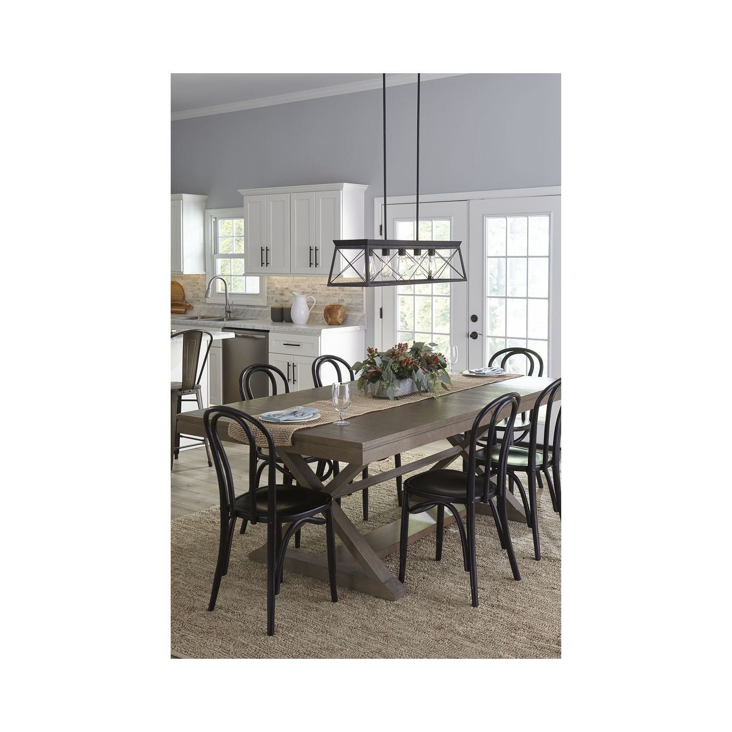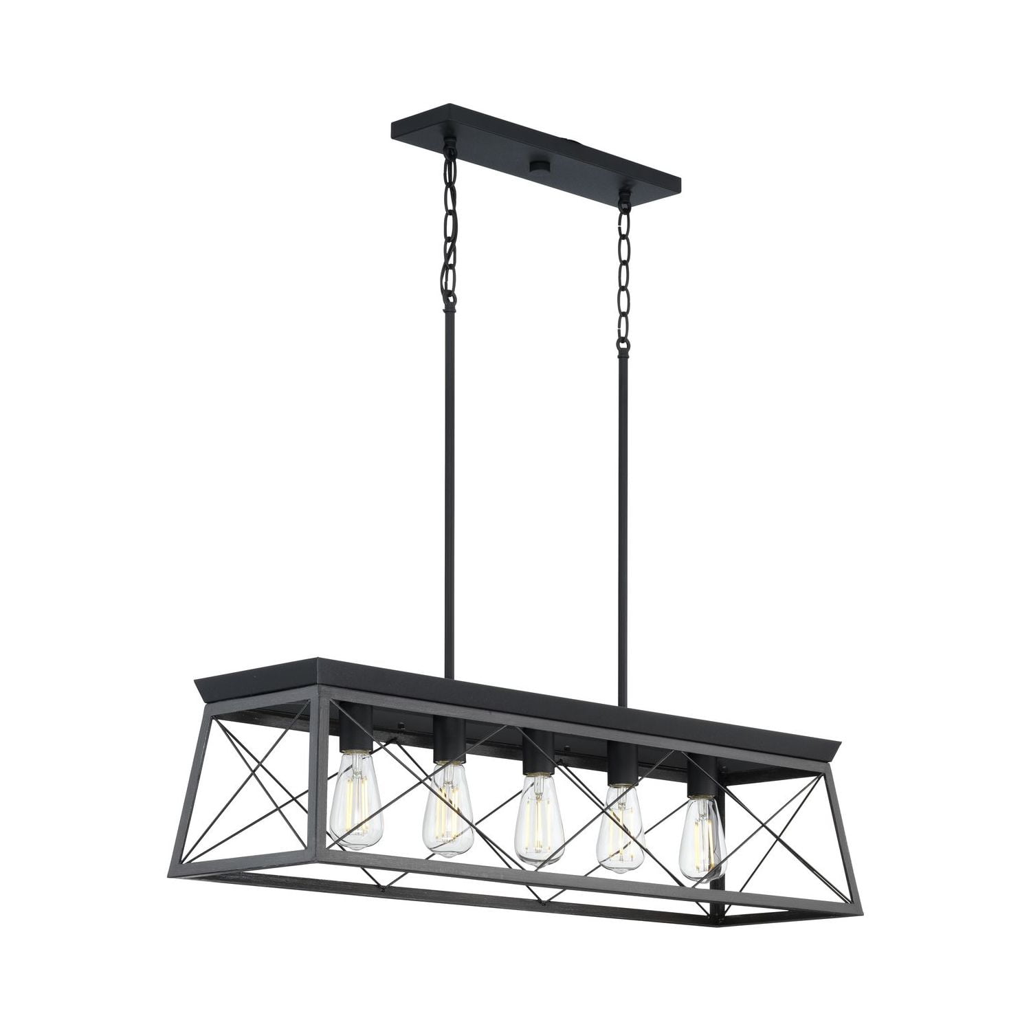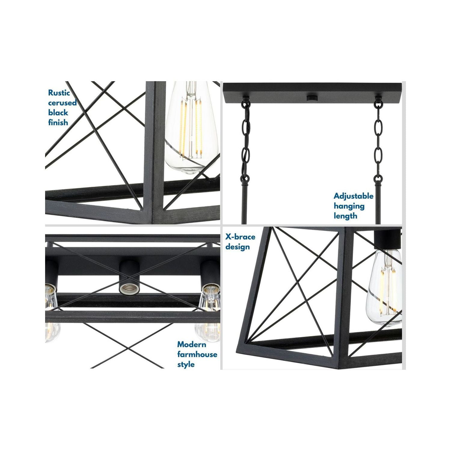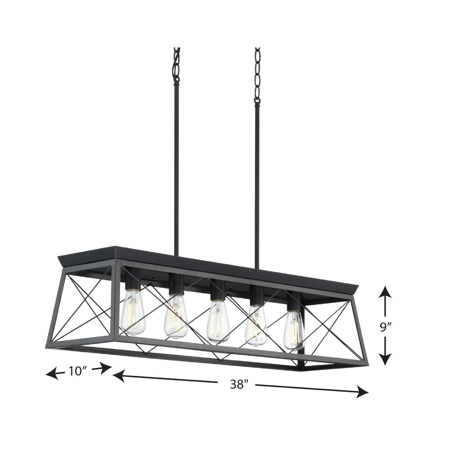 Application: Ideal for any kitchen island or dining room table. Style: Perfect for coastal or farmhouse style settings. Finish: A faux-wood frame coated in a rustic ceruse black finish accented by a black plate on top of the structure infuses the chandelier with charming country character. Materials: Constructed from steel to ensure a long product lifespan. Glass/Shades: Light sources exude a comforting country glow as they peek through the classic X-brace design reminiscent of country barn doors and rustic farmhouse gates. Bulbs: For ideal illumination, use 5 medium base bulbs that are sold separately (100w max – LED/CFL/incandescent). Compatible with dimmable bulbs. Dimensions: Measures 38-inch width by 9-inch height by 75-inch length (installed). Certifications: cULus dry location listed. Pairs With: Pairs with Progress Lighting fixtures from the Durrell and Hemsworth collections. Warranty: Our 1-Year Limited Warranty guarantees your complete satisfaction with your purchase and includes professional after-sales customer service support. Make your purchase today to breathe new life into your lighting design!