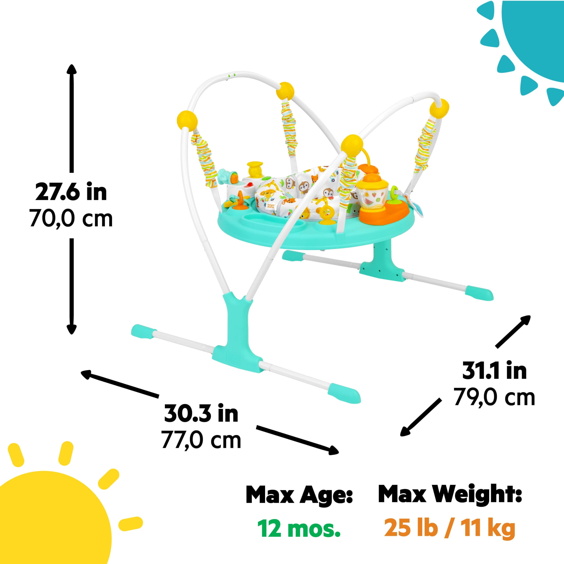 Jump into babyÕs first kitchen with the Cooking Up Fun Activity Jumper from Bright Starts; introduce cause & effect learning and imaginative role play from an early age 4 food-themed toy stations: press & toggle chef station with music, lights and cooking sounds; blend & serve smoothie station with spinning blender and crinkle cup; veggie stacking sandwich activity; textured banana toy Seat rotates 360¡ for easy access to all the activities while unisex infant baby jumps and plays; machine washable seat pad is easy to remove; wipe toys clean with mild soap and water Power the music and lights with 3 AA batteries; 3 height adjustments grow with baby; ideal for ages 6-12 months or up to 25 pounds This activity jumper makes a great baby shower gift idea; small footprint with assembled dimensions 30.1Ó x 32.4Ó x 27.2″